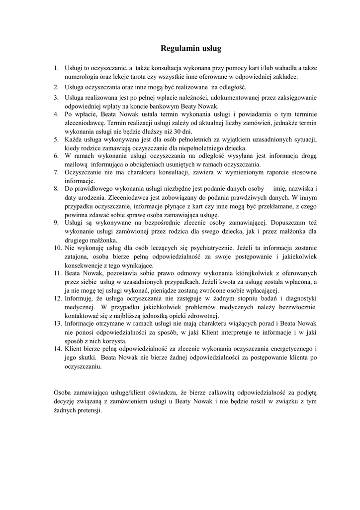 Regulamin usług 1. Usługi to oczyszczanie, a także konsultacja wykonana przy pomocy kart i/lub wahadła a także numerologia oraz lekcje tarota czy wszystkie inne oferowane w odpowiedniej zakładce. 2. Usługa oczyszczania oraz inne mogą być realizowane na odległość. 3. Usługa realizowana jest po pełnej wpłacie należności, udokumentowanej przez zaksięgowanie odpowiedniej wpłaty na koncie bankowym Beaty Nowak. 4. Po wpłacie, Beata Nowak ustala termin wykonania usługi i powiadamia o tym terminie zleceniodawcę. Termin realizacji usługi zależy od aktualnej liczby zamówień, jednakże termin wykonania usługi nie będzie dłuższy niż 30 dni. 5. Każda usługa wykonywana jest dla osób pełnoletnich za wyjątkiem uzasadnionych sytuacji, kiedy rodzice zamawiają oczyszczanie dla niepełnoletniego dziecka. 6. W ramach wykonania usługi oczyszczania na odległość wysyłana jest informacja drogą mailową informująca o obciążeniach usuniętych w ramach oczyszczania. 7. Oczyszczanie nie ma charakteru konsultacji, zawiera w wymienionym raporcie stosowne informacje. 8. Do prawidłowego wykonania usługi niezbędne jest podanie danych osoby – imię, nazwiska i daty urodzenia. Zleceniodawca jest zobowiązany do podania prawdziwych danych. W innym przypadku oczyszczanie, informacje płynące z kart czy inne mogą być przekłamane, z czego powinna zdawać sobie sprawę osoba zamawiająca usługę. 9. Usługi są wykonywane na bezpośrednie zlecenie osoby zamawiającej. Dopuszczam też wykonanie usługi zamówionej przez rodzica dla swego dziecka, jak i przez małżonka dla drugiego małżonka. 10. Nie wykonuję usług dla osób leczących się psychiatrycznie. Jeżeli ta informacja zostanie zatajona, osoba bierze pełną odpowiedzialność za swoje postępowanie i jakiekolwiek konsekwencje z tego wynikające. 11. Beata Nowak, pozostawia sobie prawo odmowy wykonania którejkolwiek z oferowanych przez siebie usług w uzasadnionych przypadkach. Jeżeli kwota za usługę została wpłacona, a ja nie mogę tej usługi wykonać, pieniądze zostaną zwrócone osobie wpłacającej. 12. Informuję, że usługa oczyszczania nie zastępuje w żadnym stopniu badań i diagnostyki medycznej. W przypadku jakichkolwiek problemów medycznych należy bezzwłocznie kontaktować się z najbliższą jednostką opieki zdrowotnej. 13. Informacje otrzymane w ramach usługi nie mają charakteru wiążących porad i Beata Nowak nie ponosi odpowiedzialności za sposób, w jaki Klient interpretuje te informacje i w jaki sposób z nich korzysta. 14. Klient bierze pełną odpowiedzialność za zlecenie wykonania oczyszczania energetycznego i jego skutki. Beata Nowak nie bierze żadnej odpowiedzialności za postępowanie klienta po oczyszczaniu. Osoba zamawiająca usługę/klient oświadcza, że bierze całkowitą odpowiedzialność za podjętą decyzję związaną z zamówieniem usługi u Beaty Nowak i nie będzie rościł w związku z tym żadnych pretensji.
