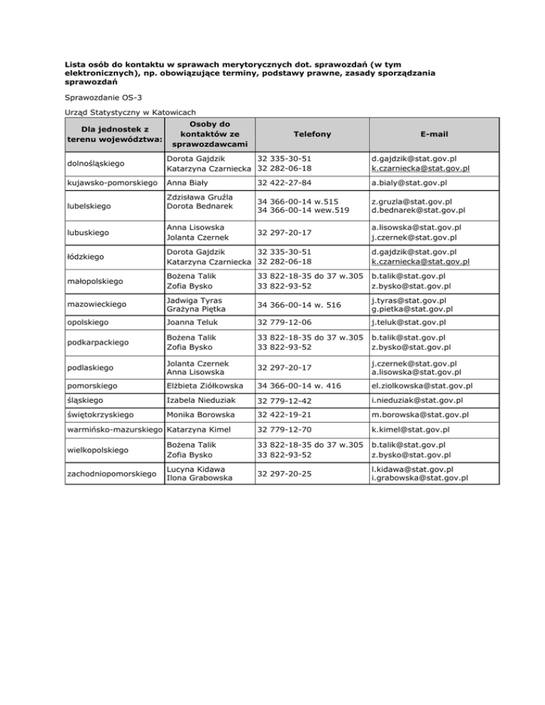 Lista osób do kontaktu w sprawach merytorycznych dot. sprawozdań (w tym elektronicznych), np. obowiązujące terminy, podstawy prawne, zasady sporządzania sprawozdań Sprawozdanie OS-3 Urząd Statystyczny w Katowicach Dla jednostek z terenu województwa: Osoby do kontaktów ze sprawozdawcami Telefony E-mail dolnośląskiego 32 335-30-51 Dorota Gajdzik Katarzyna Czarniecka 32 282-06-18 [email protected] [email protected] kujawsko-pomorskiego Anna Biały 32 422-27-84 [email protected] lubelskiego Zdzisława Gruźla Dorota Bednarek 34 366-00-14 w.515 34 366-00-14 wew.519 [email protected] [email protected] 32 297-20-17 [email protected] [email protected] lubuskiego Anna Lisowska Jolanta Czernek łódzkiego 32 335-30-51 Dorota Gajdzik Katarzyna Czarniecka 32 282-06-18 [email protected] [email protected] małopolskiego Bożena Talik Zofia Bysko 33 822-18-35 do 37 w.305 33 822-93-52 [email protected] [email protected] mazowieckiego Jadwiga Tyras Grażyna Piętka 34 366-00-14 w. 516 [email protected] [email protected] opolskiego Joanna Teluk 32 779-12-06 [email protected] podkarpackiego Bożena Talik Zofia Bysko 33 822-18-35 do 37 w.305 33 822-93-52 [email protected] [email protected] podlaskiego Jolanta Czernek Anna Lisowska 32 297-20-17 [email protected] [email protected] pomorskiego Elżbieta Ziółkowska 34 366-00-14 w. 416 [email protected] śląskiego Izabela Nieduziak 32 779-12-42 [email protected] świętokrzyskiego Monika Borowska 32 422-19-21 [email protected] 32 779-12-70 [email protected] warmińsko-mazurskiego Katarzyna Kimel wielkopolskiego Bożena Talik Zofia Bysko 33 822-18-35 do 37 w.305 33 822-93-52 [email protected] [email protected] zachodniopomorskiego Lucyna Kidawa Ilona Grabowska 32 297-20-25 [email protected] [email protected]