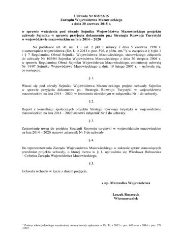 Uchwała Nr 838/52/15 Zarządu Województwa Mazowieckiego z dnia 30 czerwca 2015 r. w sprawie wniesienia pod obrady Sejmiku Województwa Mazowieckiego projektu uchwały Sejmiku w sprawie przyjęcia dokumentu pn.: Strategia Rozwoju Turystyki w województwie mazowieckim na lata 2014 – 2020 Na podstawie art. 41 ust. 1 i ust. 2 pkt 1 ustawy z dnia 5 czerwca 1998 r. o samorządzie województwa (Dz. U. z 2013 r. poz. 596, z późn. zm.1)), w związku z § 6 pkt 1 i § 7 Regulaminu Obrad Sejmiku Województwa Mazowieckiego, stanowiącego załącznik do uchwały Nr 105/04 Sejmiku Województwa Mazowieckiego z dnia 30 sierpnia 2004 r. w sprawie Regulaminu Obrad Sejmiku Województwa Mazowieckiego, zmienionej uchwałą Nr 14/07 Sejmiku Województwa Mazowieckiego z dnia 19 lutego 2007 r. – uchwala się, co następuje: § 1. Wnosi się pod obrady Sejmiku Województwa Mazowieckiego projekt uchwały Sejmiku w sprawie przyjęcia dokumentu pn.: Strategia Rozwoju Turystyki w województwie mazowieckim na lata 2014 – 2020, w brzmieniu określonym w załączniku Nr 1 do uchwały. § 2. Raport z konsultacji społecznych projektu Strategii Rozwoju turystyki w województwie mazowieckim na lata 2014 – 2020 stanowi załącznik Nr 2 do uchwały. § 3. Zestawienie uwag do projektu Strategii Rozwoju turystyki w województwie mazowieckim na lata 2014 – 2020 stanowi załącznik Nr 3 do uchwały. § 4. Do reprezentowania Zarządu Województwa Mazowieckiego w zakresie spraw stanowiących przedmiot projektu uchwały, o której mowa w § 1, upoważnia się Wiesława Raboszuka – Członka Zarządu Województwa Mazowieckiego. § 5. Uchwała wchodzi w życie z dniem podjęcia. z up. Marszałka Województwa Leszek Ruszczyk Wicemarszałek Zmiany tekstu jednolitego wymienionej ustawy zostały ogłoszone w Dz. U. z 2013 r. poz. 645 oraz z 2014 r. poz. 379 i 1072. 1)