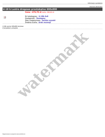 Informacje o produkcie Utworzono 08-03-2017 U-18 b Lustro drogowe prostokątne 600x800 Cena : 479,70 zł (netto: 390,00 zł) Nr katalogowy : U-18b 6x8 Dostępność : Dostępny Stan magazynowy : bardzo wysoki Średnia ocena : brak recenzji w at er m ar k U-18b wymiar 600x800 akrylowe Z kompletem uchwytów Wygenerowano w programie www.oscGold.com