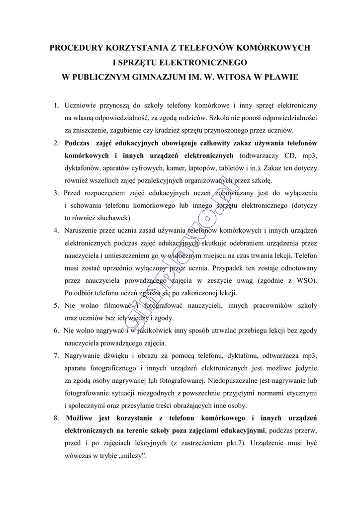 PROCEDURY KORZYSTANIA Z TELEFONÓW KOMÓRKOWYCH I SPRZĘTU ELEKTRONICZNEGO W PUBLICZNYM GIMNAZJUM IM. W. WITOSA W PŁAWIE 1. Uczniowie przynoszą do szkoły telefony komórkowe i inny sprzęt elektroniczny na własną odpowiedzialność, za zgodą rodziców. Szkoła nie ponosi odpowiedzialności za zniszczenie, zagubienie czy kradzież sprzętu przynoszonego przez uczniów. 2. Podczas zajęć edukacyjnych obowiązuje całkowity zakaz używania telefonów komórkowych i innych urządzeń elektronicznych (odtwarzaczy CD, mp3, dyktafonów, aparatów cyfrowych, kamer, laptopów, tabletów i in.). Zakaz ten dotyczy również wszelkich zajęć pozalekcyjnych organizowanych przez szkołę. 3. Przed rozpoczęciem zajęć edukacyjnych uczeń zobowiązany jest do wyłączenia i schowania telefonu komórkowego lub innego sprzętu elektronicznego (dotyczy to również słuchawek). 4. Naruszenie przez ucznia zasad używania telefonów komórkowych i innych urządzeń elektronicznych podczas zajęć edukacyjnych skutkuje odebraniem urządzenia przez nauczyciela i umieszczeniem go w widocznym miejscu na czas trwania lekcji. Telefon musi zostać uprzednio wyłączony przez ucznia. Przypadek ten zostaje odnotowany przez nauczyciela prowadzącego zajęcia w zeszycie uwag (zgodnie z WSO). Po odbiór telefonu uczeń zgłasza się po zakończonej lekcji. 5. Nie wolno filmować i fotografować nauczycieli, innych pracowników szkoły oraz uczniów bez ich wiedzy i zgody. 6. Nie wolno nagrywać i w jakikolwiek inny sposób utrwalać przebiegu lekcji bez zgody nauczyciela prowadzącego zajęcia. 7. Nagrywanie dźwięku i obrazu za pomocą telefonu, dyktafonu, odtwarzacza mp3, aparatu fotograficznego i innych urządzeń elektronicznych jest możliwe jedynie za zgodą osoby nagrywanej lub fotografowanej. Niedopuszczalne jest nagrywanie lub fotografowanie sytuacji niezgodnych z powszechnie przyjętymi normami etycznymi i społecznymi oraz przesyłanie treści obrażających inne osoby. 8. Możliwe jest korzystanie z telefonu komórkowego i innych urządzeń elektronicznych na terenie szkoły poza zajęciami edukacyjnymi, podczas przerw, przed i po zajęciach lekcyjnych (z zastrzeżeniem pkt.7). Urządzenie musi być wówczas w trybie „milczy”. 9. Dopuszcza się możliwość korzystania z telefonu komórkowego i innych urządzeń elektronicznych podczas wycieczek szkolnych, zawodów sportowych za zgodą nauczyciela i rodziców (z zastrzeżeniem pkt.7). Pełną odpowiedzialność za sprzęt ponosi uczeń. 10. Użycie przez ucznia telefonu komórkowego lub innego sprzętu elektronicznego podczas lekcji jest możliwe wyłącznie do celów edukacyjnych i za zgodą nauczyciela prowadzącego zajęcia (np. podczas realizacji projektów m. in. takich jak: nagrywanie audycji radiowych, oglądanie filmów, tworzenie własnych filmów, rejestrowanie przeprowadzanych doświadczeń, kreatywna fotografia, słuchanie i tworzenie muzyki, robienie interaktywnych notatek z lekcji, korzystanie z interaktywnych map, wykonywanie ćwiczeń podczas lekcji informatyki, słuchanie zagranicznych stacji radiowych podczas nauki języków obcych, itp.). 11. Za zgodą nauczyciela uczeń może użyć telefonu komórkowego w celu skontaktowania się z rodzicem. 12. Nie wolno ładować telefonów komórkowych i innych urządzeń elektronicznych na terenie szkoły. 13. Zakaz korzystania z telefonów komórkowych i innych urządzeń elektronicznych podczas zajęć edukacyjnych obowiązuje także nauczycieli i innych pracowników szkoły. W przypadku naruszenia zasad korzystania z telefonów komórkowych przez nauczycieli i pracowników szkoły upomnienia udziela Dyrektor. 14. Za nieprzestrzeganie powyższych procedur uczeń ponosi karę zgodnie z WSO (-50p.).