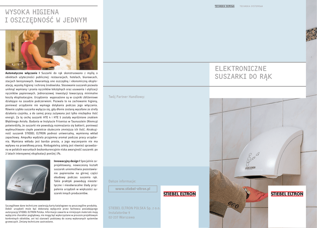 TECHNIKA DOMOWA TECHNIKA SYSTEMOWA WYSOKA HIGIENA I OSZCZĘDNOŚĆ W JEDNYM Automatyczne włączanie I Suszarki do rąk skonstruowano z myślą o obiektach użyteczności publicznej: restauracjach, hotelach, biurowcach, stacjach benzynowych. Gwarantują one oszczędną i ekonomiczną eksploatację, wysoką higienę i ochronę środowiska. Stosowanie suszarek pozwala uniknąć wymiany i prania ręczników tekstylnych oraz usuwania i utylizacji ręczników papierowych. Jednorazowej inwestycji towarzyszą minimalne koszty eksploatacyjne. Urządzenia wyposażone są w czujniki zbliżeniowe działające na zasadzie podczerwieni. Pozwala to na zachowanie higieny, ponieważ urządzenie nie wymaga dotykania podczas jego włączania. Równie szybko suszarka wyłącza się, gdy dłonie zostaną wycofane ze strefy działania czujnika, a do samej pracy zużywana jest tylko niezbędna ilość energii. Za tę cechę suszarki HTE 4 i HTE 5 zostały wyróżnione znakiem Błękitnego Anioła. Badania w Instytucie Frisenius w Taunusstein (Niemcy) potwierdziły, że suszarki nie powodują rozmnażania się bakterii, ponieważ wydmuchiwane ciepłe powietrze skutecznie zmniejsza ich ilość. Atrakcyjność suszarek STIEBEL ELTRON podnosi uniwersalny, wymienny wkład zapachowy. Ampułka wydziela przyjemny aromat podczas pracy urządzenia. Wymiana wkładu jest bardzo prosta, a jego wyczerpanie nie ma wpływu na prawidłową pracę. Niebagatelną zaletą jest również sprawdzona w polskich warunkach bezkonkurencyjnie niska awaryjność suszarek: po 2 latach intensywnej eksploatacji poniżej 1%. Innowacyjny design I Specjalnie zaprojektowany, nowoczesny kształt suszarek uniemożliwia pozostawianie papierosów na górnej części obudowy podczas suszenia rąk. Takie praktyki powodują nieestetyczne i nieodwracalne ślady przypalenia urządzeń w większości suszarek innych producentów. Szczegółowe dane techniczne zawierają karty katalogowe na poszczególne produkty. Dobór urządzeń może być dokonany wyłącznie przez fachowca posiadającego autoryzację STIEBEL ELTRON Polska. Informacje zawarte w niniejszym materiale mają wyłącznie charakter poglądowy, nie mogą być wykorzystane w procesie projektowym konkretnych obiektów, ani też stanowić podstawy do oceny wykonanych systemów grzewczych. Zmiany techniczne zastrzeżone. ELEKTRONICZNE SUSZARKI DO RĄK Twój Partner Handlowy: Dalsze informacje: www.stiebel-eltron.pl STIEBEL ELTRON POLSKA Sp. z o.o. Instalatorów 9 02-237 Warszawa HIGIENICZNE SUSZENIE Z PRZYJEMNYM AROMATEM SUSZARKI TURBOTRONIC. WIĘCEJ MOCY. Pachnące dłonie I Suszarka do rak HTE 4 electronic pracuje szybko, bez nadmiernego hałasu. Jest odporna na uderzenia i promienie ultrafioletowe. Jej obudowa została wykonana z wysokiej jakości tworzywa sztucznego. Sterowany podczerwienią system zbliżeniowy rozpoczyna pracę automatycznie po zbliżeniu rąk na odległość pomiędzy 6 i 12 cm od kratki wylotu ciepłego powietrza. Wbudowany ogranicznik temperatury bezpieczeństwa skutecznie zapobiega przegrzaniu się urządzenia. Łatwy i szybki montaż odbywa sie dzięki załączonemu szablonowi służącemu do wykonania otworów mocujących oraz dzięki systemowi mocowania. W wyposażeniu dodatkowym znajdują się wkłady o zapachu cytrynowym i kwiatowym, które zapewniają suszonym dłoniom przyjemny aromat. Wyjątkowo trwała I Suszarka HTE 5 electronic została wyposażona w bardzo trwałą obudowę wykonaną z ciśnieniowego odlewu stopu aluminium. Dzięki temu znajduje zastosowanie w miejscach, gdzie może często dochodzić do uszkodzeń mechanicznych urządzenia. Pozostałe funkcje suszarki są identyczne jak w modelu HTE 4. Błyskawiczne suszenie I Suszarki HTT...turbotronic charakteryzują się zwiększoną mocą pracy za sprawą wmontowanej grzałki 2600W. Duży strumień przepływu powietrza pozwala na szczególnie szybkie (wynoszące ok. 20 sekund) suszenie dłoni. Również w tych modelach można stosować wymienne wkłady zapachowe. W typoszeregu znajdują się 4 modele: HTT 4 WS* turbotronic z obudową z tworzywa sztucznego wysokiej jakości, w kolorze białym oraz 3 suszarki HTT 5... turbotronic z obudową ze stopu aluminium, natomiast różniące się kolorami. Do wyboru jest kolor biały (WS), antracyt metalik (AM) oraz srebrny metalik (SM). Niezależnie od koloru i materiału obudowy wszystkie suszarki są energooszędne, bezobsługowe w eksploatacji, higieniczne i nowoczesne z wyjątkowo odporną na uszkodzenia obudową. HTE 4 electronic HTE 5 electronic HTT 4 WS* turbotronic / HTT 5 WS*, AM*, SM* turbotronic Moc suszarki 1850 W, przepływ powietrza 146 m³/h Moc suszarki 1850 W, przepływ powietrza 146 m³/h Moc suszarki 2600 W, przepływ powietrza 250 m³/h Poziom hałasu 54 dB(A) Poziom hałasu 54 dB(A) Poziom hałasu 68 dB(A) Obudowa z tworzywa sztucznego w kolorze białym Obudowa z odlewu aluminium w kolorze białym (RAL 9003) Obudowa z tworzywa (HTT 4) lub stopu alumunium (HTT 5) * WS - kolor biały, AM - kolor antracyt metalik, SM - kolor srebrny metalik HTE 4 HTE 5 HTT 5 SM HTT 5 AM SBB plus