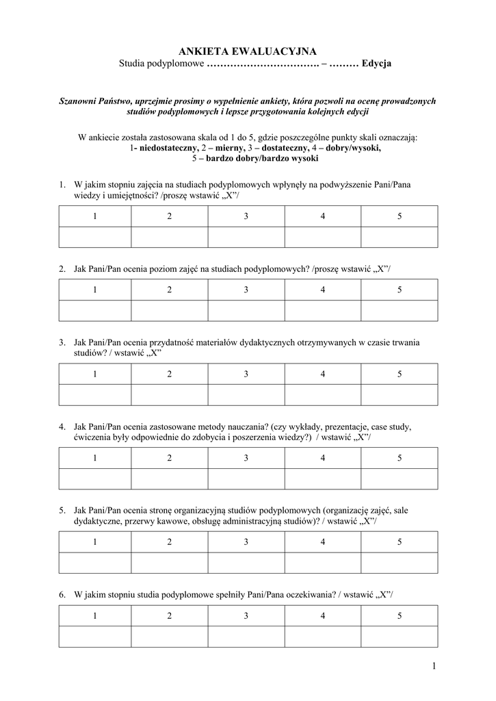 ANKIETA EWALUACYJNA Studia podyplomowe ……………………………. – ……… Edycja Szanowni Państwo, uprzejmie prosimy o wypełnienie ankiety, która pozwoli na ocenę prowadzonych studiów podyplomowych i lepsze przygotowania kolejnych edycji W ankiecie została zastosowana skala od 1 do 5, gdzie poszczególne punkty skali oznaczają: 1- niedostateczny, 2 – mierny, 3 – dostateczny, 4 – dobry/wysoki, 5 – bardzo dobry/bardzo wysoki 1. W jakim stopniu zajęcia na studiach podyplomowych wpłynęły na podwyższenie Pani/Pana wiedzy i umiejętności? /proszę wstawić „X”/ 1 2 3 4 5 2. Jak Pani/Pan ocenia poziom zajęć na studiach podyplomowych? /proszę wstawić „X”/ 1 2 3 4 5 3. Jak Pani/Pan ocenia przydatność materiałów dydaktycznych otrzymywanych w czasie trwania studiów? / wstawić „X” 1 2 3 4 5 4. Jak Pani/Pan ocenia zastosowane metody nauczania? (czy wykłady, prezentacje, case study, ćwiczenia były odpowiednie do zdobycia i poszerzenia wiedzy?) / wstawić „X”/ 1 2 3 4 5 5. Jak Pani/Pan ocenia stronę organizacyjną studiów podyplomowych (organizację zajęć, sale dydaktyczne, przerwy kawowe, obsługę administracyjną studiów)? / wstawić „X”/ 1 2 3 4 5 6. W jakim stopniu studia podyplomowe spełniły Pani/Pana oczekiwania? / wstawić „X”/ 1 2 3 4 5 1 7. Jak Pani/Pan ocenia merytoryczne przygotowanie i sposób przekazywania wiedzy przez poszczególnych wykładowców? /proszę wpisać 1,2,3,4 lub 5/ Nazwa przedmiotu Prowadzący Zarządzanie łańcuchem dostaw dr inż. M. Dobrzyński Transport mgr inż. E. Dobrzyńska Zarządzanie zapasami dr inż. M. Dobrzyński Badania operacyjne dr inż. Wojciech Zalewski Prognozowanie gospodarcze dr inż. Arkadiusz Jurczuk Logistyczne systemy informacyjne dr inż. M. Dobrzyński Modelowanie procesów logistycznych dr inż. Arkadiusz Jurczuk, dr inż. Krzysztof Dziekoński Logistyka dystrybucji dr inż. Ireneusz Jakuszewicz Logistyka produkcji inż. Krzysztof Dziekoński Prawo celne i transportowe mgr Anatol Panasiuk Zarządzanie magazynem dr inż. M. Dobrzyński Kompetencje Sposób prowadzenia zajęć / przekazywania wiedzy Postawa wykładowcy wobec słuchacza 8. O jakie zagadnienia/przedmioty Pani/Pana zdaniem należałoby rozszerzyć w przyszłości program studiów podyplomowych? (własne uwagi) …………………………………………………………………………………………………………… …………………………………………………………………………………………………………… …………………………………………………………………………………………………………… …………………………………………………………………………………………………………… …………………………………………………………………………………………………………… …………………………………………………………………………………………………………… 2 9. Które przedmioty (zagadnienia) Pani/Pana zdaniem należałoby w przyszłości usunąć z programu studiów lub zmniejszyć liczbę godzin dydaktycznych? (własne uwagi) …………………………………………………………………………………………………………… …………………………………………………………………………………………………………… …………………………………………………………………………………………………………… …………………………………………………………………………………………………………… …………………………………………………………………………………………………………… …………………………………………………………………………………………………………… 10. Jaka wiedza Pani/Pana zdaniem jest niezbędna do prawidłowego pełnienia obowiązków pracownika działu logistyki? (własne uwagi) …………………………………………………………………………………………………………… …………………………………………………………………………………………………………… …………………………………………………………………………………………………………… …………………………………………………………………………………………………………… …………………………………………………………………………………………………………… …………………………………………………………………………………………………………… 11. Czy udział w studiach podyplomowych ……………………. przyczynił się do poprawy Pani/Pana sytuacji zawodowej? Tak Nie Nie mam zdania 12. Czy poleciłaby (-łby) Pani/Pan studia podyplomowe ……………………. innym osobom? Tak Nie Nie mam zdania Już to zrobiłam/łem 13. W jakiego typu studiach podyplomowych chciałaby (-łby) Pani/Pan uczestniczyć w przyszłości? …………………………………………………………………………………………………………… …………………………………………………………………………………………………………… …………………………………………………………………………………………………………… …………………………………………………………………………………………………………… 12. Indywidualne uwagi i komentarze: …………………………………………………………………………………………………………… ………………………………………………………………