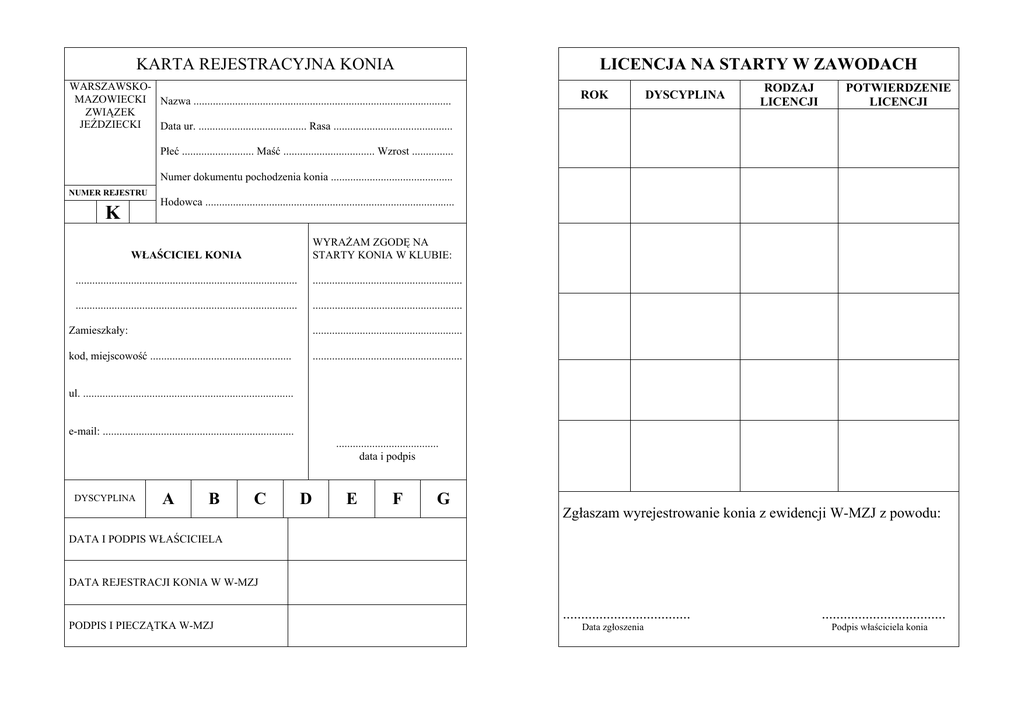 KARTA REJESTRACYJNA KONIA LICENCJA NA STARTY W ZAWODACH WARSZAWSKOMAZOWIECKI Nazwa ............................................................................................. ZWIĄZEK JEŹDZIECKI Data ur. ....................................... Rasa ........................................... ROK DYSCYPLINA RODZAJ LICENCJI POTWIERDZENIE LICENCJI Płeć .......................... Maść ................................. Wzrost ............... Numer dokumentu pochodzenia konia ............................................ NUMER REJESTRU K Hodowca .......................................................................................... WYRAŻAM ZGODĘ NA STARTY KONIA W KLUBIE: WŁAŚCICIEL KONIA ................................................................................ ...................................................... ................................................................................ ...................................................... Zamieszkały: ...................................................... kod, miejscowość ................................................... ...................................................... ul. ............................................................................ e-mail: ..................................................................... ..................................... data i podpis DYSCYPLINA A B C D E F G Zgłaszam wyrejestrowanie konia z ewidencji W-MZJ z powodu: DATA I PODPIS WŁAŚCICIELA DATA REJESTRACJI KONIA W W-MZJ PODPIS I PIECZĄTKA W-MZJ ................................... Data zgłoszenia .................................. Podpis właściciela konia