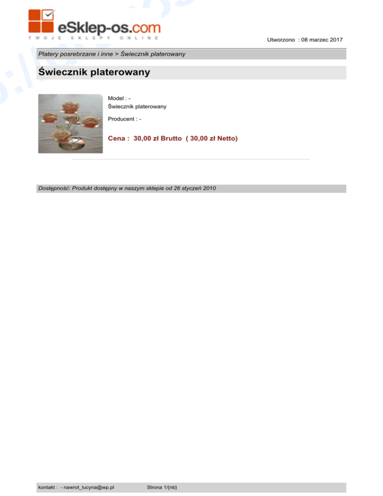 o g a r /d / : p Platery posrebrzane i inne > Świecznik platerowany Świecznik platerowany Model : Świecznik platerowany Producent : - Cena : 30,00 zł Brutto ( 30,00 zł Netto) Dostępność: Produkt dostępny w naszym sklepie od 26 styczeń 2010 kontakt : - [email protected] Strona 1/{nb} Utworzono : 08 marzec 2017