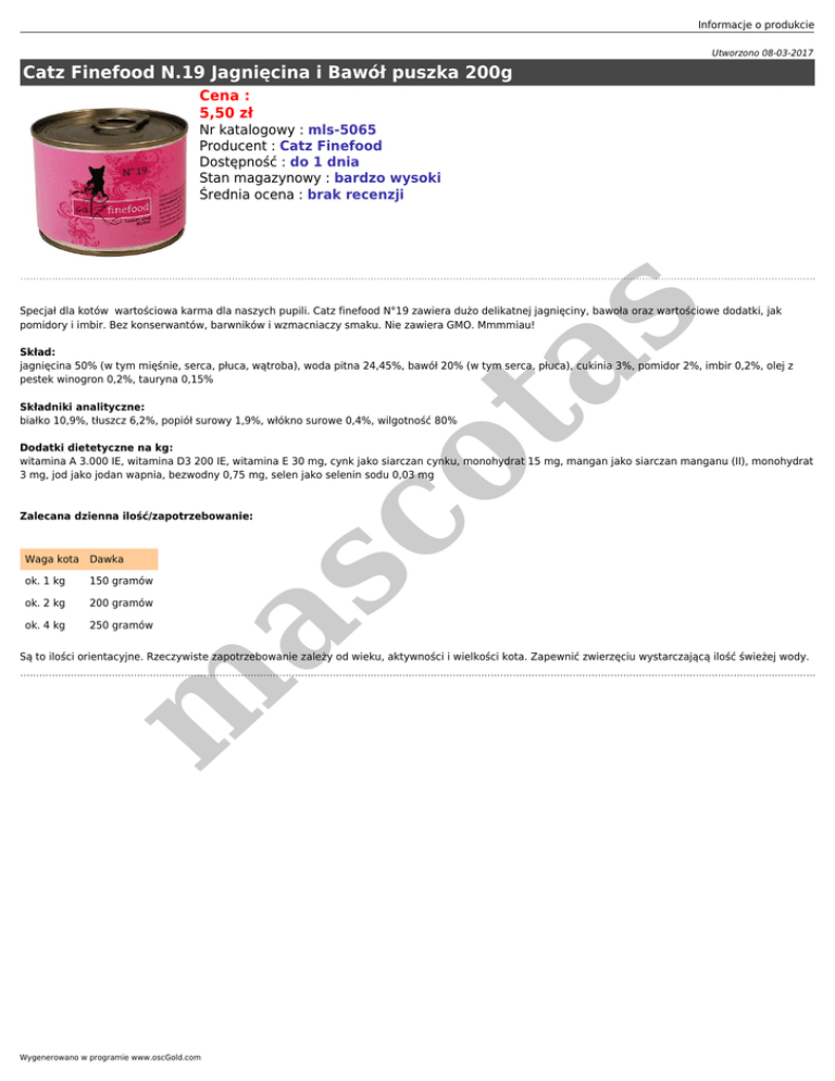 Informacje o produkcie Utworzono 08-03-2017 Catz Finefood N.19 Jagnięcina i Bawół puszka 200g Cena : 5,50 zł Nr katalogowy : mls-5065 Producent : Catz Finefood Dostępność : do 1 dnia Stan magazynowy : bardzo wysoki Średnia ocena : brak recenzji s Specjał dla kotów wartościowa karma dla naszych pupili. Catz finefood N°19 zawiera dużo delikatnej jagnięciny, bawoła oraz wartościowe dodatki, jak pomidory i imbir. Bez konserwantów, barwników i wzmacniaczy smaku. Nie zawiera GMO. Mmmmiau! co ta Skład: jagnięcina 50% (w tym mięśnie, serca, płuca, wątroba), woda pitna 24,45%, bawół 20% (w tym serca, płuca), cukinia 3%, pomidor 2%, imbir 0,2%, olej z pestek winogron 0,2%, tauryna 0,15% Składniki analityczne: białko 10,9%, tłuszcz 6,2%, popiół surowy 1,9%, włókno surowe 0,4%, wilgotność 80% Dodatki dietetyczne na kg: witamina A 3.000 IE, witamina D3 200 IE, witamina E 30 mg, cynk jako siarczan cynku, monohydrat 15 mg, mangan jako siarczan manganu (II), monohydrat 3 mg, jod jako jodan wapnia, bezwodny 0,75 mg, selen jako selenin sodu 0,03 mg Zalecana dzienna ilość/zapotrzebowanie: m as Waga kota Dawka ok. 1 kg 150 gramów ok. 2 kg 200 gramów ok. 4 kg 250 gramów Są to ilości orientacyjne. Rzeczywiste zapotrzebowanie zależy od wieku, aktywności i wielkości kota. Zapewnić zwierzęciu wystarczającą ilość świeżej wody. Wygenerowano w programie www.oscGold.com