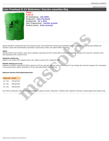 Informacje o produkcie Utworzono 08-03-2017 Catz Finefood N.23 Wołowina i Kaczka saszetka 85g Cena : 4,25 zł s Nr katalogowy : mls-5091 Producent : Catz Finefood Dostępność : do 1 dnia Stan magazynowy : bardzo wysoki Średnia ocena : brak recenzji co ta Specjał dla kotów wartościowa karma dla naszych pupili. Catz finefood N°23 zawiera dużo delikatnej wołowiny, kaczkę oraz wartościowe dodatki, jak żurawina i aloes. Bez konserwantów, barwników i wzmacniaczy smaku. Nie zawiera GMO. Mmmmiau! Skład: wołowina 50% (w tym mięśnie, serca, płuca, wątroba), woda pitna 24,15%, kaczka 20% (w tym serca, wątroba), żurawina 3%, aloes 2%, rozmaryn 0,5%, olej rzepakowy 0,2%, tauryna 0,15% Składniki analityczne: białko 11,1%, tłuszcz 6,4%, popiół surowy 1,9%, włókno surowe 0,3%, wilgotność 80% Dodatki dietetyczne na kg: witamina A 3.000 IE, witamina D3 200 IE, witamina E 30 mg, cynk jako siarczan cynku, monohydrat 15 mg, mangan jako siarczan manganu (II), monohydrat 3 mg, jod jako jodan wapnia, bezwodny 0,75 mg, selen jako selenin sodu 0,03 mg m as Zalecana dzienna ilość/zapotrzebowanie: Waga kota Dawka ok. 1 kg 150 gramów ok. 2 kg 200 gramów ok. 4 kg 250 gramów Są to ilości orientacyjne. Rzeczywiste zapotrzebowanie zależy od wieku, aktywności i wielkości kota. Zapewnić zwierzęciu wystarczającą ilość świeżej wody. Wygenerowano w programie www.oscGold.com