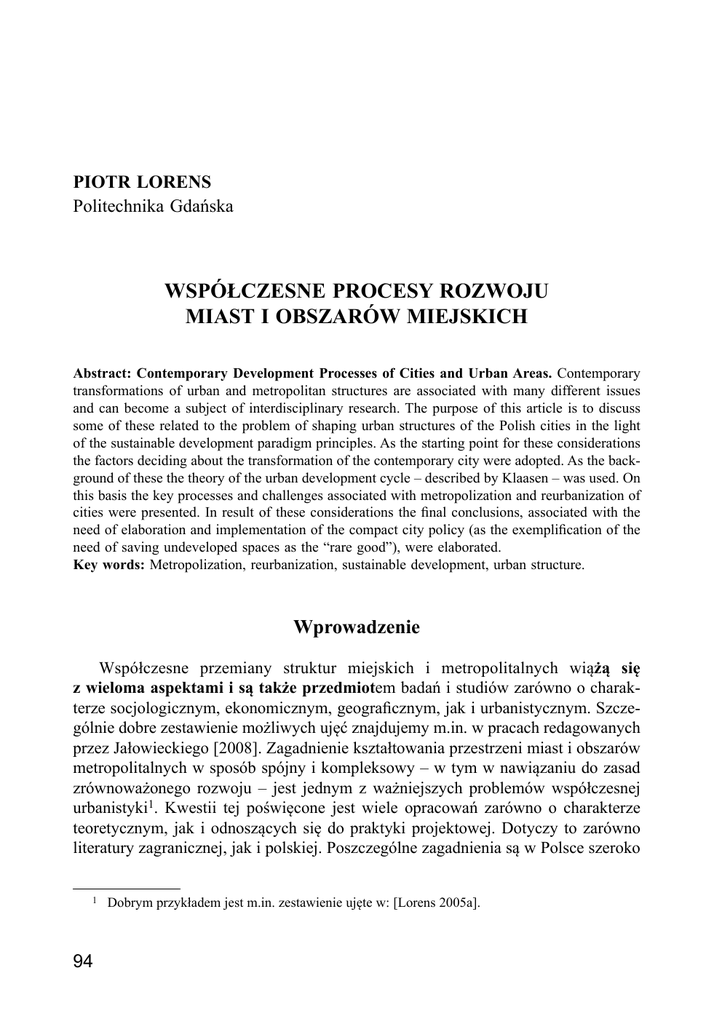 PIOTR LORENS Politechnika Gdańska WSPÓŁCZESNE PROCESY ROZWOJU MIAST I OBSZARÓW MIEJSKICH Abstract: Contemporary Development Processes of Cities and Urban Areas. Contemporary transformations of urban and metropolitan structures are associated with many different issues and can become a subject of interdisciplinary research. The purpose of this article is to discuss some of these related to the problem of shaping urban structures of the Polish cities in the light of the sustainable development paradigm principles. As the starting point for these considerations the factors deciding about the transformation of the contemporary city were adopted. As the background of these the theory of the urban development cycle – described by Klaasen – was used. On this basis the key processes and challenges associated with metropolization and reurbanization of cities were presented. In result of these considerations the final conclusions, associated with the need of elaboration and implementation of the compact city policy (as the exemplification of the need of saving undeveloped spaces as the “rare good”), were elaborated. Key words: Metropolization, reurbanization, sustainable development, urban structure. Wprowadzenie Współczesne przemiany struktur miejskich i metropolitalnych wiążą się z wieloma aspektami i są także przedmiotem badań i studiów zarówno o charakterze socjologicznym, ekonomicznym, geograficznym, jak i urbanistycznym. Szczególnie dobre zestawienie możliwych ujęć znajdujemy m.in. w pracach redagowanych przez Jałowieckiego [2008]. Zagadnienie kształtowania przestrzeni miast i obszarów metropolitalnych w sposób spójny i kompleksowy – w tym w nawiązaniu do zasad zrównoważonego rozwoju – jest jednym z ważniejszych problemów współczesnej urbanistyki1. Kwestii tej poświęcone jest wiele opracowań zarówno o charakterze teoretycznym, jak i odnoszących się do praktyki projektowej. Dotyczy to zarówno literatury zagranicznej, jak i polskiej. Poszczególne zagadnienia są w Polsce szeroko 1 94 Dobrym przykładem jest m.in. zestawienie ujęte w: [Lorens 2005a]. omawiane przez wielu autorów (w tym m.in. S. Gzella, J. Kołodziejskiego, T. Markowskiego, A. Baranowskiego, T. Borysa, W. Pęskiego), a ostatnio także A. Zimnicką i M. Stangela. Mimo to brakuje studiów ukazujących rozważaną problematykę w warunkach polskich, w tym – możliwości praktycznej realizacji zasad i reguł wynikających z paradygmatu rozwoju zrównoważonego. Jednocześnie, mimo że w gronie badaczy i praktyków zajmujących się urbanistyką dyskutowane są szeroko kwestie nowego paradygmatu rozwoju przestrzennego, to niewiele z tych prac odnosi się do wszystkich aspektów tego zagadnienia – a więc zarówno zasad kształtowania przestrzeni, sposobów podejmowania decyzji co do kierunków przekształceń przestrzeni, jak i kwestii związanych z realizacją zaplanowanych działań. Rzadko spotyka się także prace obejmujące zarówno zagadnienia teoretyczne, jak i związane z omówieniem konkretnych studiów przypadku. Celem opracowania jest więc zaprezentowanie całego spektrum zagadnień odnoszących się do problematyki reurbanizacji i metropolizacji obszarów miejskich, w tym w kontekście realizacji paradygmatu zrównoważonego rozwoju. Szczególną uwagę poświęcono kwestii kształtowania przestrzeni, jako jednego z głównych problemów równoważenia rozwoju na szczeblu lokalnym i metropolitalnym w warunkach polskich2. 1. Przyczyny współczesnych przemian miasta Dzisiejsze przemiany struktury miast są skutkiem wielu procesów zachodzących w gospodarce i społeczeństwie współczesnego świata. Jednym z nich jest proces globalizacji, stanowiący konsekwencję nowoczesności [Sztompka 2002]. Proces ten jest obecnie uważany za główną siłę dynamizującą światową ekonomię. Jednocześnie globalizacja stanowi kombinację wielu rozmaitych procesów, w tym – urbanizacji. Jej skutki mają zaś znaczenie zarówno dla przestrzeni, gospodarki, ale przede wszystkim – dla społeczeństwa [Keil, Ronneberger 2000]. Zjawisko globalizacji koncentruje się głównie w miastach, w nich też najbardziej odczuwa się konsekwencje procesów z niego wynikających. Materialnym jego efektem jest kształtowanie się nowej struktury powiązań przestrzennych, związanej z korzyściami wielkich miast i ich obszarów peryferyjnych, ale i z ekspansją sieci wymiany w skali międzynarodowej [Harańczyk 1998]. Jednocześnie rodzi się nowy model „miasta globalnego”, w którym występuje m.in. wzrost zróżnicowań społeczno–przestrzennych i znaczne rozszerzenie nielicznych dotychczas obszarów skrajnej nędzy i bogactwa w miastach [Węcławowicz 2002]. W tym kontekście jako swoistą gwarancję pomyślnego rozwoju w długim czasie władze miast często przyjmują politykę prorozwojową. Jej kluczowym elementem są często rozmaite przedsięwzięcia urbanistyczne – tzw. projekty miejskie o znaczeniu prestiżowym. Planowane 2 Konieczne jest odwołanie się do takich pozycji, jak: [Lorens 2013; Pęski 1999]. 95 i realizowane według rozmaitych zasad i reguł, stanowią one obecnie istotny element polityki rozwoju przestrzennego wielu miast [patrz m.in.: Lorens, Martyniuk–Pęczek 2011]. Są one związane ze wspomaganiem fizycznej, ekonomicznej i kulturalnej restrukturyzacji centrów miast lub obszarów śródmiejskich. Często bywają także nazywane „projektami flagowymi”, stanowiącymi zaczyn szerzej zakrojonych przekształceń w skali ogólnomiejskiej lub lokalnej [Loftman, Nevin 2003]. Wiele z tych „projektów flagowych” wiąże się z transformacją przestrzeni publicznych miasta, ponieważ – aby być konkurencyjnymi – miasta muszą „gwarantować osadzenie w określonym czasie i przestrzeni, jako przeciwstawienie się „bezmiejskości” doby globalizacji. Omówione zjawiska wiążące się z procesem globalizacji mają ogromny wpływ na kształtowan