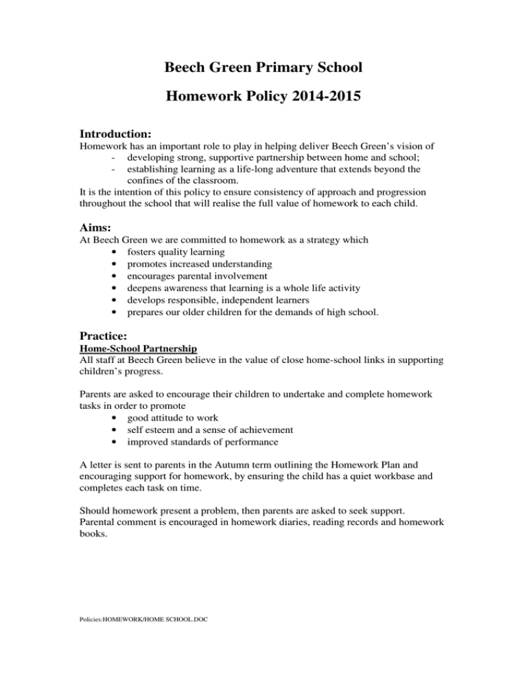 Beech Green Primary School Homework Policy 2014-2015 Introduction: Homework has an important role to play in helping deliver Beech Green’s vision of - developing strong, supportive partnership between home and school; - establishing learning as a life-long adventure that extends beyond the confines of the classroom. It is the intention of this policy to ensure consistency of approach and progression throughout the school that will realise the full value of homework to each child. Aims: At Beech Green we are committed to homework as a strategy which • fosters quality learning • promotes increased understanding • encourages parental involvement • deepens awareness that learning is a whole life activity • develops responsible, independent learners • prepares our older children for the demands of high school. Practice: Home-School Partnership All staff at Beech Green believe in the value of close home-school links in supporting children’s progress. Parents are asked to encourage their children to undertake and complete homework tasks in order to promote • good attitude to work • self esteem and a sense of achievement • improved standards of performance A letter is sent to parents in the Autumn term outlining the Homework Plan and encouraging support for homework, by ensuring the child has a quiet workbase and completes each task on time. Should homework present a problem, then parents are asked to seek support. Parental comment is encouraged in homework diaries, reading records and homework books. Policies:HOMEWORK/HOME SCHOOL.DOC Setting and completing homework Homework learning objectives are shared with the children. There is a clear expectation that children will complete homework on time. In the event of homework not being handed in, a reminder should be sent home to parents enlisting their support. Homework is valued by the teacher and the children, and is followed up in class through... • marking • discussion • inclusion of research findings in class work • testing • evaluations Depending on age and ability, children are encouraged to use a range of strategies to complete their homework, including • drawing on their own knowledge, skills and understanding • discussion with parents/family, etc. • reference to source material - books, I.C.T., etc. • practising and self-checking • time management, drafting, etc. Equal Opportunities Teachers will ensure that homework is used appropriately to meet the needs of all the children regardless of ethnicity, gender, ability, attainment or social background (N.B. as in equal opportunities policy) Special Needs Setting appropriate homework for children with special needs, which does not demand too much or too little, should be agreed with the SENCO and discussed with the parents. Tasks should: • have clear focus and time scale • give opportunity to succeed • help to develop a range of skills (as well as social skills) • be manageable for teachers Policies:HOMEWORK/HOME SCHOOL.DOC Marking Homework is marked/responded to promptly in a variety of ways, in line with the school Marking Policy. Review Homework is subject to regular evaluation and review in Key Stage and Staff meetings. This policy will be reviewed at the start of each academic year. Next review Autumn 2015 Beech Green Primary School September 2014 To parents of Key Stage 1 children Dear Parents, Homework We regard homework as an invaluable opportunity for your child to acquire increased responsibility and independence in learning and to extend and develop their knowledge and understanding. We also welcome the opportunity it provides to foster supportive partnerships between home and school. We value the support you give to your children through discussion of their homework, and would especially ask you to ensure that your child has the time and environment in which to work undisturbed. Should your child be unable to complete the homework on time, please send in a short note explaining the reason. On the reverse of this letter is a copy of our current homework plan that indicates the kind of homework that will be set for each year group. There is an opportunity, in homework books and home study books, for you to comment on how you felt each piece went. If there are any concerns over homework however, please feel free to contact your child’s class teacher. Yours sincerely, Mr R Woolston Headteacher Beech Green Primary School September 2014 To parents of Key Stage 2 children Dear Parents, Homework We regard homework as an invaluable opportunity for your child to acquire increased responsibility and independence in learning and to extend and develop their knowledge and understanding. We also welcome the opportunity it provides to foster supportive partnerships between home and school. We value the support you give to your children through discussion of their homework, and would especially ask you to ensure that your child has the time and environment in which to work undisturbed. Should your child be unable to complete the homework on time, please send in a short note explaining the reason. On the reverse of this letter is a copy of our current homework plan that indicates the kind of homework that will be set for each year group. We would recommend that your child spend no more than around 20 minutes on homework on any one night. There is an opportunity, in homework books and home study books, for you to comment on how you felt each piece went. If there are any concerns over homework however, please feel free to contact your child’s class teacher. Yours sincerely, Mr R Woolston Headteacher Homework Plan Whole School Reception Y1 and Y2 Y3 Y4 Y5 Y6 2014/2015 Daily: rehearsal of Maths Passport Targets; reading practice. Daily: sharing/reading a book of own choice (available from the book boxes or one from home). Reading and writing Tricky Words. Weekly: Jolly Phonics – learning letter sounds and Tricky Words. Reading and discussion (Rigb