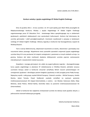 Janów Lubelski, dn.17.05.2012 r. Konkurs wiedzy z języka angielskiego EF Global English Challenge Dnia 22 grudnia 2011 r. 15-stu uczniów z kl. III h pod opieką pani Marii Widz przystąpiło do Międzynarodowego Konkursu Wiedzy z Języka Angielskiego EF Global English Challenge organizowanego przez EF Education First - światowego lidera specjalizującego się w szkoleniach językowych, podróżach edukacyjnych oraz wycieczkach kulturowych. Konkurs był skierowany do uczniów gimnazjów i szkół ponadgimnazjalnych. Uczniowie rywalizowali o pozycję w światowym rankingu EF Global English Challenge. Główną nagrodą w konkursie był dwutygodniowy wyjazd do Wielkiej Brytanii. Test w wersji elektronicznej, obejmował rozumienie ze słuchu, słownictwo i gramatykę oraz rozumienie tekstu pisanego. Wypełnienie testu pozwoliło sprawdzić znajomość języka angielskiego uczniów klasy III h oraz porównać ich stopień umiejętności z poziomem w innych szkołach w kraju i za granicą. Konkurs dał także możliwość zbadania efektywności uczniów poprzez zastosowanie interaktywnych i nowatorskich metod nauczania. Zespołowi z naszego gimnazjum nie udało się wygrać głównej nagrody – dwutygodniowego kursu języka angielskiego w placówce EF zlokalizowanej w Wielkiej Brytanii, jednakże wszyscy uczniowie biorący udział w konkursie otrzymali certyfikaty British Council potwierdzające ich umiejętności językowe i określające poziom biegłości językowej w skali przyjętej przez Radę Europy. Najwyższy wynik z całej grupy uzyskał Michał Szczęsny. Czterech uczniów – Michał Szczęsny, Amelia Mucha, Jakub Tomala, Paweł Siedlaczek uzyskało certyfikat na wyższym poziomie średniozaawansowanym B2 (Upper-Intermediate), a sześciu - Jan Moskal, Katarzyna Żytko, Maja Bielecka, Jakub Pielarz, Michał Bańka, Dominika Gałus na poziomie średniozaawansowanym B1 (Intermediate). Udział w konkursie bez wątpienia zmotywował uczniów do dalszej nauki języków obcych, a jednocześnie stanowił edukacyjną przygodę. Szkolny koordynator konkursu Maria Widz