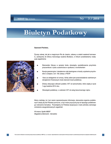 Nr MBSP Sp. z o.o. 3 / 2014 Biuletyn Podatkowy Szanowni Państwo, Życząc udanej, tak jak w magicznym Rio de Janeiro, zabawy w ostatni weekend karnawału, zachęcamy do lektury marcowego wydania Biuletynu, w którym przedstawiamy następuje zagadnienia: Stanowisko fiskusa w sprawie braku obowiązku opodatkowania przychodu pracownikowi z tytułu uczestnictwa w spotkaniu z kontrahentem Kaucja gwarancyjna i nieopłacona rata leasingowa a koszty uzyskania przychodów w związku z art. 15b ustawy o PDOP Kara za odstąpienie od umowy, której celem jest przeciwdziałanie nadmiernym obciążeniom finansowym może stanowić koszt podatkowy Zmiany dotyczące odliczeń podatku VAT od samochodów, które wejdą w życie 1-ego kwietnia 2014 roku Obowiązek podatkowy w zakresie VAT od usług bezumownego najmu Mamy nadzieję, że i tym razem zaprezentowane informacje, stanowiska organów podatkowych okażą się dla Państwa pomocne, a być może przyczynią się do lepszego podatkowego rozliczenia transakcji. Pozostajemy do Państwa dyspozycji w razie potrzeby szerszego omówienia zasygnalizowanych zagadnień. W imieniu Spółki MBSP Magdalena Bednarek– Sieradzka Treści zawarte w Biuletynie nie stanowią porady prawnej ani podatkowej. MBSP Sp. z o.o. nie ponosi odpowiedzialności za wykorzystanie informacji zawartych w przedmiotowej prezentacji bez zasięgnięcia dodatkowej opinii. MBSP Sp. z o.o. Nr 3/ 2014 A: PODATEK DOCHODOWY OD OSÓB FIZYCZNYCH (PDOF) POSIŁEK Z KONTRAHENTEM NIE STANOWI PRZYCHODU PRACOWNIKA W interpretacji IPTPB1/415-710/13-4/MD z dnia 10 lutego 2014 roku Dyrektor Izby Skarbowej w Łodzi zajął się kwestią określenia obowiązków pracodawcy jako płatnika podatku dochodowego od osób fizycznych w związku z finansowaniem posiłków spożywanych przez pracowników podczas spotkań z kontrahentami. We wniosku przedstawiono następujący opis stanu faktycznego (jako zdarzenia przyszłego: Wnioskodawca jest firmą handlową, która w związku z rodzajem i zakresem prowadzonej działalności wysyła pracowników zatrudnionych na stanowiskach kierowników sprzedaży, przedstawicieli handlowych i serwisantów w podróże służbowe na terenie kraju, sporadycznie również za granicę. Podróże te trwają 1, 2 lub 3 dni, co odpowiada zakresowi obowiązków służbowych pracowników. Podczas podróży służbowych delegowani pracownicy często spotykają się z kontrahentami Wnioskodawcy, zapraszanymi do restauracji gdzie spożywają wspólny posiłek. Czasami jest to konieczność, bo nie ma innej możliwości (miejsca) zorganizowania spotkania. Rachunek (fakturę) za posiłek, płacony jest kartą płatniczą Wnioskodawcy, bądź kartą płatniczą lub gotówką pracownika rozliczaną z udzielonej mu zaliczki. Zawsze zatem za posiłek pracownika spożyty w takcie podróży służbowej podczas spotkania z kontrahentem koszt ponosi Wnioskodawca, jako pracodawca. W związku z powyższym powstała wątpliwość, czy posiłek spożyty przez pracownika na spotkaniu z kontrahentem pracodawcy będzie przychodem pracownika ze stosunku pracy, od którego Wnioskodawca - będący płatnikiem podatku dochodowego od osób fizycznych obowiązany jest pobrać zaliczkę na ten podatek dochodowy i odprowadzić go do właściwego organu podatkowego, a jeśli tak to jak obliczyć wartość tego przychodu i wartość podatku. Wnioskodawca uznał, że powyższe nie powinno rodzić zadnych dodatkowych przychodów i obowiązków podatkowych , tak dla pracodawcy, jak i pracownika. Organ podatkowy przychylił się do powyższej opinii, opatrując ją dodatkowo takim komentarzem: „(…) Dla oceny skutków podatkowych opisanej sytuacji konieczne jest więc zdefiniowanie pojęcia nieodpłatnego świadczenia. Ponieważ przepisy ustawy o podatku dochodowym od osób fizycznych nie zawierają takiej definicji przy interpretacji tego pojęcia odwołać się należy do jego słownikowego znaczenia. W związku z powyższym stwierdzić należy, że świadczeniem nieodpłatnym jest świadczenie "niewymagające opłaty, takie za które się nie płaci, bezpłatne" (Nowy Słownik Języka Polskiego, PWN, Warszawa 2003 r.). W orzecznictwie sądowym przyjmuje się natomiast, że nieodpłatne świadczenie obejmuje nie tylko świadczenie w cywilistycznym znaczeniu, ale w jego zakres wchodzą także wszystkie zjawiska gospodarcze i zdarzenia prawne, których następstwem jest uzyskanie korzyści kosztem innego podmiotu lub te wszystkie zdarzenia prawne i gospodarcze, których skutkiem jest nieodpłatne, tj. niezwiązane z kosztami lub inną formą ekwiwalentu, przysporzenie majątku tej osobie, mające konkretny wymiar finansowy. Warto również wskazać, że skoro nieodpłatne świadczenie jest jedną z kategorii przychodu, wymienioną w art. Dla oceny skutków podatkowych posiłku udostępnionego pracownikowi, konieczne jest zdefiniowanie pojęcia nieodpłatnego świadczenia. 12 ustawy, to jako takie powinno spełniać ogólne kryteria przychodu. Z istoty podatku dochodowego wynika, że jest on ciężarem publicznoprawnym od przyrostu majątkowego (dochodu), a zatem przychodem - jako źródłem dochodu - jest tylko taka wartość, która wchodząc do majątku podatnika może powiększyć jego aktywa. Odnosząc się do powyższego stwierdzić należy, że o nieodpłatnym świadczeniu, mającym cechy przychodu podlegającego opodatkowaniu podatkiem dochodowym można mówić w sytuacji, gdy: (i) podmiot, na rzecz którego dokonywane jest tego rodzaju świadczenia odnosi korzyść, a więc musi zaistnieć u niego trwałe przysporzenie majątkowe; (ii) korzyść ta musi zostać odniesiona kosztem innego podmiotu, a więc powinna istnieć możliwość ustalenia kto poniósł ekonomiczny ciężar owego przesunięcia majątkowego, (iii) korzyść musi mieć konkretny wymiar finansowy, (iv) świadczenie musi mieć nieodpłatny charakter. Nie może ono zatem wiązać się z jakimkolwiek ekwiwalentem ze strony podatnika. Nie ma p