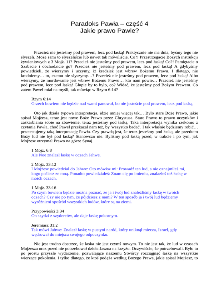 Paradoks Pawła – część 4 Jakie prawo Pawle? Przecież nie jesteśmy pod prawem, lecz pod łaską! Praktycznie nie ma dnia, byśmy tego nie słyszeli. Może sami to słyszeliście lub nawet tak mówiliście. Co?! Przestrzegacie Bożych instrukcji żywieniowych z 3 Mojż. 11? Przecież nie jesteśmy pod prawem, lecz pod łaską! Co?! Pamiętacie o Szabacie i obchodzicie go? Przecież nie jesteśmy pod prawem, lecz pod łaską! A gdybyśmy powiedzieli, że wierzymy i uczymy, iż kradzież jest wbrew Bożemu Prawu. I dlatego, nie kradniemy… to, czemu nie słyszymy…? Przecież nie jesteśmy pod prawem, lecz pod łaską! Albo wierzymy, że mordowanie jest wbrew Bożemu Prawu… kto nam powie… Przecież nie jesteśmy pod prawem, lecz pod łaską! Głupie by to było, co? Widać, że jesteśmy pod Bożym Prawem. Co zatem Paweł miał na myśli, tak mówiąc w Rzym 6:14? Rzym 6:14 Grzech bowiem nie będzie nad wami panował, bo nie jesteście pod prawem, lecz pod łaską. Oto jak działa typowa interpretacja, idzie mniej więcej tak… Było stare Boże Prawo, jakie spisał Mojżesz, teraz jest nowe Boże Prawo przez Chrystusa. Stare Prawo to prawo uczynków i zaskarbiania sobie na zbawienie, teraz jesteśmy pod łaską. Taka interpretacja wynika rzekomo z czytania Pawła, choć Paweł przekazał nam też, by 'wszystko badać'. I tak właśnie będziemy robić… przetestujemy taką interpretację Pawła. Czy prawdą jest, że teraz jesteśmy pod łaską, ale przedtem Boży lud nie był pod łaską? Stanowczo nie. Byliśmy pod łaską przed, w trakcie i po tym, jak Mojżesz otrzymał Prawo na górze Synaj. 1 Mojż. 6:8 Ale Noe znalazł łaskę w oczach Jahwe. 2 Mojż. 33:12 I Mojżesz powiedział do Jahwe: Oto mówisz mi: Prowadź ten lud, a nie oznajmiłeś mi, kogo poślesz ze mną. Ponadto powiedziałeś: Znam cię po imieniu, znalazłeś też łaskę w moich oczach. 1 Mojż. 33:16 Po czym bowiem będzie można poznać, że ja i twój lud znaleźliśmy łaskę w twoich oczach? Czy nie po tym, że pójdziesz z nami? W ten sposób ja i twój lud będziemy wyróżnieni spośród wszystkich ludów, które są na ziemi. Przypowieści 3:34 On szydzi z szyderców, ale daje łaskę pokornym. Jeremiasz 31:2 Tak mówi Jahwe: Znalazł łaskę w pustyni naród, który uniknął miecza, Izrael, gdy wędrował do miejsca swojego odpoczynku. Nie jest trudno dostrzec, że łaska nie jest czymś nowym. To nie jest tak, że lud w czasach Mojżesza oraz przed nie potrzebował dzieła Jaszua na krzyżu. Oczywiście, że potrzebowali. Było to po prostu przyszłe wydarzenie, pozwalające naszemu Stwórcy rozciągnąć łaskę na wszystkie wierzące pokolenia. I tylko dlatego, że ktoś podąża według Bożego Prawa, jakie spisał Mojżesz, to nie oznacza to, że traci łaskę. Nie da się więc zaprzeczyć, że Paweł uczy, iż nie jesteśmy pod prawem, lecz pod łaską. Ale w tym samym czasie, musimy dostrzec, że nie może on mówić, iż Boże Prawo, spisane przez Mojżesza, jest przeciwne łasce. Jak to pokazaliśmy w poprzednich odcinkach serii Paradoksu Pawła, obaj, nasz Mesjasz, Jezus – Jego hebrajskie imię to Jaszua, oraz Paweł, praktykowali i nauczali Bożego Prawa, jakie spisał Mojżesz. Nie być „pod prawem, lecz pod łaską” nie można rozumieć tak, by znaczyło to, że nie jesteśmy pod Bożym Prawem. To wywołuje pytanie – co dokładnie Paweł miał na myśli? Rzymian 6:14 Grzech bowiem nie będzie nad wami panował, bo nie jesteście pod prawem, lecz pod łaską. Zauważcie, że mówi tam, iż „grzech nie będzie nad wami panował”. A to znaczy, że kiedyś grzech panował nad nami. Czyli idąc dalej, kiedyś byliśmy 'pod grzechem'. Ktoś może rzec, że Paweł nie mówi, byśmy nie byli 'pod grzechem', ale o tym, żebyśmy już nie byli 'pod prawem'. I tu właśnie pojawia się błąd. Chociaż jest to jedno zdanie, zbyt wielu popełnia błąd, sądząc, że pierwsza połowa zdania jest o czym innym, a druga też o czym innym. Kto z nas tego nie słyszał o biblijnej hermeneutyce… kontekst, kontekst, kontekst? Najważniejszy jest kontekst! Pomyślcie, coś w tym prawie z Rzym 6:14, pod jakim mamy nie być, łączy się tak naprawdę z tym, by grzech nie panował nad nami. To prawo, pod jakim mamy nie być, ma coś wspólnego z tym, by nie być pod grzechem. Taki mamy przed sobą kontekst w tym zdaniu. Można pomyśleć, że przecież łatwo na to wpaść, ale strasznie ciężko pokonać czyjeś nastawienie doktrynalne. Pomyślcie… Jeśli Paweł w Rzym 6:14 mówił, byśmy nie byli pod Bożym Prawem, to czy chodziło Pawłowi o to, że nie jesteśmy pod Bożym Prawem, bo nie jesteśmy pod grzechem? Jeśli to Boże Prawo już nad nami nie panuje, to oznacza to, że Paweł przyrównuje Boże Prawo do bycia grzechem. A czy Boże Prawo jest grzechem? Może myślisz, że przecież nikt nie nazwałby Bożego Prawa grzechem, jednakże dokładnie to sugeruje Rzym 6:14, gdy się to czyta… oczywiście, jeśli ktoś ignoruje kontekst… i sądzi, że prawo, o jakim mówi Paweł, to Boże Prawo. Rzym 6:14 Grzech bowiem nie będzie nad wami panował, gdyż nie jesteście pod prawem, ale pod łaską. Przewidując, że pojawi się problem – bo Paweł był często wyrywany z kontekstu – stawia dokładnie to samo pytanie w kolejnym rozdziale. Rzymian 7:7 Cóż więc powiemy? Że Prawo to grzech? W żadnym razie! Przecież nie poznałbym grzechu, gdyby nie Prawo; bo też o pożądaniu nie wiedziałbym, gdyby Prawo nie mówiło: Nie będziesz pożądał. To dzięki Bożemu Prawu mamy definicję grzechu. Biblia informuje nas, że łamanie Bożego Prawa jest grzechem. 1 Jan 3:4 Każdy, kto czyni grzech, czyni bezprawie, a grzech jest bezprawiem. Przypomnijcie sobie, po hebrajsku 'prawo' to instrukcje. Czyli jest to instrukcja, która jest przeciwko Bożemu Prawu. Jeśli chcecie, to podobnie jak Paweł, możecie nazywać te instrukcje lub to prawo, 'Prawem grzechu'. Później poka