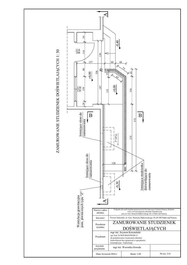 A -0,40 54 159 114 41 37 10 356 10 73 156 ±0,00 65 151 139 60 B A Istniejąca studzienka doświetlająca do zamurowania 10 -0,30 120 375 5° (8%) 572 B Istniejące okno do zamurowania Istniejące okno do zamurowania 29 139 126 60 187 ±0,00 80 157 Wentylacja grawitacyjna pom. piwnicznych typu "Z" ZAMUROWANIE STUDZIENEK DOŚWIETLAJĄCYCH 1: 50 114 208 Nazwa i adres obiektu: Inwestor: Przedmiot rysunku: Podjazdu dla osób niepełnosprawnych do Powiatowego Centrum Pomocy Rodzinie wraz z towarzyszącymi robotami remontowymi przy ul. Gen. Henryka Dąbrowskiego 46 w Nakle nad Notecią Powiat Nakielski, ul. Gen. Henryka Dąbrowskiego 54, 89-100 Nakło nad Notecią ZAMUROWANIE STUDZIENEK DOŚWIETLAJĄCYCH mgr inż. Szymon Krzemiński Projektant: Asystent projektanta upr. bud. Nr KUP/0049/PWOK/15 do projektowania i kierowania robotami budowlanymi bez ograniczeń w specjalności konstrukcyjno - budowlanej mgr inż. Weronika Szweda Data: kwiecień 2016 r. Skala: 1:50 Nr rys. 2/A