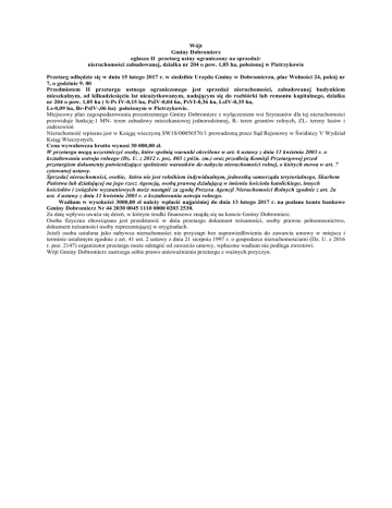 Wójt Gminy Dobromierz ogłasza II przetarg ustny ograniczony na sprzedaż: nieruchomości zabudowanej, działka nr 204 o pow. 1,05 ha, położonej w Pietrzykowie Przetarg odbędzie się w dniu 15 lutego 2017 r. w siedzibie Urzędu Gminy w Dobromierzu, plac Wolności 24, pokój nr 7, o godzinie 9. 00 Przedmiotem II przetargu ustnego ograniczonego jest sprzedaż nieruchomości, zabudowanej budynkiem mieszkalnym, od kilkudziesięciu lat nieużytkowanym, nadającym się do rozbiórki lub remontu kapitalnego, działka nr 204 o pow. 1,05 ha ( S-Ps IV-0,15 ha, PsIV-0,04 ha, PsVI-0,36 ha, LsIV-0,35 ha, Ls-0,09 ha, Br-PsIV-,06 ha) położonym w Pietrzykowie. Miejscowy plan zagospodarowania przestrzennego Gminy Dobromierz z wyłączeniem wsi Szymanów dla tej nieruchomości przewiduje funkcję:1 MN- teren zabudowy mieszkaniowej jednorodzinnej, R- teren gruntów rolnych, ZL- tereny lasów i zadrzewień Nieruchomość wpisana jest w Księgę wieczystą SW1S/00056576/1 prowadzoną przez Sąd Rejonowy w Świdnicy V Wydział Ksiąg Wieczystych. Cena wywoławcza brutto wynosi 30 000,00 zł. W przetargu mogą uczestniczyć osoby, które spełnią warunki określone w art. 6 ustawy z dnia 11 kwietnia 2003 r. o kształtowaniu ustroju rolnego (Dz. U. z 2012 r. poz. 803 z późn. zm.) oraz przedłożą Komisji Przetargowej przed przetargiem dokumenty potwierdzające spełnienie warunków do nabycia nieruchomości rolnej, o których mowa w art. 7 cytowanej ustawy. Sprzedaż nieruchomości, osobie, która nie jest rolnikiem indywidualnym, jednostką samorządu terytorialnego, Skarbem Państwa lub działającej na jego rzecz Agencją, osobą prawną działającą w imieniu kościoła katolickiego, innych kościołów i związków wyznaniowych może nastąpić za zgodą Prezesa Agencji Nieruchomości Rolnych zgodnie z art. 2a ust. 4 ustawy z dnia 11 kwietnia 2003 r. o kształtowaniu ustroju rolnego. Wadium w wysokości 3000,00 zł należy wpłacić najpóźniej do dnia 13 lutego 2017 r. na podane konto bankowe Gminy Dobromierz Nr 44 2030 0045 1110 0000 0203 2530. Za datę wpływu uważa się dzień, w którym środki finansowe znajdą się na koncie Gminy Dobromierz. Osoba fizyczna obowiązana jest przedstawić w dniu przetargu dokument tożsamości, osoby prawne pełnomocnictwo, dokument tożsamości osoby reprezentującej w oryginałach. Jeżeli osoba ustalona jako nabywca nieruchomości nie przystąpi bez usprawiedliwienia do zawarcia umowy w miejscu i terminie ustalonym zgodnie z art. 41 ust. 2 ustawy z dnia 21 sierpnia 1997 r. o gospodarce nieruchomościami (Dz. U. z 2016 r. poz. 2147) organizator przetargu może odstąpić od zawarcia umowy, wpłacone wadium nie podlega zwrotowi. Wójt Gminy Dobromierz zastrzega sobie prawo unieważnienia przetargu z ważnych przyczyn.