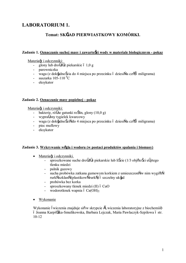 LABORATORIUM 1. Temat: SKŁAD PIERWIASTKOWY KOMÓRKI. Zadanie 1. Oznaczanie suchej masy i zawartości wody w materiale biologicznym - pokaz Materiały i odczynniki: - glony lub drożdże piekarskie – 1,0 g - parowniczka - waga (z dokładnościa do 4 miejsca po przecinku – dziesiąta część miligrama) - suszarka 105-110 0C - eksykator Zadanie 2. Oznaczanie masy popielnej - pokaz Materiały i odczynniki: - bakterie, różne gatunki roślin, glony (10,0 g) - wyprażony tygielek kwarcowy - waga (z dokładnością do 4 miejsca po przecinku – dziesiąta część miligrama) - piec muflowy - eksykator Zadanie 3. Wykrywanie węgla i wodoru (w postaci produktów spalania i biomasy) · Materiały i odczynniki. - sproszkowane suche drożdże piekarskie lub liście (1/3 objętości użytego tlenku miedzi - palnik gazowy - sucha probówka zatkana gumowym korkiem z umieszczoną w nim wygiętą rurką szklaną (plastikową rurką) – szczelny układ - probówka bez korka - sproszkowany tlenek miedzi (II) – CuO - wodorotlenek wapnia – Ca(OH)2 · Wykonanie Wykonanie ćwiczenia znajduje się w skrypcie „Ćwiczenia laboratoryjne z biochemii” – Joanna Karpińska-Smulikowska, Barbara Lejczak, Maria Pawlaczyk-Szpilowa – str. 10-12 1 Zadanie 4. Wykrywanie fosforu, siarki i żelaza · Materiały i odczynniki. - masa popielna - rozcieńczony kwas azotowy VI 0,1 N – HNO3 - rozcieńczony kwas solny 0,1 N · Wykonanie. Po oziębieniu masy popielnej jedną część popiołu należy rozpuścić w rozcieńczonym kwasie azotowym (0,1 N), a drugą w rozcieńczonym kwasie solnym (0,1 N) i przesączyć przez sączek bibułowy W przesączu z kwasem azotowym należy przeprowadzić próbę w celu stwierdzenia: q obecności fosforu w formie fosforanów q siarki w postaci siarczanów. W wyciągu z kwasu solnego należy wykonać próbę w celu stwierdzenia obecności: q żelaza. ü Wykrywanie fosforu · Materiały i odczynniki. - szkiełko zegarkowe - palnik gazowy - drewniane szczypce - 1 % roztwór molibdenianu amonowego w kwasie azotowym - 1 % (NH4)2MoO4 w HNO3 - TRUCIZNA · Wykonanie. Do 2 kropli przesączu na szkiełku zegarkowym dodać 2 krople 1 % roztworu molibdenianu amonowego w kwasie azotowym. Ostrożnie podgrzewać szkiełko do temperatury wrzenia. Roztwór (NH4)2MoO4 w HNO3 wytrąca z roztworów fosforanów żółty krystaliczny osad fosforomolibdenianu amonowego. PO43- + 3 NH4+ + 12 MoO42- + 24 H+ (NH4)3H4[P(Mo2O7)6] + 10 H2O 2 ü Wykrywanie siarki · Materiały i odczynniki: szkiełko podstawowe roztwór chlorku baru 0,5 N – BaCl2 – TRUCIZNA. · Wykonanie. Na szkiełko podstawowe nanieść 1 kroplę przesączu (im więcej przesączu tym lepiej) i 1 kroplę roztworu chlorku baru 0,5 N. Na szkiełku pojawi się biały krystaliczny osad siarczanu baru. SO42- + BaCl2 BaSO4 + 2 Cl- Od razu następuje zmętnienie (biały osad), kryształki pojawiają się po paru godzinach (na drugi dzień). ü Wykrywanie żelaza · Materiały i odczynniki: - szkiełko zegarkowe lub skrawek bibuły - 1 % K4[Fe(CN)6] – żelazicjanek potasu (cjanożelazin potasu) - TRUCIZNA · Wykonanie. Na szkiełku zegarkowym zmieszać kroplę przesączu z HCl (im więcej przesączu tym lepszy efekt) z kroplą 1 % K4[Fe(CN)6]. Jony cyjanożelazinu wytrącają z roztworów zawierających jony Fe3+ w środowisku obojętnym lub słabokwaśnym ciemnoniebieski osad cyjanożelazinu żelazowego, tzw. błękitu pruskiego Fe4[Fe(CN)6]3. 4 Fe3+ + 3 Fe(CN)64- 4 Fe4 + [Fe (CN)6]3 3