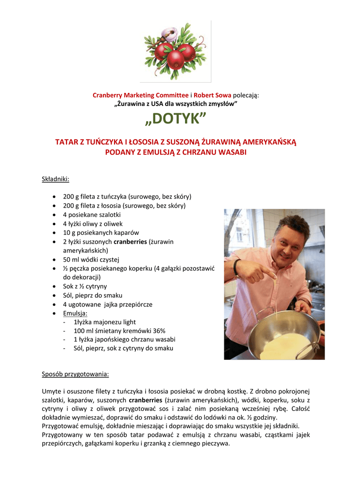 Cranberry Marketing Committee i Robert Sowa polecają: „Żurawina z USA dla wszystkich zmysłów” „DOTYK” TATAR Z TUOCZYKA I ŁOSOSIA Z SUSZONĄ ŻURAWINĄ AMERYKAOSKĄ PODANY Z EMULSJĄ Z CHRZANU WASABI Składniki: 200 g fileta z tuoczyka (surowego, bez skóry) 200 g fileta z łososia (surowego, bez skóry) 4 posiekane szalotki 4 łyżki oliwy z oliwek 10 g posiekanych kaparów 2 łyżki suszonych cranberries (żurawin amerykaoskich) 50 ml wódki czystej ½ pęczka posiekanego koperku (4 gałązki pozostawid do dekoracji) Sok z ½ cytryny Sól, pieprz do smaku 4 ugotowane jajka przepiórcze Emulsja: - 1łyżka majonezu light - 100 ml śmietany kremówki 36% - 1 łyżka japooskiego chrzanu wasabi - Sól, pieprz, sok z cytryny do smaku Sposób przygotowania: Umyte i osuszone filety z tuoczyka i łososia posiekad w drobną kostkę. Z drobno pokrojonej szalotki, kaparów, suszonych cranberries (żurawin amerykaoskich), wódki, koperku, soku z cytryny i oliwy z oliwek przygotowad sos i zalad nim posiekaną wcześniej rybę. Całośd dokładnie wymieszad, doprawid do smaku i odstawid do lodówki na ok. ½ godziny. Przygotowad emulsję, dokładnie mieszając i doprawiając do smaku wszystkie jej składniki. Przygotowany w ten sposób tatar podawad z emulsją z chrzanu wasabi, cząstkami jajek przepiórczych, gałązkami koperku i grzanką z ciemnego pieczywa.