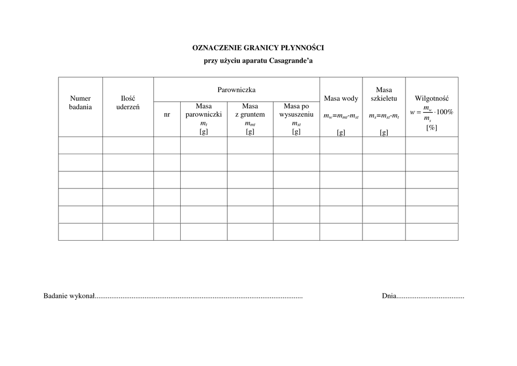 OZNACZENIE GRANICY PŁYNNOŚCI przy użyciu aparatu Casagrande’a Parowniczka Numer badania Ilość uderzeń nr Masa parowniczki mt [g] Masa z gruntem mmt [g] Masa po wysuszeniu mst [g] Badanie wykonał................................................................................................................. Masa wody Masa szkieletu mw=mmt-mst ms=mst-mt [g] [g] Wilgotność m w = w ⋅ 100% ms [%] Dnia..................................... OZNACZENIE GRANIC KONSYSTENCJI GRUNTU Granica płynności Wilgotność naturalna mt m mt m st [g] [g] Liczba uderzeń Wilgotność Parowniczka m -m w = mmtst - m stt nr [g] [%] Wilgotność Parowniczka mt m mt m st [g] [g] m -m w = mmtst - m stt nr [%] [g] Granica plastyczności 30 wL = % Wyniki badań laboratoryjnych wilgotność [%] 25 20 15 10 10 15 25 20 liczba uderzeń 30 Wilgotność naturalna wn Granica plastyczności wP Granica płynności wL Wskaźnik plastyczności IP = wL - wP = Stopień plastyczności wn - w I L = w - wP = L P 35 40 Badania wykonał:................................................................ Dnia..............................