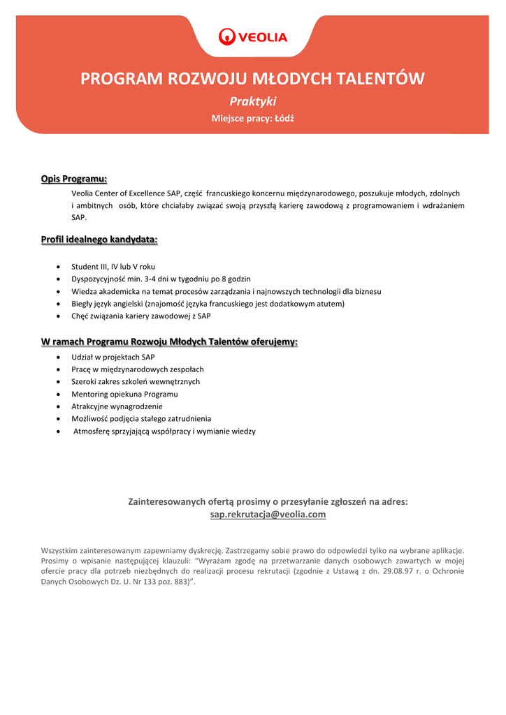 PROGRAM ROZWOJU MŁODYCH TALENTÓW Praktyki Miejsce pracy: Łódź Opis Programu: Veolia Center of Excellence SAP, część francuskiego koncernu międzynarodowego, poszukuje młodych, zdolnych i ambitnych osób, które chciałaby związać swoją przyszłą karierę zawodową z programowaniem i wdrażaniem SAP. Profil idealnego kandydata: Student III, IV lub V roku Dyspozycyjność min. 3-4 dni w tygodniu po 8 godzin Wiedza akademicka na temat procesów zarządzania i najnowszych technologii dla biznesu Biegły język angielski (znajomość języka francuskiego jest dodatkowym atutem) Chęć związania kariery zawodowej z SAP W ramach Programu Rozwoju Młodych Talentów oferujemy: Udział w projektach SAP Pracę w międzynarodowych zespołach Szeroki zakres szkoleń wewnętrznych Mentoring opiekuna Programu Atrakcyjne wynagrodzenie Możliwość podjęcia stałego zatrudnienia Atmosferę sprzyjającą współpracy i wymianie wiedzy Zainteresowanych ofertą prosimy o przesyłanie zgłoszeń na adres: [email protected] Wszystkim zainteresowanym zapewniamy dyskrecję. Zastrzegamy sobie prawo do odpowiedzi tylko na wybrane aplikacje. Prosimy o wpisanie następującej klauzuli: “Wyrażam zgodę na przetwarzanie danych osobowych zawartych w mojej ofercie pracy dla potrzeb niezbędnych do realizacji procesu rekrutacji (zgodnie z Ustawą z dn. 29.08.97 r. o Ochronie Danych Osobowych Dz. U. Nr 133 poz. 883)”.