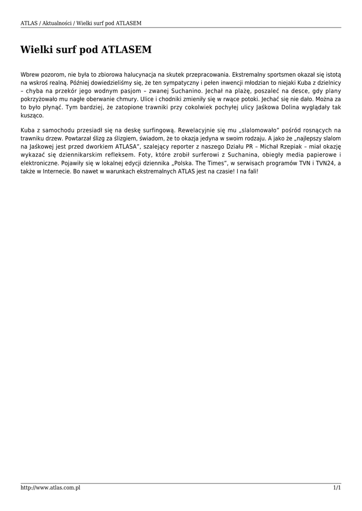 ATLAS / Aktualności / Wielki surf pod ATLASEM Wielki surf pod ATLASEM Wbrew pozorom, nie była to zbiorowa halucynacja na skutek przepracowania. Ekstremalny sportsmen okazał się istotą na wskroś realną. Później dowiedzieliśmy się, że ten sympatyczny i pełen inwencji młodzian to niejaki Kuba z dzielnicy – chyba na przekór jego wodnym pasjom – zwanej Suchanino. Jechał na plażę, poszaleć na desce, gdy plany pokrzyżowało mu nagłe oberwanie chmury. Ulice i chodniki zmieniły się w rwące potoki. Jechać się nie dało. Można za to było płynąć. Tym bardziej, że zatopione trawniki przy cokolwiek pochyłej ulicy Jaśkowa Dolina wyglądały tak kusząco. Kuba z samochodu przesiadł się na deskę surfingową. Rewelacyjnie się mu „slalomowało” pośród rosnących na trawniku drzew. Powtarzał ślizg za ślizgiem, świadom, że to okazja jedyna w swoim rodzaju. A jako że „najlepszy slalom na Jaśkowej jest przed dworkiem ATLASA”, szalejący reporter z naszego Działu PR – Michał Rzepiak – miał okazję wykazać się dziennikarskim refleksem. Foty, które zrobił surferowi z Suchanina, obiegły media papierowe i elektroniczne. Pojawiły się w lokalnej edycji dziennika „Polska. The Times”, w serwisach programów TVN i TVN24, a także w Internecie. Bo nawet w warunkach ekstremalnych ATLAS jest na czasie! I na fali! http://www.atlas.com.pl 1/1