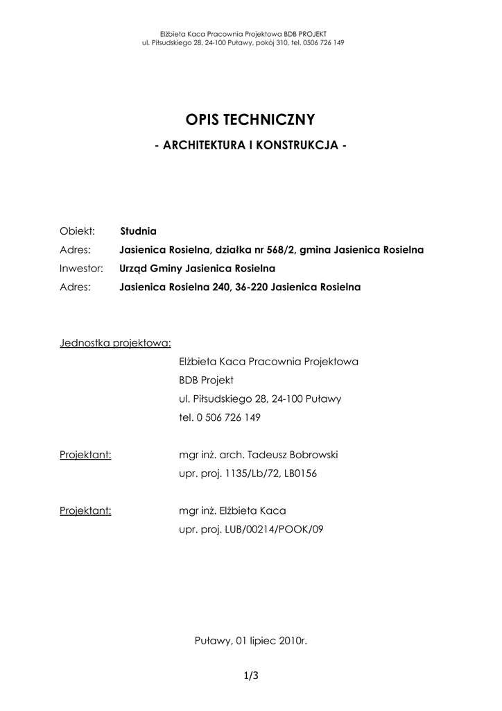 ElŜbieta Kaca Pracownia Projektowa BDB PROJEKT ul. Piłsudskiego 28, 24-100 Puławy, pokój 310, tel. 0506 726 149 OPIS TECHNICZNY - ARCHITEKTURA I KONSTRUKCJA - Obiekt: Studnia Adres: Jasienica Rosielna, działka nr 568/2, gmina Jasienica Rosielna Inwestor: Urząd Gminy Jasienica Rosielna Adres: Jasienica Rosielna 240, 36-220 Jasienica Rosielna Jednostka projektowa: ElŜbieta Kaca Pracownia Projektowa BDB Projekt ul. Piłsudskiego 28, 24-100 Puławy tel. 0 506 726 149 Projektant: mgr inŜ. arch. Tadeusz Bobrowski upr. proj. 1135/Lb/72, LB0156 Projektant: mgr inŜ. ElŜbieta Kaca upr. proj. LUB/00214/POOK/09 Puławy, 01 lipiec 2010r. 1/3 ElŜbieta Kaca Pracownia Projektowa BDB PROJEKT ul. Piłsudskiego 28, 24-100 Puławy, pokój 310, tel. 0506 726 149 I. PODSTAWA OPRACOWANIA Projekt budowlany studni projektowanej w miejscowości Jasienica Rosielna na działce 568/2, opracowano na podstawie: - projektu rewitalizacji zabytkowego parku w Jasienicy Rosielnej opracowanego przez mgr inŜ. arch. krajobrazu Magdalenę Zawadzką oraz mgr inŜ. krajobrazu Adama Zawadzkiego. II. DANE KONSTRUKCYJNO-MATERIAŁOWE Konstrukcja obiektu: Studnię wykonać z maksymalnie dwóch kręgów betonowych o średnicy około 1500mm. Około 30cm poniŜej wierzchu studni zamocować siatkę stalową o oczkach 3x3cm. Obudowę studni wykonać z drewna sosnowego lub świerkowego klasy C30 o wilgotności 15%. Na słupach o przekroju 14x14cm oparta jest konstrukcja zadaszenia obiektu. Słupki powiązane są płatewką drewnianą o przekroju 14x14cm. Nad studnią zaprojektowano dach kopertowy o kącie pochylenia 40o. Pokrycie dachowe stanowić będzie gont bitumiczny układany na płycie OSB grubości 25mm. Wykończenie obiektu: • Wykończenie dachu: podsufitka z desek boazeryjnych; 2/3 ElŜbieta Kaca Pracownia Projektowa BDB PROJEKT ul. Piłsudskiego 28, 24-100 Puławy, pokój 310, tel. 0506 726 149 • Wszystkie elementy drewniane zabezpieczyć środkami grzybobójczymi i ogniochronnymi np. Fobos M4 lub innym posiadający odpowiedni atest. Wszystkie elementy malowane na kolor biały. • Pokrycie dachu: gont bitumiczny; • Elementy kowalsko-ślusarskie: stalowe malowane na kolor biały farbą olejną chlorokauczukową na podkładzie farby miniowej. • Opaska przy obiekcie ze Ŝwiru lub kostki betonowej szerokości 100cm na ubitej podsypce piaskowej z nadaniem 3% spadku od lica ścian. Projektant: mgr inŜ. arch. Tadeusz Bobrowski upr. proj. 1135/Lb/72, LB0156 Projektant: mgr inŜ. ElŜbieta Kaca upr. proj. LUB/0033/ZOOA/10 upr. proj. LUB/00214/POOK/09 3/3