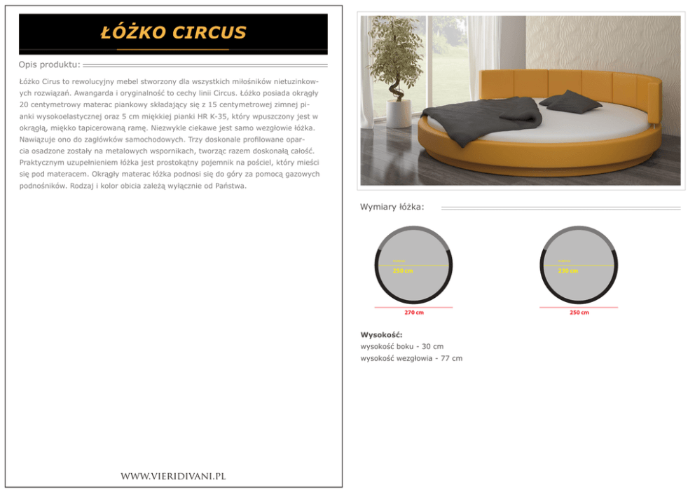 Łóżko circus Opis produktu: Łóżko Cirus to rewolucyjny mebel stworzony dla wszystkich miłośników nietuzinkowych rozwiązań. Awangarda i oryginalność to cechy linii Circus. Łóżko posiada okrągły 20 centymetrowy materac piankowy składający się z 15 centymetrowej zimnej pianki wysokoelastycznej oraz 5 cm miękkiej pianki HR K-35, który wpuszczony jest w okrągłą, miękko tapicerowaną ramę. Niezwykle ciekawe jest samo wezgłowie łóżka. Nawiązuje ono do zagłówków samochodowych. Trzy doskonale profilowane oparcia osadzone zostały na metalowych wspornikach, tworząc razem doskonałą całość. Praktycznym uzupełnieniem łóżka jest prostokątny pojemnik na pościel, który mieści się pod materacem. Okrągły materac łóżka podnosi się do góry za pomocą gazowych podnośników. Rodzaj i kolor obicia zależą wyłącznie od Państwa. Wymiary łóżka: materac materac 250 cm 230 cm 270 cm Wysokość: wysokość boku - 30 cm wysokość wezgłowia - 77 cm www.vieridivani.pl 250 cm