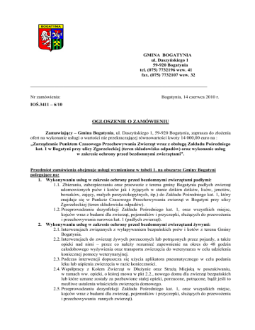 GMINA BOGATYNIA ul. Daszyńskiego 1 59-920 Bogatynia tel. (075) 7732196 wew. 41 fax. (075) 7732107 wew. 32 ___________________________________________________________________________ Nr zamówienia: Bogatynia, 14 czerwca 2010 r. IOŚ.3411 – 6/10 OGŁOSZENIE O ZAMÓWIENIU Zamawiający – Gmina Bogatynia, ul. Daszyńskiego 1, 59-920 Bogatynia, zaprasza do złoŜenia ofert na wykonanie usługi o wartości nie przekraczającej równowartości kwoty 14 000,00 euro na : „Zarządzanie Punktem Czasowego Przechowywania Zwierząt wraz z obsługą Zakładu Pośredniego kat. 1 w Bogatyni przy ulicy Zgorzeleckiej (teren składowiska odpadów) oraz wykonanie usług w zakresie ochrony przed bezdomnymi zwierzętami”. Przedmiot zamówienia obejmuje usługi wymienione w tabeli 1. na obszarze Gminy Bogatyni polegające na: 1. Wykonywaniu usług w zakresie ochrony przed bezdomnymi zwierzętami padłymi: 1.1. Zbieraniu, zabezpieczaniu oraz przewozie z terenu gminy Bogatynia padłych zwierząt udomowionych psów i kotów jak i Ŝyjących w stanie dzikim dzików, lisów, jenotów, borsuków, zajęcy, małych parzystokopytnych, itp.) do Zakładu Pośredniego kat. 1, który znajduje się w Punkcie Czasowego Przechowywania zwierząt w Bogatyni przy ulicy Zgorzeleckiej (teren składowiska odpadów). 1.2. Przeprowadzaniu dezynfekcji Zakładu Pośredniego kat. 1, oraz wszystkich miejsc, kojców wraz z budami dla zwierząt, pojemników i przyczepki, słuŜących do przewoŜenia i przechowywania surowca kat. 1 (padłych zwierząt). 2. Wykonywaniu usług w zakresie ochrony przed bezdomnymi zwierzętami Ŝywymi: 2.1. Interwencjach związanych z wyłapywaniem bezpańskich psów i kotów z terenu Gminy Bogatynia. 2.2. Interwencjach do zwierząt Ŝywych porzuconych lub potrąconych przez pojazdy, a takŜe opieki nad nimi – przez co naleŜy rozumieć zapewnienie na okres do 48 godzin całodobowego wyŜywienia oraz transportu zwierzęcia do weterynarza w celu udzielenia koniecznej pomocy weterynaryjnej. 2.3. Podczas interwencji dopuszcza się uŜycia aplikatora pneumatycznego w celu podania leku lub uśpienia zwierzęcia w razie konieczności. 2.4. Współpracy z Kołem Zwierząt w DłuŜynie oraz StraŜą Miejską w poszukiwaniu, w ramach ww. opieki, o której mowa w pkt 2.2., nowego domu dla zwierząt bezpańskich lub które uznane zostały za pozbawione stałej opieki, porzucone, potrącone, bądź jeśli to moŜliwe ustalenia właściciela zwierzęcia domowego. 2.5. Przeprowadzaniu dezynfekcji Zakładu Pośredniego kat. 1, oraz wszystkich miejsc, kojców wraz z budami dla zwierząt, pojemników i przyczepki, słuŜących do przewoŜenia i przechowywania rannych zwierząt). 3. Zarządzaniu Punktem Czasowego Przechowywania Zwierząt wraz z obsługą Zakładu Pośredniego kat. 1, który znajduje się w Bogatyni przy ulicy Zgorzeleckiej (teren składowiska odpadów) w szczególności: 3.1. Dbaniu o czystość i porządek Punktu Przechowywania Zwierząt oraz Zakładu Pośredniego kat. 1 jak i terenu wokół. 3.2. BieŜący monitoring stanu technicznego Punktu Czasowego Przechowywania Zwierząt oraz Zakładu Pośredniego kat. 1, który znajduje się w Bogatyni przy ulicy Zgorzeleckiej (teren składowiska odpadów) oraz zgłaszanie wszelkich uszkodzeń elementów oraz usterek do Urzędu Miasta. 3.3. Powiadamianiu odpowiednich słuŜb (Policja, StraŜ Miejska ) w wyniku interwencji związanych z wyłapywaniem bezpańskich psów i kotów z terenu Gminy Bogatynia. 3.4. Sukcesywnym sprzątaniu Punktu Czasowego Przechowywania Zwierząt oraz Zakładu Pośredniego kat. 1 po kaŜdej interwencji, nie rzadziej niŜ 1 razy w tygodniu. 3.5. Sukcesywnym koszeniu trawy na terenie Punktu Czasowego Przechowywania Zwierząt w sezonie wegetacyjnym zapewniającym utrzymanie wysokości trawy od 5-10 cm. Wykonawca zobowiązany jest samodzielnie ustalić ilość koszeń w trakcie trwania umowy. 3.6. Przekazywaniu padłych zwierząt (psów, kotów, dzików, lisów, jenotów, borsuków, zajęcy, małych parzystokopytnych, itp.-surowiec kat. 1) z Zakładu Pośredniego kat. 1 do Zakładu Utylizacyjnego z którym gmina ma podpisaną umowę na odbiór padłych zwierząt. Termin wykonania zamówienia Od dnia podpisania umowy do 31 marca 2011 r. Kryterium oceny ofert: Cena ofertowa (brutto) - waga 100 % Warunki jakie muszą spełnić Wykonawcy: O zamówienie publiczne mogą ubiegać się Wykonawcy, którzy spełniają niŜej wymienione warunki : 1. Posiadają moŜliwość zapewnienia zwierzętom, w razie potrzeby, opieki lekarsko – weterynaryjnej, poprzez umowę współpracy z lekarzami prowadzącymi praktykę na terenie Gminy Bogatynia. 2. Zapewnią wykonywanie usług zgodnie z obowiązującymi przepisami prawa, w szczególności z ustawą z dnia 21 sierpnia 1997 roku o ochronie zwierząt (Dz. U. z 2003 r. Nr 106 poz. 1002 z późn. zm.) oraz ustawą z dnia 11 marca 2004 r. ochronie zdrowia zwierząt i zwalczaniu chorób zakaźnych zwierząt (Dz. U. Nr 69, poz. 625 z późn. zm.), rozporządzeniem (WE) nr 1774/2002 Parlamentu Europejskiego i Rady z dnia 3 października 2002 r. ustanawiającym przepisy sanitarne dotyczące produktów ubocznych pochodzenia zwierzęcego nieprzydatne do spoŜycia przez ludzi (Dz. U. WE l 273 z 10.10.2002 r.). 3. Posiadają prawo jazdy kat. B, oraz oznakowany i odpowiednio wyposaŜony w pojemniki środek transportu do przewozu zwierząt rannych i padłych. Istotne postanowienia umowy: 1. Umowa winna być zawarta na czas określony do dnia 31 marca 2011 r. 2. Maksymalna wartość wynagrodzenia nie moŜe przekroczyć kwoty 40 000,00 zł brutto. 3. Zmawiający będzie wymagał od Wykonawcy, aby Wykonawca zobowiązał się do świadczenia przedmiotu umowy : w okresie letnim do 6 godzin od zgłoszenia, w okresie zimowym do 10 godzin od zgłoszenia, Z tytułu świadczenia usług w dni wolne od pracy wykonawcy nie przysługują jakiekolwiek dodatkowe świadczenia. 4. Płatności będą dokonywane przelewem na rachunek banko