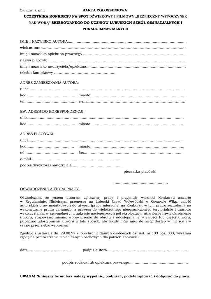 KARTA ZGŁOSZENIOWA Załącznik nr 1 UCZESTNIKA KONKURSU NA SPOT DŹWIĘKOWY I FILMOWY „BEZPIECZNY WYPOCZYNEK NAD WODĄ” SKIEROWANEGO DO UCZNIÓW LUBUSKICH SZKÓŁ GIMNAZJALNYCH I PONADGIMNAZJALNYCH IMIĘ I NAZWISKO AUTORA:....................................................................................................... wiek autora:………………………………..………………………………………………………………………… imię i nazwisko opiekuna prawnego …………………………………………………………………………… nazwa placówki ......................................................................................................................... imię i nazwisko nauczyciela/opiekuna........................................................................................ telefon kontaktowy ……………………………………………. ADRES ZAMIESZKANIA AUTORA: ulica.......................................................................................................................................... kod........................................... miasto.................................................................................... tel............................................. e-mail………………………………………………………………………. EW. ADRES DO KORESPONDENCJI: ulica......................................................................................................................................... kod........................................... miasto.................................................................................. ADRES PLACÓWKI: ulica......................................................................................................................................... kod.......................................... miasto................................................................................... tel............................................ fax........................................................................................ e-mail................................................................................ podpis dyrektora/nauczyciela............................................. pieczątka placówki ................................................ OŚWIADCZENIE AUTORA PRACY: Oświadczam, że jestem autorem zgłoszonej pracy i przyjmuję warunki Konkursu zawarte w Regulaminie. Niniejszym przenoszę na Lubuski Urząd Wojewódzki w Gorzowie Wlkp. całość autorskich praw majątkowych do utworu (pracy zgłoszonej na Konkurs), w tym prawo zezwalania na wykonywanie prawa zależnego, z prawem do wielokrotnego nieograniczonego terytorialnie i czasowo wykorzystania, w szczególności w zakresie następujących pól eksploatacji: utrwalenie i zwielokrotnienie utworu, rozpowszechnienie, wprowadzenie do obrotu i udostępnianie w całości lub części utworu, publiczne udostępnienie utworu w taki sposób, aby każdy mógł mieć do niego dostęp w miejscu i w czasie przez siebie wybranym. Zgodnie z ustawą z dn. 29.08.97 r. o ochronie danych osobowych dz. ust. nr 133 poz. 883, wyrażam zgodę na przetwarzanie moich danych osobowych dla potrzeb Konkursu. data....................................... podpis autora........................................................................ podpis rodzica lub opiekuna prawnego.................................................... UWAGA! Niniejszy formularz należy wypełnić, podpisać, podstemplować i dołączyć do pracy.