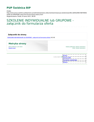 PUP Świdnica BIP Źródło: http://www.praca.swidnica.pl/bip/menu-przedmiotowe/wzory-dokumentow/instytucje-szkoleniowe/361,SZKOLENIE-INDYWIDU ALNE-lub-GRUPOWE-zalacznik-do-formularza-oferta.html Wygenerowano: Środa, 8 marca 2017, 08:30 SZKOLENIE INDYWIDUALNE lub GRUPOWE załącznik do formularza oferta Załączniki do strony SZKOLENIE INDYWIDUALNE lub GRUPOWE - załącznik do formularza oferta 342 KB Metryka strony Data publikacji 11.07.2014 Rejestr zmian Osoba publikująca: Patryk Lewinowicz Autor: Patryk Lewinowicz Liczba wejść: 328 Drukuj Generuj PDF Powiadom znajomego Wstecz