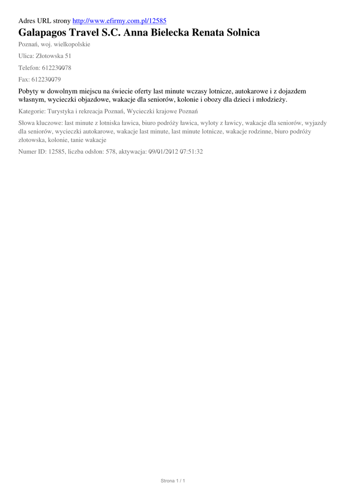 Adres URL strony http://www.efirmy.com.pl/12585 Galapagos Travel S.C. Anna Bielecka Renata Solnica Poznań, woj. wielkopolskie Ulica: Złotowska 51 Telefon: 612230078 Fax: 612230079 Pobyty w dowolnym miejscu na świecie oferty last minute wczasy lotnicze, autokarowe i z dojazdem własnym, wycieczki objazdowe, wakacje dla seniorów, kolonie i obozy dla dzieci i młodzieży. Kategorie: Turystyka i rekreacja Poznań, Wycieczki krajowe Poznań Słowa kluczowe: last minute z lotniska ławica, biuro podróży ławica, wyloty z ławicy, wakacje dla seniorów, wyjazdy dla seniorów, wycieczki autokarowe, wakacje last minute, last minute lotnicze, wakacje rodzinne, biuro podróży złotowska, kolonie, tanie wakacje Numer ID: 12585, liczba odsłon: 578, aktywacja: 09/01/2012 07:51:32 Strona 1 / 1