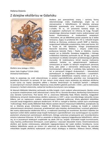 Helena Dzienis Z dziejów ekslibrisu w Gdańsku Ekslibris jest powszechniej znaną i cenioną formą własnościowego znaku książkowego, wiąże się on nierozerwalnie z bibliofilstwem. W Gdańsku pierwsze biblioteki powstawały przy kościołach i klasztorach, u schyłku XII w., ich powstanie bardziej wiąże się ze względami utylitarnymi niż miłością do ksiąg. Początki świadomego zbieractwa książek można zaobserwować pod koniec średniowiecza, w środowiskach związanych z Kościołem, ale jej bibliofilska postać pojawiła się w dobie renesansu. Żyjący na przełomie XIV i XV w. miłośnik książek Andrzej ze Słomowa, proboszcz parafii NMP w Gdańsku, zorganizował bibliotekę przykościelną, która pod koniec XIV w liczyła ok. 140 rękopisów. Innego przedstawiciela hierarchii kościelnej Waltera z Chojnic (1445-1512), proboszcza kościoła Piotra i Pawła w Gdańsku musimy uważać już za bibliofila. Posiadany księgozbiór, z którego w Bibliotece Gdańskiej zachowało się ok. 30 egz., sygnował wyciskanym na okładce stemplem przedstawiającym główkę murzynka. W średniowieczu istniał zwyczaj malowania rodowych herbów na rękopiśmiennych kodeksach. Umieszczano je zwykle na dolnych marginesach pierwszej karty, jako jeden z elementów dekoracyjnej bordiury Ekslibris Jana Jaskego z 1554 r. iluminowanych rękopisów. Z praktyką taką spotykamy się też w pierwszych księgach drukowanych – inkunabułach Autor: Solis Virgilius? (1514–1562) pochodzących ze księgozbioru Bażyńskich i Luzyańskich. drzeworyt kolorowany O świadomym bibliofilstwie możemy mówić już w XV w., kiedy to pojawiają się znaki własnościowe, w postaci superekslibrisów, gmerków oraz monogramów posiadacza tłoczonych na oprawie. W tym samym mniej więcej czasie pojawiają się właściwe ekslibrisy, to jest ryciny czy napisy specjalnie odbite z klocków drewnianych na osobnych kartach i naklejane na wewnętrznych stronach okładek. Najstarszy znany ekslibris gdański pochodzi z 1554 r., jest to kolorowany drzeworyt z herbem właściciela, należał do handlarza bursztynem Jana Jaskego. W zbiorach Biblioteki Gdańskiej zachowało się kilka książek z tymi znakami własnościowymi. Bardzo cenne są wczesne miedziorytowe znaki własnościowe z końca XVI w. Gerarda Brandesa, Bartłomieja Schachmanna oraz Gerarda Cymermana. Pod koniec XVI w. utworzono Bibliotekę Rady Miasta Gdańska, księgozbiór biblioteczny otrzymał miedziorytowy ekslibris wykonany w 1597 r. przez norymberskiego rytownika Jonasa Silbera, jest on najstarszym znakiem własnościowym biblioteki publicznej. Wielu gdańskich bibliofilów znaczyło swoje księgozbiory pięknymi ekslibrisami. W XVII w. nastąpił w Gdańsku rozkwit życia umysłowego i kulturalnego. Rosły zasoby Biblioteki Rady Miasta zasilane darami miejscowych bibliofilów, powiększała się też w Gdańsku grupa miłośników książek. W Bibliotece Gdańskiej znajdują się książki ze znakami własnościowymi zamożnych mieszczan, przedstawicieli rady miejskiej, duchowieństwa i uczonych gdańskich. Nie znamy wykonawców ekslibrisów XVII w., w większości pozostają oni anonimowi. Burmistrz Gdańska Jan Speimann (1563-1625) ozdabiał swoje książki herbowym superekslibrisem oraz wyróżniającym się wysokim poziomem artystycznym portretowym ekslibrisem, którego autorstwo przypisywane jest norymberskiemu artyście Łukaszowi Kilianowi. W XVIII w. powstało w Gdańsku najwięcej księgozbiorów bibliofilskich, oblicza się, że w prywatnych kolekcjach znajdowało się około 250 tys. książek. Gromadzili książki burmistrzowie, rajcy, ławnicy, profesorowie Gimnazjum, uczeni gdańscy i zwyczajni obywatele miasta. Osiemnastowieczny ekslibris jest bardzo zróżnicowany, jakkolwiek najpopularniejszy był nadal ekslibris heraldyczny. Liczne kolekcje bibliofilskie weszły po śmierci ich właścicieli do zbiorów Biblioteki Rady Miasta. Na potrzeby miłośników książek ekslibrisy wykonywali znani artyści działający w Gdańsku: Mateusz Deisch, Mikołaj Lange, Fryderyk Lohrmann i Daniel Chodowiecki. Gdańszczanie z wojaży zagranicznych przywozili wykonane dla nich przez artystów niemieckich i angielskich grafiki ekslibrisowe. Z początkiem XIX w. pojawia się nowy typ znaku własnościowego - ekslibris kaligraficzny przypominający wizytówki, jest on sporządzany w różnych technikach graficznych. Darowizny bibliotek prywatnych, które zasiliły zbiory gdańskiej książnicy pod koniec XIX w. otrzymały drukowane ekslibrisy donacyjne. Gdańskie ekslibrisy tego wieku nie są zbyt liczne, ale odzwierciedlają one aktualne prądy artystyczne. W XX wieku ekslibris zaczął tracić swoją pierwotną funkcję, ta mała forma graficzna stała się obiektem poszukiwań coraz liczniejszych rzeszy kolekcjonerów. Coraz rzadziej bywa on naklejany na książki, ale jest przechowywany w tekach graficznych. Wynikiem tych przemian jest fakt, że ekslibris przestał być dokumentem istnienia biblioteki, lecz jest jedynie świadectwem wypowiedzi artystycznej w miniaturze graficznej. Wśród artystów gdańskich tworzących ekslibrisy na szczególną uwagę zasługują prace: Stanisława Rolicza (1913-1997), Ryszarda Stryjca (1932-1997), Wawrzyńca Sampa 1939-2013), Henryka Feilhauera 1942-1999), a przede wszystkim mistrza miedziorytu Wojciecha Jakubowskiego (ur. 1929). Zapoczątkowane w 1963 r. w Muzeum Zamkowym w Malborku międzynarodowe biennale ekslibrisu współczesnego przyczyniło się bardzo do spopularyzowania tych małych form graficznych, stało się również płaszczyzną, na której artyści z różnych stron świata Ekslibris Centralnego Muzeum i różnych kultur spotykali się i mogli wymieniać doświadczenia. Morskiego w Gdańsku z 1996 r. Na przestrzeni wieloletniej historii malborskiego Biennale autor: Jakubowski Wojciech (1929-) Ekslibrisu widać, jak wielkie zmiany dokonały się w tej dziedzinie. miedzioryt Z dedykowaneg