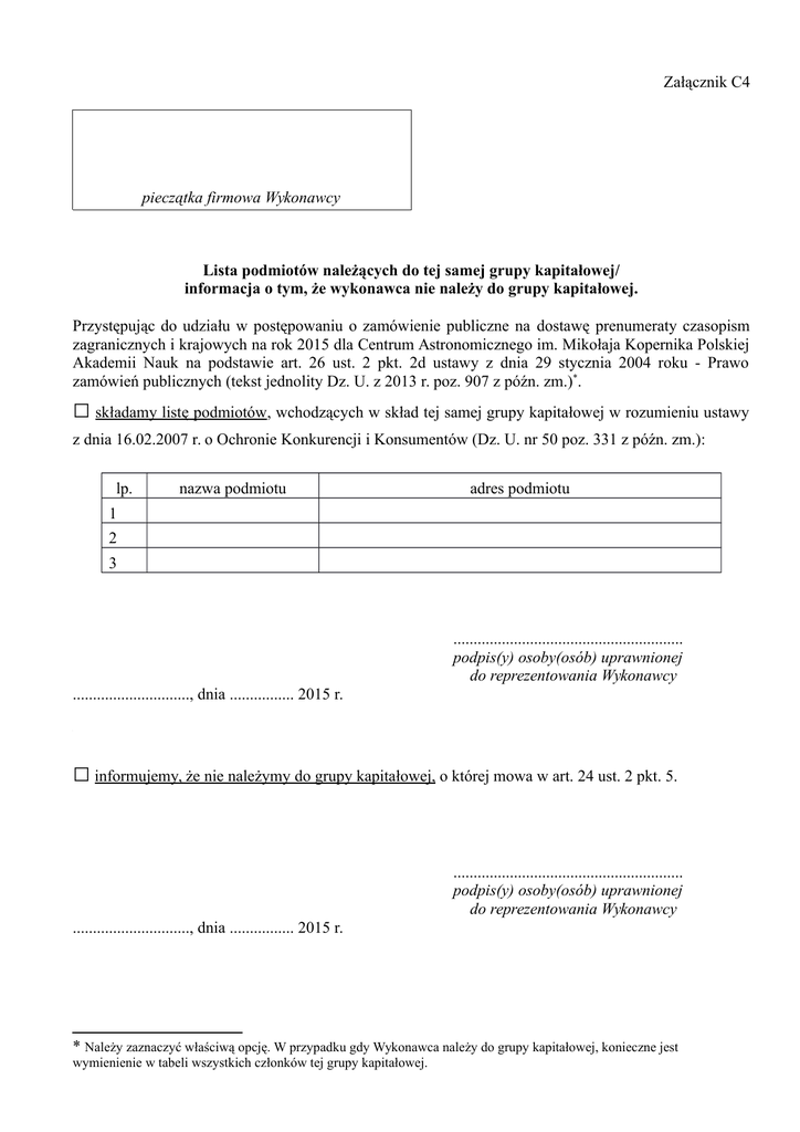 Załącznik C4 pieczątka firmowa Wykonawcy Lista podmiotów należących do tej samej grupy kapitałowej/ informacja o tym, że wykonawca nie należy do grupy kapitałowej. Przystępując do udziału w postępowaniu o zamówienie publiczne na dostawę prenumeraty czasopism zagranicznych i krajowych na rok 2015 dla Centrum Astronomicznego im. Mikołaja Kopernika Polskiej Akademii Nauk na podstawie art. 26 ust. 2 pkt. 2d ustawy z dnia 29 stycznia 2004 roku - Prawo zamówień publicznych (tekst jednolity Dz. U. z 2013 r. poz. 907 z późn. zm.)*. □ składamy listę podmiotów, wchodzących w skład tej samej grupy kapitałowej w rozumieniu ustawy z dnia 16.02.2007 r. o Ochronie Konkurencji i Konsumentów (Dz. U. nr 50 poz. 331 z późn. zm.): lp. nazwa podmiotu adres podmiotu 1 2 3 ......................................................... podpis(y) osoby(osób) uprawnionej do reprezentowania Wykonawcy ............................., dnia ................ 2015 r. □ informujemy, że nie należymy do grupy kapitałowej, o której mowa w art. 24 ust. 2 pkt. 5. ......................................................... podpis(y) osoby(osób) uprawnionej do reprezentowania Wykonawcy ............................., dnia ................ 2015 r. * Należy zaznaczyć właściwą opcję. W przypadku gdy Wykonawca należy do grupy kapitałowej, konieczne jest wymienienie w tabeli wszystkich członków tej grupy kapitałowej.