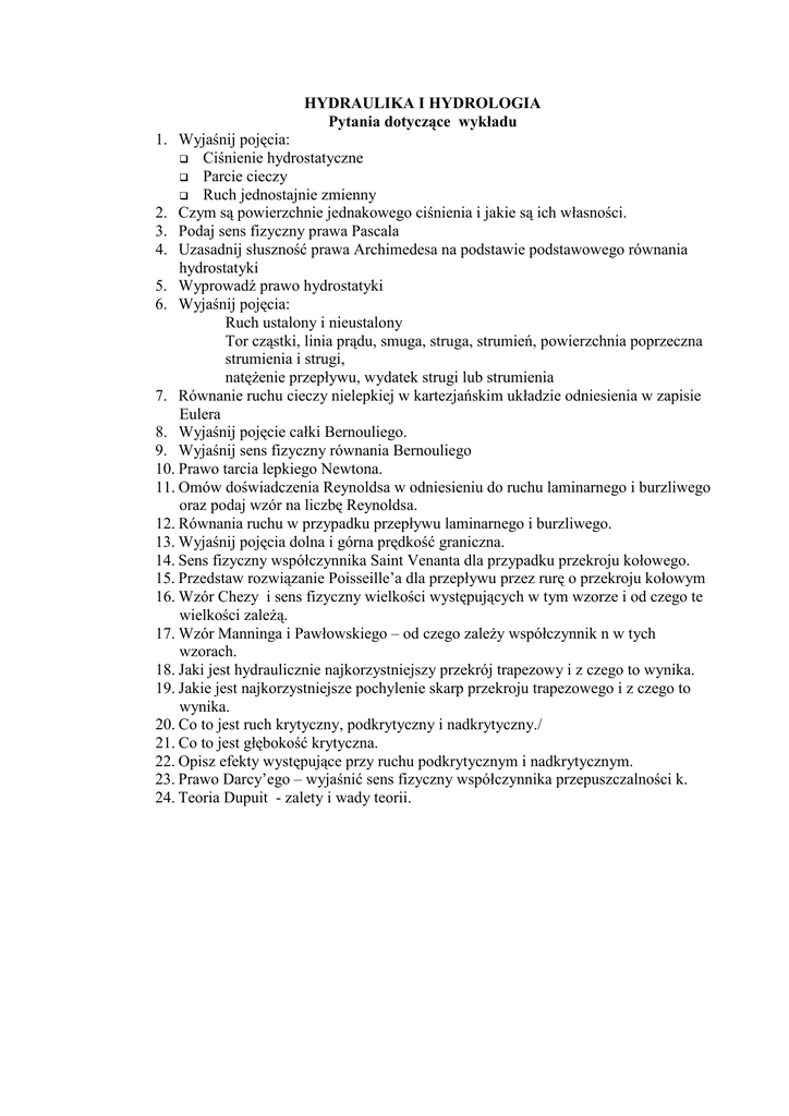 HYDRAULIKA I HYDROLOGIA Pytania dotyczące wykładu 1. Wyjaśnij pojęcia: Ciśnienie hydrostatyczne Parcie cieczy Ruch jednostajnie zmienny 2. Czym są powierzchnie jednakowego ciśnienia i jakie są ich własności. 3. Podaj sens fizyczny prawa Pascala 4. Uzasadnij słuszność prawa Archimedesa na podstawie podstawowego równania hydrostatyki 5. Wyprowadź prawo hydrostatyki 6. Wyjaśnij pojęcia: Ruch ustalony i nieustalony Tor cząstki, linia prądu, smuga, struga, strumień, powierzchnia poprzeczna strumienia i strugi, natężenie przepływu, wydatek strugi lub strumienia 7. Równanie ruchu cieczy nielepkiej w kartezjańskim układzie odniesienia w zapisie Eulera 8. Wyjaśnij pojęcie całki Bernouliego. 9. Wyjaśnij sens fizyczny równania Bernouliego 10. Prawo tarcia lepkiego Newtona. 11. Omów doświadczenia Reynoldsa w odniesieniu do ruchu laminarnego i burzliwego oraz podaj wzór na liczbę Reynoldsa. 12. Równania ruchu w przypadku przepływu laminarnego i burzliwego. 13. Wyjaśnij pojęcia dolna i górna prędkość graniczna. 14. Sens fizyczny współczynnika Saint Venanta dla przypadku przekroju kołowego. 15. Przedstaw rozwiązanie Poisseille’a dla przepływu przez rurę o przekroju kołowym 16. Wzór Chezy i sens fizyczny wielkości występujących w tym wzorze i od czego te wielkości zależą. 17. Wzór Manninga i Pawłowskiego – od czego zależy współczynnik n w tych wzorach. 18. Jaki jest hydraulicznie najkorzystniejszy przekrój trapezowy i z czego to wynika. 19. Jakie jest najkorzystniejsze pochylenie skarp przekroju trapezowego i z czego to wynika. 20. Co to jest ruch krytyczny, podkrytyczny i nadkrytyczny./ 21. Co to jest głębokość krytyczna. 22. Opisz efekty występujące przy ruchu podkrytycznym i nadkrytycznym. 23. Prawo Darcy’ego – wyjaśnić sens fizyczny współczynnika przepuszczalności k. 24. Teoria Dupuit - zalety i wady teorii.