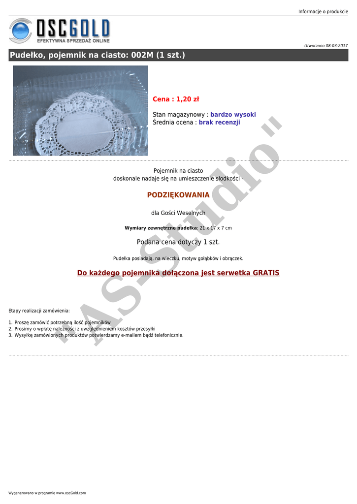 Informacje o produkcie Utworzono 08-03-2017 Pudełko, pojemnik na ciasto: 002M (1 szt.) Cena : 1,20 zł o" Stan magazynowy : bardzo wysoki Średnia ocena : brak recenzji ud i Pojemnik na ciasto doskonale nadaje się na umieszczenie słodkości - PODZIĘKOWANIA dla Gości Weselnych Wymiary zewnętrzne pudełka: 21 x 17 x 7 cm St Podana cena dotyczy 1 szt. Pudełka posiadają, na wieczku, motyw gołąbków i obrączek. Etapy realizacji zamówienia: S- Do każdego pojemnika dołączona jest serwetka GRATIS "A 1. Proszę zamówić potrzebną ilość pojemników 2. Prosimy o wpłatę należności z uwzględnieniem kosztów przesyłki 3. Wysyłkę zamówionych produktów potwierdzamy e-mailem bądź telefonicznie. Wygenerowano w programie www.oscGold.com