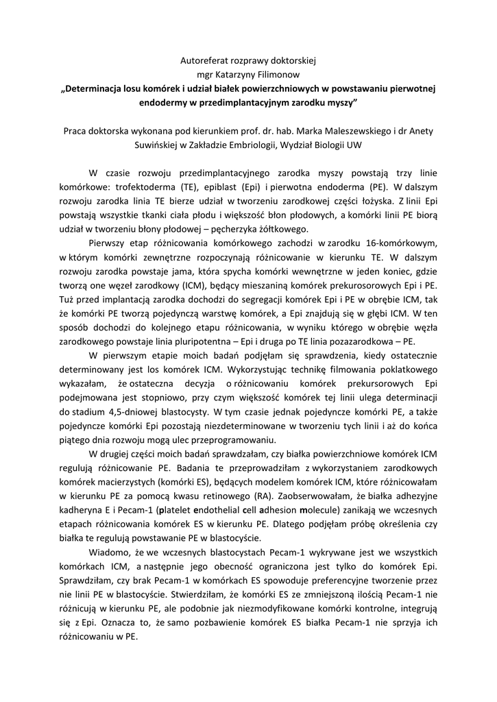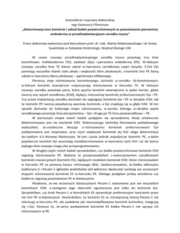 Autoreferat rozprawy doktorskiej mgr Katarzyny Filimonow „Determinacja losu komórek i udział białek powierzchniowych w powstawaniu pierwotnej endodermy w przedimplantacyjnym zarodku myszy” Praca doktorska wykonana pod kierunkiem prof. dr. hab. Marka Maleszewskiego i dr Anety Suwińskiej w Zakładzie Embriologii, Wydział Biologii UW W czasie rozwoju przedimplantacyjnego zarodka myszy powstają trzy linie komórkowe: trofektoderma (TE), epiblast (Epi) i pierwotna endoderma (PE). W dalszym rozwoju zarodka linia TE bierze udział w tworzeniu zarodkowej części łożyska. Z linii Epi powstają wszystkie tkanki ciała płodu i większość błon płodowych, a komórki linii PE biorą udział w tworzeniu błony płodowej – pęcherzyka żółtkowego. Pierwszy etap różnicowania komórkowego zachodzi w zarodku 16-komórkowym, w którym komórki zewnętrzne rozpoczynają różnicowanie w kierunku TE. W dalszym rozwoju zarodka powstaje jama, która spycha komórki wewnętrzne w jeden koniec, gdzie tworzą one węzeł zarodkowy (ICM), będący mieszaniną komórek prekurosorowych Epi i PE. Tuż przed implantacją zarodka dochodzi do segregacji komórek Epi i PE w obrębie ICM, tak że komórki PE tworzą pojedynczą warstwę komórek, a Epi znajdują się w głębi ICM. W ten sposób dochodzi do kolejnego etapu różnicowania, w wyniku którego w obrębie węzła zarodkowego powstaje linia pluripotentna – Epi i druga po TE linia pozazarodkowa – PE. W pierwszym etapie moich badań podjęłam się sprawdzenia, kiedy ostatecznie determinowany jest los komórek ICM. Wykorzystując technikę filmowania poklatkowego wykazałam, że ostateczna decyzja o różnicowaniu komórek prekursorowych Epi podejmowana jest stopniowo, przy czym większość komórek tej linii ulega determinacji do stadium 4,5-dniowej blastocysty. W tym czasie jednak pojedyncze komórki PE, a także pojedyncze komórki Epi pozostają niezdeterminowane w tworzeniu tych linii i aż do końca piątego dnia rozwoju mogą ulec przeprogramowaniu. W drugiej części moich badań sprawdzałam, czy białka powierzchniowe komórek ICM regulują różnicowanie PE. Badania te przeprowadziłam z wykorzystaniem zarodkowych komórek macierzystych (komórki ES), będących modelem komórek ICM, które różnicowałam w kierunku PE za pomocą kwasu retinowego (RA). Zaobserwowałam, że białka adhezyjne kadheryna E i Pecam-1 (platelet endothelial cell adhesion molecule) zanikają we wczesnych etapach różnicowania komórek ES w kierunku PE. Dlatego podjęłam próbę określenia czy białka te regulują powstawanie PE w blastocyście. Wiadomo, że we wczesnych blastocystach Pecam-1 wykrywane jest we wszystkich komórkach ICM, a następnie jego obecność ograniczona jest tylko do komórek Epi. Sprawdziłam, czy brak Pecam-1 w komórkach ES spowoduje preferencyjne tworzenie przez nie linii PE w blastocyście. Stwierdziłam, że komórki ES ze zmniejszoną ilością Pecam-1 nie różnicują w kierunku PE, ale podobnie jak niezmodyfikowane komórki kontrolne, integrują się z Epi. Oznacza to, że samo pozbawienie komórek ES białka Pecam-1 nie sprzyja ich różnicowaniu w PE. Podjęłam się także zbadania lokalizacji kadheryny E w komórkach blastocysty oraz sprawdzenia jej roli w tworzeniu PE. Wykazałam, że we wczesnych blastocystach poziom kadheryny E pomiędzy komórkami prekursorowymi PE oraz Epi jest podobny. Natomiast w późnych blastocystach pomiędzy komórkami PE jest mniej kadheryny E niż pomiędzy komórkami Epi. Wykazałam, że w komórkach PE, które znajdują się na powierzchni ICM, lokalizacja kadheryny E jest spolaryzowana – brak jej w apikalnej części błony, a jest obecna w jej części bocznej i podstawnej. Dodatkowo, zaobserwowałam jądrową lokalizację kadheryny E w komórkach PE, co może mieć znaczenie w ochronie komórek tej linii przed apoptozą. Wykazałam, że po segregacji komórek ICM, ilość mRNA kadheryny E w komórkach linii PE jest mniejsza niż w komórkach Epi. Zatem poziom kadheryny E podczas segregacji komórek ICM jest regulowany na poziomie transkrypcji. Zbadałam również wpływ obniżenia poziomu kadheryny E (przy użyciu dsRNA) na kierunek różnicowania blastomerów. Nie zaobserwowałam jednak preferencyjnej lokalizacji komórek wywodzących się z blastomerów z obniżoną ilością kadheryny E. Wynik ten może sugerować, że zmiany poziomu kadheryny E nie są bezpośrednio odpowiedzialne za różnicowanie PE. Sprawdziłam także, że w moim układzie doświadczalnym brak kadheryny E nie był kompensowany ekspresją kadheryny N. Obniżona ilość kadheryny E, przy jednoczesnej obecności kadheryny N, wimentyny oraz białka Snail są cechami procesu EMT (ang. epithelial – mesenchymal transition). Tuż po implantacji blastocysty PE rozprzestrzenia się po wewnętrznej stronie TE. Dlatego też sugeruje się, że w powstawanie PE zaangażowany jest proces EMT. Zaobserwowałam, że wimentyna obecna jest w komórkach PE jedynie w późnych blastocystach, w stadium okołoimplantacyjnym. Kadheryny N nie zaobserwowałam w żadnym z badanych przeze mnie stadiów rozwoju zarodka. Wykazałam natomiast, że zarówno we wczesnych, jak i późnych blastocystach w jądrach komórkowych komórek ICM obecny jest czynnik transkrypcyjny Snail, będący inhibitorem ekspresji kadheryny E. Jego obecność, w połączeniu z wykrytym przeze mnie obniżeniem ilości kadheryny E między komórkami ICM oraz obecnością wimentyny w komórkach PE wskazywać może, że w komórkach tej linii może zachodzić proces przemiany nabłonkowo-mezenchymalna (EMT) lub proces do niej podobny.