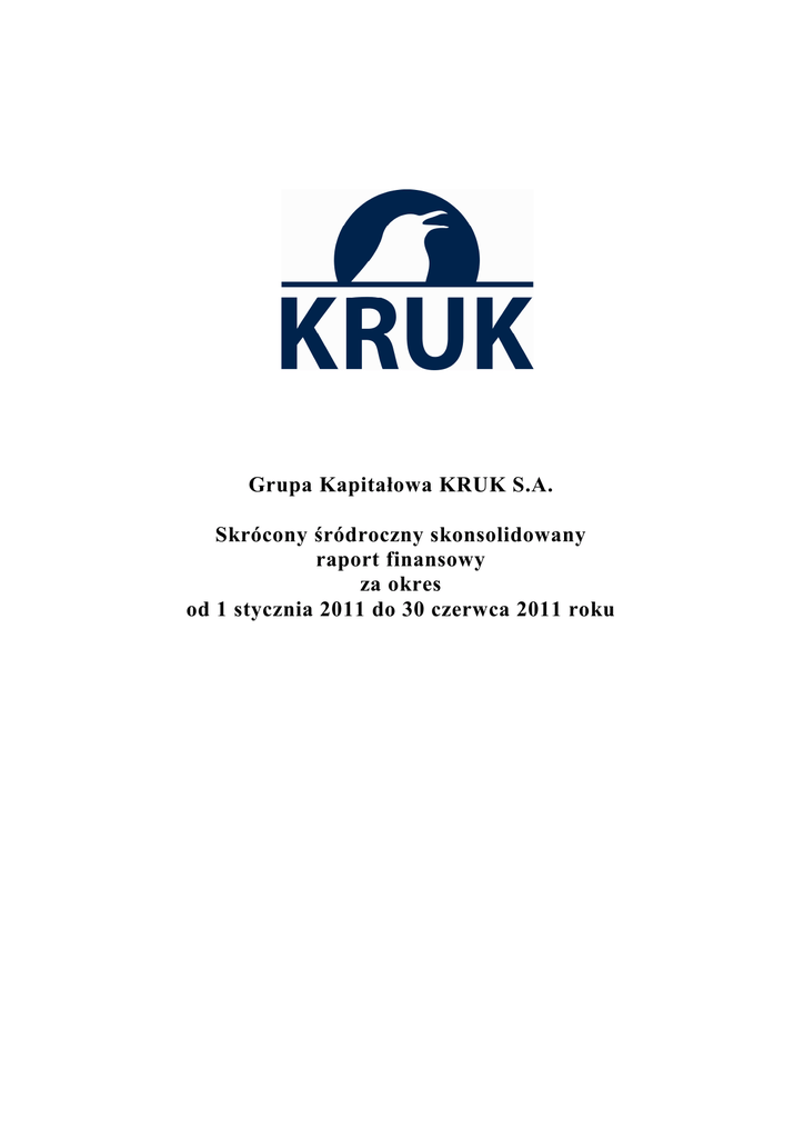 Grupa Kapitałowa KRUK S.A. Skrócony śródroczny skonsolidowany raport finansowy za okres od 1 stycznia 2011 do 30 czerwca 2011 roku Grupa Kapitałowa Kruk S.A. Spis treści I. 1. 2. Wybrane dane finansowe ........................................................................................................................................... 4 Dane skonsolidowane ............................................................................................................................................ 4 Dane jednostkowe KRUK S.A. ............................................................................................................................. 5 II. Raport biegłego rewidenta z przeglądu skróconego śródrocznego skonsolidowanego sprawozdania finansowego za okres od 1 stycznia do 30 czerwca 2011r. .......................................................................................................................... 6 III. Skrócone śródroczne skonsolidowane sprawozdanie finansowe za okres od 1 stycznia do 30 czerwca 2011 r. ...... 8 Skrócone śródroczne skonsolidowane sprawozdanie z sytuacji finansowej .................................................................. 8 Skrócone śródroczne skonsolidowane sprawozdanie z całkowitych dochodów ............................................................ 9 Skrócone śródroczne skonsolidowane sprawozdanie ze zmian w kapitale własnym ................................................... 10 Skrócone śródroczne skonsolidowane sprawozdanie z przepływów pieniężnych ....................................................... 11 Noty objaśniające do skróconego śródrocznego skonsolidowanego sprawozdania finansowego ................................ 12 1. Opis organizacji grupy kapitałowej KRUK S.A .................................................................................................. 12 2. Okres objęty sprawozdaniem ............................................................................................................................... 14 3. Oświadczenie o zgodności ................................................................................................................................... 14 4. Opis przyjętych zasad rachunkowości ................................................................................................................. 15 5. Dokonane osądy i szacunki ................................................................................................................................. 15 6. Zarządzanie ryzykiem finansowym ..................................................................................................................... 16 7. Segmenty działalności ......................................................................................................................................... 16 8. Informacja na temat sezonowości lub cykliczności działalności ......................................................................... 19 9. Rodzaj oraz kwoty zmian wartości szacunkowych kwot, które były podawane w poprzednich latach obrotowych wywierające istotny wpływ na bieżący okres ........................................................................................... 19 10. Rodzaj oraz kwoty pozycji wpływających na aktywa, pasywa, kapitał wynik netto lub przepływy środków pieniężnych, które są istotne ze względu na ich rodzaj, wielkość lub wywierany wpływ ........................................... 20 11. Opis istotnych dokonań lub niepowodzeń Grupy w okresie raportowania wraz z najistotniejszymi zdarzeniami ich dotyczącymi............................................................................................................................................................ 22 12. Opis czynników i zdarzeń, w szczególności o nietypowym charakterze, mających znaczny wpływ na osiągnięte wyniki finansowe ......................................................................................................................................................... 22 13. Informacja dotycząca emisji, wykupu i spłaty nieudziałowych i kapitałowych papierów wartościowych ......... 23 14. Informacja dotycząca wypłaconej (lub zadeklarowanej) dywidendy .................................................................. 23 15. Zdarzenia po dniu bilansowym, nieujęte w sprawozdaniu, a mogące w znaczący sposób wpłynąć na przyszłe wyniki ........................................................................................................................................................................... 23 16. Informacja na temat zmian zobowiązań warunkowych lub aktywów warunkowych, które nastąpiły od czasu zakończenia ostatniego roku obrotowego..................................................................................................................... 24 IV. Raport biegłego rewidenta z przeglądu skróconego śródrocznego jednostkowego sprawozdania finansowego za okres od 1 stycznia do 30 czerwca 2011r. ........................................................................................................................ 25 V. Skrócone śródroczne jednostkowe sprawozdanie finansowe za okres od 1 stycznia do 30 czerwca 2011 r. ......... 27 Skrócone śródroczne jednostkowe sprawozdanie z sytuacji finansowej ...................................................................... 27 Skrócone śródroczne jednostkowe sprawozdanie z całkowitych dochodów ................................................................ 28 Skrócone śródroczne jednostkowe sprawozdanie ze zmian w kapitale własnym......................................................... 29 Skrócone śródroczne jednostkowe sprawozdanie z przepływów pieniężnych ............................................................. 30 Noty objaśniające do skróconego śródrocznego jednostkowego sprawozdania finansowego .......................