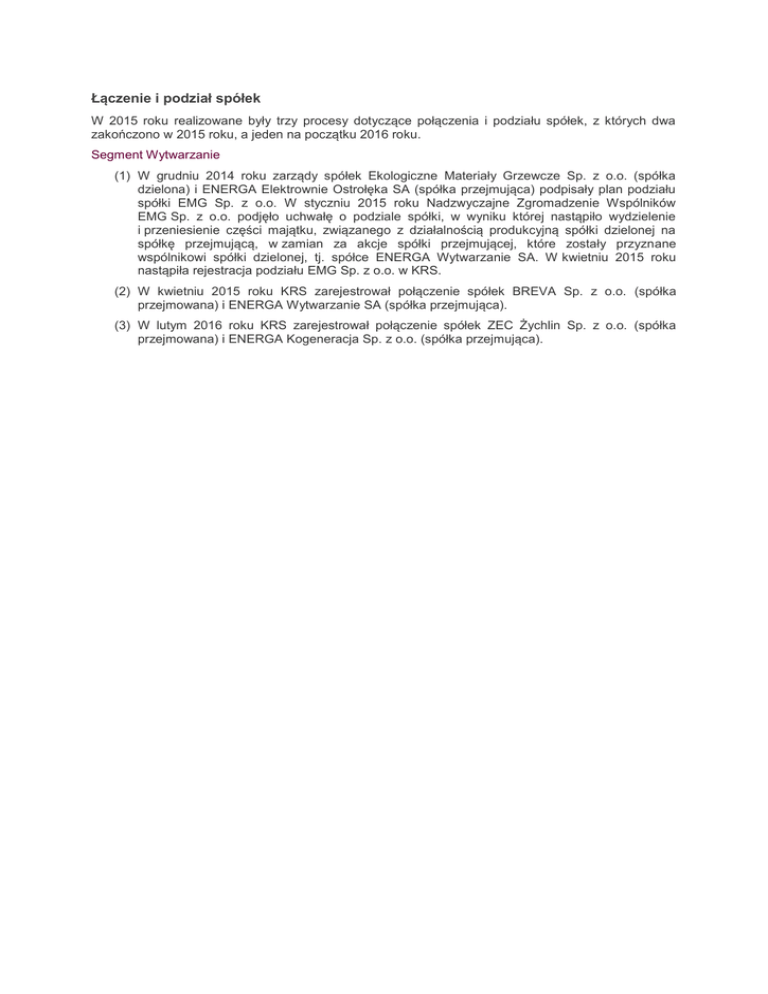 Łączenie i podział spółek W 2015 roku realizowane były trzy procesy dotyczące połączenia i podziału spółek, z których dwa zakończono w 2015 roku, a jeden na początku 2016 roku. Segment Wytwarzanie (1) W grudniu 2014 roku zarządy spółek Ekologiczne Materiały Grzewcze Sp. z o.o. (spółka dzielona) i ENERGA Elektrownie Ostrołęka SA (spółka przejmująca) podpisały plan podziału spółki EMG Sp. z o.o. W styczniu 2015 roku Nadzwyczajne Zgromadzenie Wspólników EMG Sp. z o.o. podjęło uchwałę o podziale spółki, w wyniku której nastąpiło wydzielenie i przeniesienie części majątku, związanego z działalnością produkcyjną spółki dzielonej na spółkę przejmującą, w zamian za akcje spółki przejmującej, które zostały przyznane wspólnikowi spółki dzielonej, tj. spółce ENERGA Wytwarzanie SA. W kwietniu 2015 roku nastąpiła rejestracja podziału EMG Sp. z o.o. w KRS. (2) W kwietniu 2015 roku KRS zarejestrował połączenie spółek BREVA Sp. z o.o. (spółka przejmowana) i ENERGA Wytwarzanie SA (spółka przejmująca). (3) W lutym 2016 roku KRS zarejestrował połączenie spółek ZEC Żychlin Sp. z o.o. (spółka przejmowana) i ENERGA Kogeneracja Sp. z o.o. (spółka przejmująca).