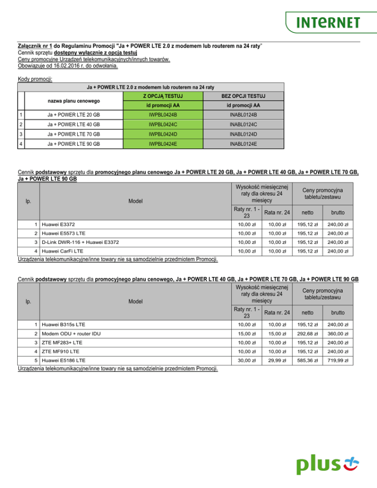 Załącznik nr 1 do Regulaminu Promocji "Ja + POWER LTE 2.0 z modemem lub routerem na 24 raty” Cennik sprzętu dostępny wyłącznie z opcją testuj Ceny promocyjne Urządzeń telekomunikacyjnych/innych towarów. Obowiązuje od 16.02.2016 r. do odwołania. Kody promocji: Ja + POWER LTE 2.0 z modemem lub routerem na 24 raty nazwa planu cenowego Z OPCJĄ TESTUJ BEZ OPCJI TESTUJ id promocji AA id promocji AA 1 Ja + POWER LTE 20 GB IWPBL0424B INABL0124B 2 Ja + POWER LTE 40 GB IWPBL0424C INABL0124C 3 Ja + POWER LTE 70 GB IWPBL0424D INABL0124D 4 Ja + POWER LTE 90 GB IWPBL0424E INABL0124E Cennik podstawowy sprzętu dla promocyjnego planu cenowego Ja + POWER LTE 20 GB, Ja + POWER LTE 40 GB, Ja + POWER LTE 70 GB, Ja + POWER LTE 90 GB Wysokość miesięcznej Ceny promocyjna raty dla okresu 24 tabletu/zestawu miesięcy lp. Model Raty nr. 1 Rata nr. 24 23 netto brutto 1 Huawei E3372 10,00 zł 10,00 zł 195,12 zł 240,00 zł 2 Huawei E5573 LTE 10,00 zł 10,00 zł 195,12 zł 240,00 zł 3 D-Link DWR-116 + Huawei E3372 10,00 zł 10,00 zł 195,12 zł 240,00 zł 4 Huawei CarFi LTE 10,00 zł 10,00 zł 195,12 zł 240,00 zł Urządzenia telekomunikacyjne/inne towary nie są samodzielnie przedmiotem Promocji. Cennik podstawowy sprzętu dla promocyjnego planu cenowego, Ja + POWER LTE 40 GB, Ja + POWER LTE 70 GB, Ja + POWER LTE 90 GB Wysokość miesięcznej Ceny promocyjna raty dla okresu 24 tabletu/zestawu miesięcy lp. Model Raty nr. 1 Rata nr. 24 23 netto brutto 1 Huawei B315s LTE 10,00 zł 10,00 zł 195,12 zł 240,00 zł 2 Modem ODU + router IDU 15,00 zł 15,00 zł 292,68 zł 360,00 zł 3 ZTE MF283+ LTE 10,00 zł 10,00 zł 195,12 zł 240,00 zł 4 ZTE MF910 LTE 10,00 zł 10,00 zł 195,12 zł 240,00 zł 5 Huawei E5186 LTE 30,00 zł 29,99 zł 585,36 zł 719,99 zł Urządzenia telekomunikacyjne/inne towary nie są samodzielnie przedmiotem Promocji. Załącznik nr 2 do Regulaminu Promocji "Ja + POWER LTE 2.0 z modemem lub routerem na 24 raty” Cennik sprzętu dostępny wyłącznie bez opcji „testuj” Ceny promocyjne Urządzeń telekomunikacyjnych/innych towarów. Obowiązuje od 16.02.2016 r. do odwołania. Cennik podstawowy sprzętu dla promocyjnego planu cenowego Ja + POWER LTE 20 GB, Ja + POWER LTE 40 GB, Ja + POWER LTE 70 GB, Ja + POWER LTE 90 GB Wysokość miesięcznej Ceny promocyjna raty dla okresu 24 tabletu/zestawu miesięcy lp. Model Raty nr. 1 Rata nr. 24 23 1 D-Link Zestaw Cyfrowy Dom CPG (router LTE, serwer domowy, kamera) 40,00 zł 39,90 zł netto brutto 780,41 zł 959,90 zł Urządzenia telekomunikacyjne/inne towary nie są samodzielnie przedmiotem Promocji. Załącznik nr 3 do Regulaminu Promocji "Ja + POWER LTE 2.0 z modemem lub routerem na 24 raty” Lista sprzętów dostępnych w promocji „Ja + POWER LTE 2.0 z modemem lub routerem na 24 raty ” z opcją „testuj” WRAZ Z OPISEM WSZYSTKICH ELEMENTÓW PRZEKAZANYCH W CHWILI ICH ZAKUPU 1. Modem HUAWEI E3372 LTE 150 Mb/s a. Modem HUAWEI E3372 LTE 150 Mb/s b. Instrukcja obsługi c. Karta gwarancyjna d. Errata 2. Router Huawei E5573 150 Mb/s a. Router Huawei E5573 b. Opakowanie c. Bateria d. Kabel USB-microUSB (krótki) e. Skrócona instrukcja obsługi f. Karta gwarancyjna 3. Router D-Link DWR-116 LTE a. Router D-Link DWR-116 LTE b. Opakowanie c. Ładowarka d. Kabel Ethernet e. Instrukcja rekonfiguracji ustawień f. Instrukcja obsługi g. Deklaracja zgodności w wersji polskiej h. Karta gwarancyjna 4. Huawei CarFi LTE a. opakowanie b. CarFi E8377 c. Krótka instrukcja obsługi d. karta gwarancyjna 5. Router Huawei B315s 150 Mb/s a. Router Huawei B315s 150 Mb/s b. Opakowanie c. Zasilacz sieciowy d. Kabel LAN e. Skrócona instrukcja obsługi f. Karta gwarancyjna 6. Router LTE (Zestaw ODU/IDU) a. Modem Zewnętrzny LTE ODU b. Modem LTE ODU-100 c. Opakowanie typu EKO + Torba EKO d. Uchwyt e. Śruby f. Śruba U-kształtna g. Gumowa osłona złącza antenowego x 2 h. Instrukcja obsługi i. Karta gwarancyjna j. Deklaracja zgodności w wersji polskiej k. Router WIFI IDU l. Router IDU-100 m. Opakowanie typu EKO n. Zasilacz o. Kabel Ethernet 1 m p. Instrukcja obsługi q. Karta gwarancyjna r. Deklaracja zgodności w wersji polskiej 7. ZTE MF283+ LTE a. router b. zasilacz c. kabel Ethernet d. skrócona instrukcja obsługi e. karta gwarancyjna 8. ZTE MF 910 a. b. c. d. e. router zasilacz kabel micro USB skrócona instrukcja obsługi karta gwarancyjna 9. Huawei E5186 LTE a. opakowanie b. E5186 c. zasilacz d. przewód LAN e. krótka instrukcja f. karta gwarancyjna 10. Zestaw router D-Link DWR-116 z modemem HUAWEI E3372 – W skład zestawu sprzedażowego wchodzą elementy wymienione w punktach 1 i 3 powyżej.