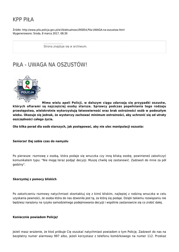 KPP PIŁA Źródło: http://www.pila.policja.gov.pl/w19/aktualnosci/95854,Pila-UWAGA-na-oszustow.html Wygenerowano: Środa, 8 marca 2017, 08:30 Strona znajduje się w archiwum. PIŁA - UWAGA NA OSZUSTÓW! Mimo wielu apeli Policji, w dalszym ciągu zdarzają się przypadki oszustw, których ofiarami są najczęściej osoby starsze. Sprawcy podczas popełniania tego rodzaju przestępstwa, wielokrotnie wykorzystują łatwowierność oraz brak ostrożności osób w podeszłym wieku. Okazuje się jednak, że wystarczy zachować minimum ostrożności, aby uchronić się od utraty oszczędności całego życia. Oto kilka porad dla osób starszych, jak postępować, aby nie ulec manipulacji oszusta: Seniorze! Daj sobie czas do namysłu Po pierwsze: rozmowę z osobą, która podaje się wnuczka czy inną bliską osobę, powinieneś zakończyć komunikatem typu: "Nie mogę teraz podjąć decyzji. Muszę chwilę się zastanowić. Zadzwoń do mnie za pół godziny". Skorzystaj z pomocy bliskich Po zakończeniu rozmowy natychmiast skontaktuj się z kimś bliskim, najlepiej z rodziną wnuczka w celu uzyskania pewności, że osoba która do nas dzwoniła jest tą, za którą się podaje. Dzięki takiemu rozwiązaniu nie będziesz narażony na ryzyko samodzielnego podejmowania decyzji i wspólnie zastanowicie się co zrobić dalej. Koniecznie powiadom Policję! Jeżeli masz wrażenie, że ktoś próbuje Cię oszukać natychmiast powiadom o tym Policję. Zadzwoń do nas na bezpłatny numer alarmowy 997 albo, jeżeli korzystasz z telefonu komórkowego na numer 112. Przekaż dyżurnemu informacje o swoich podejrzeniach. Policjanci natychmiast podejmą odpowiednie działania i pomogą Ci rozwiązać tę sytuację. Nie poniesiesz żadnych konsekwencji nawet, jeżeli telefon od rzekomego wnuczka, nie był próbą oszustwa. Policjanci są po to, aby Cię chronić, nie bój się zwrócić do nas o pomoc. Znane są przypadki, kiedy osoby starsze podejrzewając, że mogą być ofiarą oszustwa, zawiadomiły Policję przed przekazaniem pieniędzy. Dzięki temu udało się zatrzymać takich oszustów i ich pomocników. Inne porady dla starszych osób Nie wpuszczaj do domu nieznanych Ci osób. Poproś rodzinę o wyposażenie drzwi w wizjer, czyli tak zwanego judasza i blokadę drzwi w postaci łańcucha. Wszystkie wizyty instalatorów i innych przedstawicieli administracji są zawsze zapowiadane na tablicy ogłoszeń, jeżeli mieszkasz na wsi, takie informacje mogą być przekazywane za pomocą kurendy. Nie bój się legitymować przychodzących do Ciebie osób przed wpuszczeniem do domu. Nigdy, pod żadnym pozorem nie powierzaj swoich pieniędzy obcym osobom. Kiedy wydaje Ci się, że ktoś próbuje Cię oszukać, natychmiast powiadom Policję. Najlepszym miejscem przechowywania pieniędzy jest konto bankowe. Nie trzymaj dużych sum gotówki w domu, takie miejsca ukrycia pieniędzy jak przysłowiowa skarpetka, szafka z bielizną, skrytka pod materacem, puszka po kawie czy schowanie pieniędzy pomiędzy kartki książki, nie uchronią Twoich pieniędzy przed złodziejem. (źródło KWP Bydgoszcz) Ocena: 0/5 (0) Tweetnij