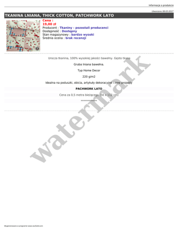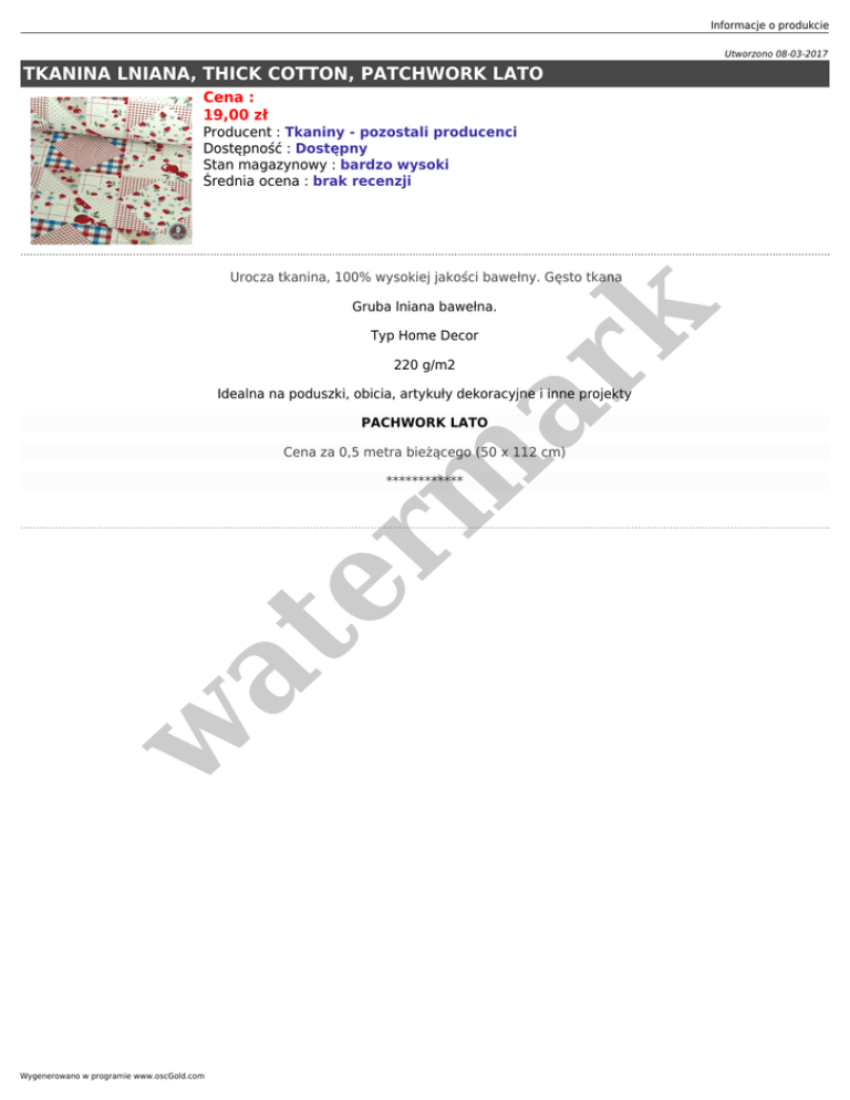 Informacje o produkcie Utworzono 08-03-2017 TKANINA LNIANA, THICK COTTON, PATCHWORK LATO Cena : 19,00 zł Producent : Tkaniny - pozostali producenci Dostępność : Dostępny Stan magazynowy : bardzo wysoki Średnia ocena : brak recenzji Urocza tkanina, 100% wysokiej jakości bawełny. Gęsto tkana er m ar k Gruba lniana bawełna. Typ Home Decor 220 g/m2 Idealna na poduszki, obicia, artykuły dekoracyjne i inne projekty PACHWORK LATO Cena za 0,5 metra bieżącego (50 x 112 cm) w at ************ Wygenerowano w programie www.oscGold.com