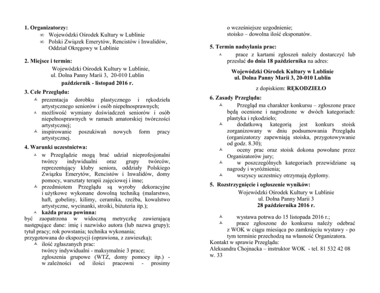 1. Organizatorzy: • Wojewódzki Ośrodek Kultury w Lublinie • Polski Związek Emerytów, Rencistów i Inwalidów, Oddział Okręgowy w Lublinie 2. Miejsce i termin: Wojewódzki Ośrodek Kultury w Lublinie, ul. Dolna Panny Marii 3, 20-010 Lublin październik - listopad 2016 r. 3. Cele Przeglądu: prezentacja dorobku plastycznego i rękodzieła artystycznego seniorów i osób niepełnosprawnych; możliwość wymiany doświadczeń seniorów i osób niepełnosprawnych w ramach amatorskiej twórczości artystycznej; inspirowanie poszukiwań nowych form pracy artystycznej. 4. Warunki uczestnictwa: w Przeglądzie mogą brać udział nieprofesjonalni twórcy indywidualni oraz grupy twórców, reprezentujący kluby seniora, oddziały Polskiego Związku Emerytów, Rencistów i Inwalidów, domy pomocy, warsztaty terapii zajęciowej i inne; przedmiotem Przeglądu są wyroby dekoracyjne i użytkowe wykonane dowolną techniką (malarstwo, haft, gobeliny, kilimy, ceramika, rzeźba, kowalstwo artystyczne, wycinanki, stroiki, biżuteria itp.); każda praca powinna: być zaopatrzona w widoczną metryczkę zawierającą następujące dane: imię i nazwisko autora (lub nazwa grupy); tytuł pracy; rok powstania; technika wykonania; przygotowana do ekspozycji (oprawiona, z zawieszką); ilość zgłaszanych prac: twórcy indywidualni - maksymalnie 3 prace; zgłoszenia grupowe (WTZ, domy pomocy itp.) w zależności od ilości pracowni - prosimy o wcześniejsze uzgodnienie; stoisko – dowolna ilość eksponatów. 5. Termin nadsyłania prac: prace z kartami zgłoszeń należy dostarczyć lub przesłać do dnia 18 października na adres: Wojewódzki Ośrodek Kultury w Lublinie ul. Dolna Panny Marii 3, 20-010 Lublin z dopiskiem: RĘKODZIEŁO 6. Zasady Przeglądu: Przegląd ma charakter konkursu – zgłoszone prace będą ocenione i nagrodzone w dwóch kategoriach: plastyka i rękodzieło; dodatkową kategorią jest konkurs stoisk zorganizowany w dniu podsumowania Przeglądu (organizatorzy zapewniają stoiska, przygotowywanie od godz. 8.30); oceny prac oraz stoisk dokona powołane przez Organizatorów jury; w poszczególnych kategoriach przewidziane są nagrody i wyróżnienia; wszyscy uczestnicy otrzymają dyplomy. 5. Rozstrzygnięcie i ogłoszenie wyników: Wojewódzki Ośrodek Kultury w Lublinie ul. Dolna Panny Marii 3 28 października 2016 r. wystawa potrwa do 15 listopada 2016 r.; prace zgłoszone do konkursu należy odebrać z WOK w ciągu miesiąca po zamknięciu wystawy - po tym terminie przechodzą na własność Organizatora. Kontakt w sprawie Przeglądu: Aleksandra Chojnacka – instruktor WOK - tel. 81 532 42 08 w. 33