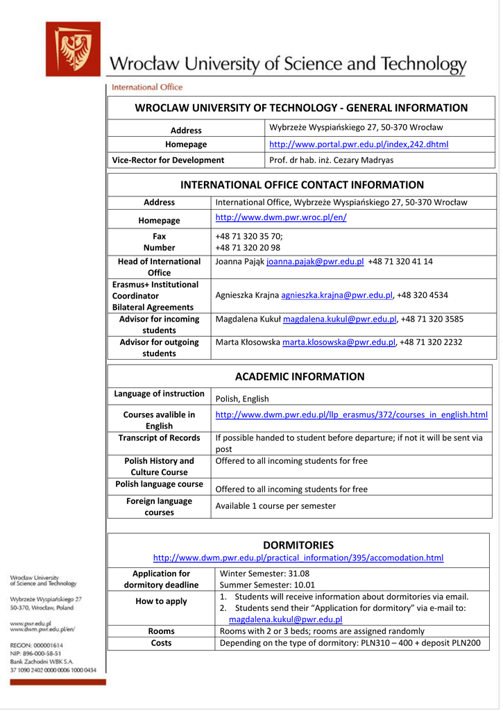 WROCLAW UNIVERSITY OF TECHNOLOGY - GENERAL INFORMATION Wybrzeże Wyspiańskiego 27, 50-370 Wrocław Address Homepage http://www.portal.pwr.edu.pl/index,242.dhtml Vice-Rector for Development Prof. dr hab. inż. Cezary Madryas INTERNATIONAL OFFICE CONTACT INFORMATION Address Homepage Fax Number Head of International Office Erasmus+ Institutional Coordinator Bilateral Agreements Advisor for incoming students Advisor for outgoing students International Office, Wybrzeże Wyspiańskiego 27, 50-370 Wrocław http://www.dwm.pwr.wroc.pl/en/ +48 71 320 35 70; +48 71 320 20 98 Joanna Pająk [email protected] +48 71 320 41 14 Agnieszka Krajna [email protected], +48 320 4534 Magdalena Kukuł [email protected], +48 71 320 3585 Marta Kłosowska [email protected], +48 71 320 2232 ACADEMIC INFORMATION Language of instruction Courses avalible in English Transcript of Records Polish History and Culture Course Polish language course Foreign language courses Polish, English http://www.dwm.pwr.edu.pl/llp_erasmus/372/courses_in_english.html If possible handed to student before departure; if not it will be sent via post Offered to all incoming students for free Offered to all incoming students for free Available 1 course per semester DORMITORIES http://www.dwm.pwr.edu.pl/practical_information/395/accomodation.html Application for dormitory deadline How to apply Rooms Costs Winter Semester: 31.08 Summer Semester: 10.01 1. Students will receive information about dormitories via email. 2. Students send their “Application for dormitory” via e-mail to: [email protected] Rooms with 2 or 3 beds; rooms are assigned randomly Depending on the type of dormitory: PLN310 – 400 + deposit PLN200 APPLICATION FOR EXCHANGE SUDENTS Deadline for winter semester Deadline for summer semester Required documents English knowelde required Other information June, 15th November, 15th http://www.dwm.pwr.edu.pl/llp_erasmus/374/how_to_apply.html 1. Application Form 2. Learning Agreement (accepted by the home and host university) 3. Transcript of Records (stamped by home university) 4. Copy of passport or national ID level B2 Application must be sent via post ACADEMIC CALENDAR 2015/2016 http://www.portal.pwr.edu.pl/kalendarz,242.dhtml (will be updated by the end of April 2016) Winter semester Exam session Introduction Days Christmas break Semester break Days off 3.10.2016 - 2.02.2017 3.02.2017 – 21.02.2017 Before the beginning of the semester 23.12.2016 – 06.01.2017 22.02.2017 – 27.02.2017 31.10.2016; 1.11.2016 (All Saint’s Day); 11.11.2016 (Independence Day) Summer semester Introduction Days Exam session Easter holidays Days off 28.02.2017 – 22.06.2017 Before the beginning of the semester 23.11.2017 – 11.07.2017 13.04.2017 – 18.04.2017 1.05.2017 (Workers' Day); 2.05.2017; 3.05.2017 (May 3rd Constitution Day); 15.06.2017 (Corpus Christi) ADDITIONAL INFORMATION Health Insurance Visa Residency in Poland A proof of Health Insurance is compulsory http://rekrutacja.pwr.edu.pl/en2/admission-february2016/guide/practical-information/health-insurance/ Visa is required for non - EU citizens For EU-citizens: http://www.dwm.pwr.edu.pl/llp_erasmus/958/after_your_arrival.html For non-EU citizens: http://www.foreignersinpoland.com/polish-law/stay-poland.html