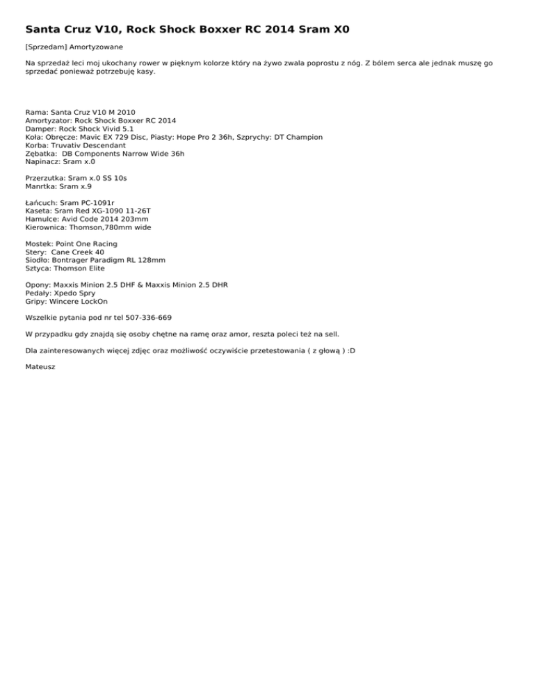 Santa Cruz V10, Rock Shock Boxxer RC 2014 Sram X0 [Sprzedam] Amortyzowane Na sprzedaż leci moj ukochany rower w pięknym kolorze który na żywo zwala poprostu z nóg. Z bólem serca ale jednak muszę go sprzedać ponieważ potrzebuję kasy. Rama: Santa Cruz V10 M 2010 Amortyzator: Rock Shock Boxxer RC 2014 Damper: Rock Shock Vivid 5.1 Koła: Obręcze: Mavic EX 729 Disc, Piasty: Hope Pro 2 36h, Szprychy: DT Champion Korba: Truvativ Descendant Zębatka: DB Components Narrow Wide 36h Napinacz: Sram x.0 Przerzutka: Sram x.0 SS 10s Manrtka: Sram x.9 Łańcuch: Sram PC-1091r Kaseta: Sram Red XG-1090 11-26T Hamulce: Avid Code 2014 203mm Kierownica: Thomson,780mm wide Mostek: Point One Racing Stery: Cane Creek 40 Siodło: Bontrager Paradigm RL 128mm Sztyca: Thomson Elite Opony: Maxxis Minion 2.5 DHF & Maxxis Minion 2.5 DHR Pedały: Xpedo Spry Gripy: Wincere LockOn Wszelkie pytania pod nr tel 507-336-669 W przypadku gdy znajdą się osoby chętne na ramę oraz amor, reszta poleci też na sell. Dla zainteresowanych więcej zdjęc oraz możliwość oczywiście przetestowania ( z głową ) :D Mateusz Informacje dodatkowe Stan Używany Ilość 1 Oferta prywatna/sklepu Oferta prywatna Materiał ramy Aluminium Rozmiar ramy M Rocznik 2010 Waga (kg) Powered by TCPDF (www.tcpdf.org)