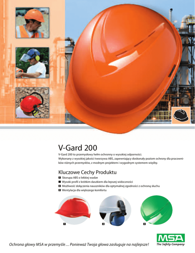 V-Gard 200 V-Gard 200 to przemysłowy hełm ochronny o wysokiej odporności. Wykonany z wysokiej jakości tworzywa ABS, zapewniający doskonały poziom ochrony dla pracowników różnych przemysłów, z modnym projektem i wygodnym systemem więźby. Kluczowe Cechy Produktu 1 ■ ■ 2 ■ 3 ■ Skorupa ABS o lekkiej wadze Wysoki profil z krótkim daszkiem dla lepszej widoczności Możliwość dołączenia nauszników dla optymalnej zgodności z ochroną słuchu Wentylacja dla większego komfortu 1 2 3 Ochrona głowy MSA w przemyśle ... Ponieważ Twoja głowa zasługuje na najlepsze! V-Gard 200 Specyfikacje Produktu Tworzywo skorupy Wentylacja Więźba Rozmiar głowy Waga Kolory Adapter Norma EN Wysoko wydajny ABS Wentylowana (otwory wentylacyjne na wierzchu skorupy) Staz-On: 4 punktowa, wykonana z polietylenu o niskiej gęstości Fas-Trac: 4 punktowa, płynna regulacja za pomocą śruby 52–64 cm (Fas-Trac), 52–62 cm (Staz-On) 360 g (z więźbą Staz-On) Biały, żółty, zielony, niebieski, czerwony, pomarańczowy, żółty fluorescencyjny Standardowy, 30 mm Oznaczenie CE zgodnie z normą EN 397 Spełnia dodatkowe wymagania: niskie temperatury do –30 °C Numery Katalogowe Stworzony został specyficzny system numeracji w celu ustalenia właściwego numeru katalowego. GV 6 X X - X X 0 0 X X 0 - YYY Skorupa 6. V-Gard 200 Kolor Więźba 1. Biały 1. Staz-On 2. Żółty 2. Fas-Trac 3. Czerwony 3. Staz-on 4. Zielony skórzana 5. Niebieski 4. Fas-Trac 6. Pomarań- skórzana czowy A. Żółty Fluorescencyjny Pasek pod- Ochrona Oczu bródkowy 0. Brak 0. Brak 1. Okulary 1. 2 pkt, wewnętrzne tekstylny Stowaway, 2. 2 pkt, Przezroczyste elastyczny 2. Okulary wewnętrzne Stowaway, przyciemnione Uchwyt lampy 0. Brak 1. Uchwyt mocowania lampy Naklejki 0. Brak 1. Prosta, żółta 2. Prosta, pomarańczowa 3. Prosta, Srebrna 4. Zakrzywiona, żółta 5. Zakrzywiona, pomarańczowa 6. Zakrzywiona, srebrna Logo 000. Brak logo YYY. Specjalne Jeden kod logo na hełmie (do 4 logo na 1 skorupie) 1 Przykłady akcesoriów Paski podbródkowe B0258213 B0259378 10006280 802439 Ochrona twarzy 10002674 10002675 SOR60020 SOR60022 SOR60040 SOR60041 SOR60043 SOR60060 Skontaktuj się Ochrona słuchu 10087437 10087428 Skontaktuj się 1 2 3 4 2 pkt pasek podbródkowy, tekstylny 2 pkt pasek podbródkowy, elastyczny Potnik (pakowany po 10 szt) Ocieplacz głowy Okulary wewnętrzne Stowaway, przezroczyste Okulary wewnętrzne Stowaway, przyciemnione Nośnik osłony twarzy (dla wizjera siatkowego i poliwęglanowego) Wizjer dołączony do hełmu, adaptery 30 mm Wizjer poliwęglanowy (20 cm) Wizjer poliwęglanowy (16 cm) Wizjer poliwęglanowy (20 cm) – chroniący przed łukiem elektrycznym Wizjer siatkowy (metalowa siatka) z naszym biurem w celu informacji o pozostałych osłonach twarzy left/RIGHT, NISKIE, Żółte, montowane na hełmie left/RIGHT, ŚREDNIE, Żółte, montowane do hełmu z naszym biurem w celu informacji o pozostałych ochronnikach słuchu 2 3 4 5 *Configured : included in the helmet part number (see codification above) Zamocowanie lampy Skonfigurow.* 5 Uchwyt mocowania lampy (zawiera zacisk kabla) Odblaskowe naklejki Skonfigurow.* 6 2 kształty, 3 kolory Dostosowanie hełmu Skonfigurow.* 7 Logo w 4 różnych polach – Max rozmiar: 60 x 90 mm *Skonfigurowane: zawiera numer katalogowy hełmu (patrz kodyfikację powyżej). Jest to tylko mały fragment wyboru z dostępnych akcesorii. Aby poznać pełny asortyment skontaktuj się z firmą MSA. Centrala i Oddział w Raszynie MSA Safety Sp. z o.o. Ul. Wschodnia 5a 05-090 Raszyn k/Warszawy Tel. +48 [22] 7 11 50 00 Fax +48 [22] 7 11 50 19 E-mail [email protected] http://www.msa-poland.com Zapraszamy także do naszych Oddziałów w: Krakowie, Gdańsku, Poznaniu oraz Wrocławiu Zastrzegamy sobie możliwość dokonywania zmian technicznych ID 06-102.2 PL/01/N/09.09/CH 6 7