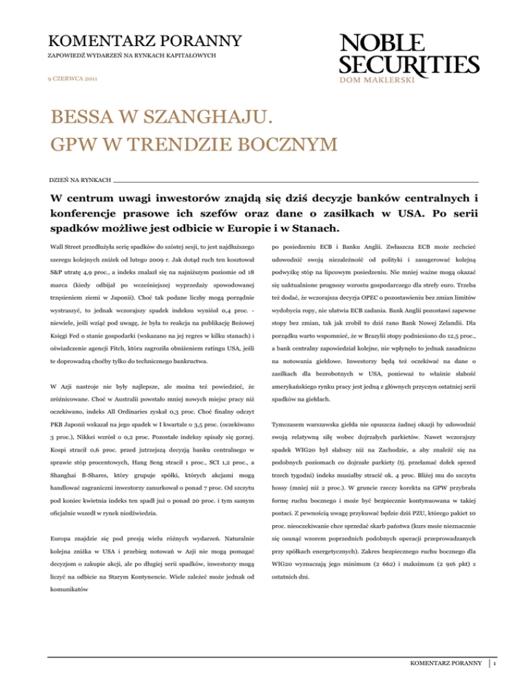 KOMENTARZ PORANNY ZAPOWIEDŹ WYDARZEŃ NA RYNKACH KAPITAŁOWYCH 9 CZERWCA 2011 BESSA W SZANGHAJU. GPW W TRENDZIE BOCZNYM DZIEŃ NA RYNKACH W centrum uwagi inwestorów znajdą się dziś decyzje banków centralnych i konferencje prasowe ich szefów oraz dane o zasiłkach w USA. Po serii spadków możliwe jest odbicie w Europie i w Stanach. Wall Street przedłużyła serię spadków do szóstej sesji, to jest najdłuższego po posiedzeniu ECB i Banku Anglii. Zwłaszcza ECB może zechcieć szeregu kolejnych zniżek od lutego 2009 r. Jak dotąd ruch ten kosztował udowodnić swoją niezależność od polityki i zasugerować kolejną S&P utratę 4,9 proc., a indeks znalazł się na najniższym poziomie od 18 podwyżkę stóp na lipcowym posiedzeniu. Nie mniej ważne mogą okazać marca (kiedy odbijał po wcześniejszej wyprzedaży spowodowanej się uaktualnione prognozy wzrostu gospodarczego dla strefy euro. Trzeba trzęsieniem ziemi w Japonii). Choć tak podane liczby mogą porządnie też dodać, że wczorajsza decyzja OPEC o pozostawieniu bez zmian limitów wystraszyć, to jednak wczorajszy spadek indeksu wyniósł 0,4 proc. - wydobycia ropy, nie ułatwia ECB zadania. Bank Anglii pozostawi zapewne niewiele, jeśli wziąć pod uwagę, że była to reakcja na publikację Beżowej stopy bez zmian, tak jak zrobił to dziś rano Bank Nowej Zelandii. Dla Księgi Fed o stanie gospodarki (wskazano na jej regres w kilku stanach) i porządku warto wspomnieć, że w Brazylii stopy podniesiono do 12,5 proc., oświadczenie agencji Fitch, która zagroziła obniżeniem ratingu USA, jeśli a bank centralny zapowiedział kolejne, nie wpłynęło to jednak zasadniczo te doprowadzą choćby tylko do technicznego bankructwa. na notowania giełdowe. Inwestorzy będą też oczekiwać na dane o zasiłkach dla bezrobotnych w USA, ponieważ to właśnie słabość W Azji nastroje nie były najlepsze, ale można też powiedzieć, że amerykańskiego rynku pracy jest jedną z głównych przyczyn ostatniej serii zróżnicowane. Choć w Australii powstało mniej nowych miejsc pracy niż spadków na giełdach. oczekiwano, indeks All Ordinaries zyskał 0,3 proc. Choć finalny odczyt PKB Japonii wskazał na jego spadek w I kwartale o 3,5 proc. (oczekiwano Tymczasem warszawska giełda nie opuszcza żadnej okazji by udowodnić 3 proc.), Nikkei wzrósł o 0,2 proc. Pozostałe indeksy spisały się gorzej. swoją relatywną siłę wobec dojrzałych parkietów. Nawet wczorajszy Kospi stracił 0,6 proc. przed jutrzejszą decyzją banku centralnego w spadek WIG20 był słabszy niż na Zachodzie, a aby znaleźć się na sprawie stóp procentowych, Hang Seng stracił 1 proc., SCI 1,2 proc., a podobnych poziomach co dojrzałe parkiety (tj. przełamać dołek sprzed Shanghai B-Shares, który grupuje spółki, których akcjami mogą trzech tygodni) indeks musiałby stracić ok. 4 proc. Bliżej mu do szczytu handlować zagraniczni inwestorzy zanurkował o ponad 7 proc. Od szczytu hossy (mniej niż 2 proc.). W gruncie rzeczy korekta na GPW przybrała pod koniec kwietnia indeks ten spadł już o ponad 20 proc. i tym samym formę ruchu bocznego i może być bezpiecznie kontynuowana w takiej oficjalnie wszedł w rynek niedźwiedzia. postaci. Z pewnością uwagę przykuwać będzie dziś PZU, którego pakiet 10 proc. nieoczekiwanie chce sprzedać skarb państwa (kurs może nieznacznie Europa znajdzie się pod presją wielu różnych wydarzeń. Naturalnie się osunąć wzorem poprzednich podobnych operacji przeprowadzanych kolejna zniżka w USA i przebieg notowań w Azji nie mogą pomagać przy spółkach energetycznych). Zakres bezpiecznego ruchu bocznego dla decyzjom o zakupie akcji, ale po długiej serii spadków, inwestorzy mogą WIG20 wyznaczają jego minimum (2 662) i maksimum (2 916 pkt) z liczyć na odbicie na Starym Kontynencie. Wiele zależeć może jednak od ostatnich dni. komunikatów KOMENTARZ PORANNY 1 INDEKSY GIEŁDOWE FIXING NBP WIG 49532,50 pkt -0,43 % EUR 3,9490 +0,04 % WIG 20 2885,21 pkt -0,37 % CHF 3,2216 -0,19 % BUX 23195,04 pkt +0,14 % USD 2,6943 +0,19 % CAC40 3837,98 pkt -0,88 % JPY 0,0337 +0,60 % FTSE100 5808,89 pkt -0,95 % GBP 4,4098 -0,36 % WIG 20 NOTOWANIA SUROWCÓW 2885 pkt 3000 Ropa 118,13 USD -0,01 % Złoto 1533,70 USD -0,10 % Platyna 1814,00 USD -0,36 % Miedź 9045,00 USD -1,04 % 2800 04.2011 05.2011 06.2011 Komentarz przygotował: Emil Szweda, Noble Securities DANE DOSTARCZA NOTORIA SERWIS SP. Z O. O. KOMENTARZ PORANNY 2