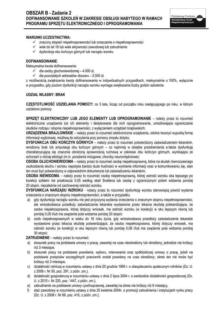OBSZAR B - Zadanie 2 DOFINANSOWANIE SZKOLEŃ W ZAKRESIE OBSŁUGI NABYTEGO W RAMACH PROGRAMU SPRZĘTU ELEKTRONICZNEGO I OPROGRAMOWANIA WARUNKI UCZESTNICTWA: znaczny stopień niepełnosprawności lub orzeczenie o niepełnosprawności wiek do lat 18 lub wiek aktywności zawodowej lub zatrudnienie dysfunkcja obu kończyn górnych lub narządu wzroku DOFINANSOWANIE: Maksymalna kwota dofinansowania: dla osoby głuchoniewidomej – 4.000 zł, dla pozostałych adresatów obszaru – 2.000 zł, z możliwością zwiększenia kwoty dofinansowania w indywidualnych przypadkach, maksymalnie o 100%, wyłącznie w przypadku, gdy poziom dysfunkcji narządu wzroku wymaga zwiększenia liczby godzin szkolenia. UDZIAŁ WŁASNY: BRAK CZĘSTOTLIWOŚĆ UDZIELANIA POMOCY: co 3 lata, licząc od początku roku następującego po roku, w którym udzielono pomocy SPRZĘT ELEKTRONICZNY LUB JEGO ELEMENTY LUB OPROGRAMOWANIE – należy przez to rozumieć elektroniczne urządzenia lub ich elementy i dedykowane dla nich oprogramowanie, umożliwiające ograniczanie skutków rodzaju i stopnia niepełnosprawności, z wyłączeniem urządzeń brajlowskich; URZĄDZENIA BRAJLOWSKIE – należy przez to rozumieć elektroniczne urządzenia, zdolne tworzyć wypukłą formę informacji wyjściowej, możliwą do odczytania przy pomocy zmysłu dotyku; DYSFUNKCJA OBU KOŃCZYN GÓRNYCH – należy przez to rozumieć potwierdzony zaświadczeniem lekarskim, wrodzony brak lub amputację obu kończyn górnych – co najmniej w obrębie przedramienia a także dysfunkcję charakteryzującą się znacznie obniżoną sprawnością ruchową w zakresie obu kończyn górnych, wynikająca ze schorzeń o różnej etiologii (m.in. porażenia mózgowe, choroby neuromięśniowe); OSOBA GŁUCHONIEWIDOMA – należy przez to rozumieć osobę niepełnosprawną, która na skutek równoczesnego uszkodzenia słuchu i wzroku napotyka bardzo duże trudności w wymianie informacji oraz w komunikowaniu się, stan ten musi być potwierdzony w odpowiednim dokumencie lub zaświadczeniu lekarskim; OSOBA NIEWIDOMA – należy przez to rozumieć osobę niepełnosprawną, której ostrość wzroku oka lepszego po korekcji szkłami nie przekracza 0,05 według skali Snellena lub osobę z ograniczonym polem widzenia poniżej 20 stopni, niezależnie od zachowanej ostrości wzroku. DYSFUNKCJA NARZĄDU WZROKU - należy przez to rozumieć dysfunkcję wzroku stanowiącą powód wydania orzeczenia o znacznym stopniu niepełnosprawności, a także w przypadku: a) gdy dysfunkcja narządu wzroku nie jest przyczyną wydania orzeczenia o znacznym stopniu niepełnosprawności, ale wnioskodawca przedłoży zaświadczenie lekarskie wystawione przez lekarza okulistę potwierdzające, że osoba niepełnosprawna, której dotyczy wniosek, ma ostrość wzroku (w korekcji) w oku lepszym równą lub poniżej 0,05 i/lub ma zwężenie pola widzenia poniżej 20 stopni; b) osób niepełnosprawnych w wieku do 16 roku życia, gdy wnioskodawca przedłoży zaświadczenie lekarskie wystawione przez lekarza okulistę potwierdzające, że osoba niepełnosprawna, której dotyczy wniosek, ma ostrość wzroku (w korekcji) w oku lepszym równą lub poniżej 0,06 i/lub ma zwężenie pola widzenia poniżej 30 stopni; ZATRUDNIENE – należy przez to rozumieć: a) stosunek pracy na podstawie umowy o pracę, zawartej na czas nieokreślony lub określony, jednakże nie krótszy niż 3 miesiące, b) stosunek pracy na podstawie powołania, wyboru, mianowania oraz spółdzielczej umowy o pracę, jeżeli na podstawie przepisów szczególnych pracownik został powołany na czas określony; okres ten nie może być krótszy niż 3 miesiące, c) działalność rolniczą w rozumieniu ustawy z dnia 20 grudnia 1990 r. o ubezpieczeniu społecznym rolników (Dz. U. z 2008 r. Nr 50, poz. 291, z późn. zm.), d) działalność gospodarczą w rozumieniu ustawy z dnia 2 lipca 2004 r. o swobodzie działalności gospodarczej (Dz. U. z 2010 r. Nr 220, poz. 1447, z późn. zm.), e) zatrudnienie na podstawie umowy cywilnoprawnej, zawartej na okres nie krótszy niż 6 miesięcy, f) staż zawodowy w rozumieniu ustawy z dnia 20 kwietnia 2004r. o promocji zatrudnienia i instytucjach rynku pracy (Dz. U. z 2008 r. Nr 69, poz. 415, z późn. zm.);
