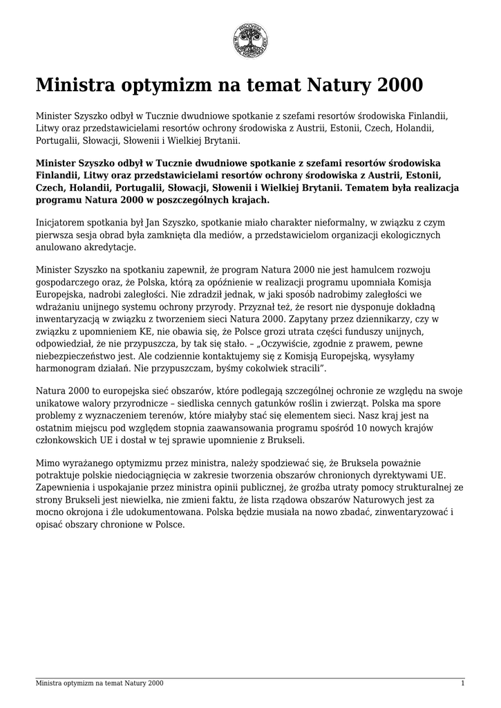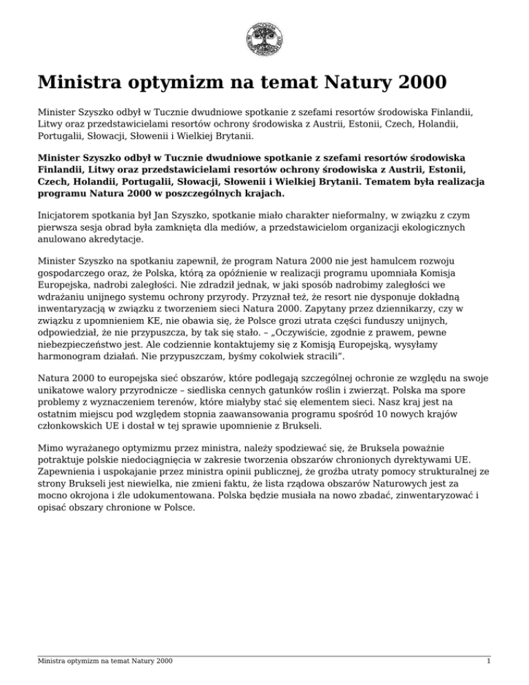 Ministra optymizm na temat Natury 2000 Minister Szyszko odbył w Tucznie dwudniowe spotkanie z szefami resortów środowiska Finlandii, Litwy oraz przedstawicielami resortów ochrony środowiska z Austrii, Estonii, Czech, Holandii, Portugalii, Słowacji, Słowenii i Wielkiej Brytanii. Minister Szyszko odbył w Tucznie dwudniowe spotkanie z szefami resortów środowiska Finlandii, Litwy oraz przedstawicielami resortów ochrony środowiska z Austrii, Estonii, Czech, Holandii, Portugalii, Słowacji, Słowenii i Wielkiej Brytanii. Tematem była realizacja programu Natura 2000 w poszczególnych krajach. Inicjatorem spotkania był Jan Szyszko, spotkanie miało charakter nieformalny, w związku z czym pierwsza sesja obrad była zamknięta dla mediów, a przedstawicielom organizacji ekologicznych anulowano akredytacje. Minister Szyszko na spotkaniu zapewnił, że program Natura 2000 nie jest hamulcem rozwoju gospodarczego oraz, że Polska, którą za opóźnienie w realizacji programu upomniała Komisja Europejska, nadrobi zaległości. Nie zdradził jednak, w jaki sposób nadrobimy zaległości we wdrażaniu unijnego systemu ochrony przyrody. Przyznał też, że resort nie dysponuje dokładną inwentaryzacją w związku z tworzeniem sieci Natura 2000. Zapytany przez dziennikarzy, czy w związku z upomnieniem KE, nie obawia się, że Polsce grozi utrata części funduszy unijnych, odpowiedział, że nie przypuszcza, by tak się stało. – „Oczywiście, zgodnie z prawem, pewne niebezpieczeństwo jest. Ale codziennie kontaktujemy się z Komisją Europejską, wysyłamy harmonogram działań. Nie przypuszczam, byśmy cokolwiek stracili”. Natura 2000 to europejska sieć obszarów, które podlegają szczególnej ochronie ze względu na swoje unikatowe walory przyrodnicze – siedliska cennych gatunków roślin i zwierząt. Polska ma spore problemy z wyznaczeniem terenów, które miałyby stać się elementem sieci. Nasz kraj jest na ostatnim miejscu pod względem stopnia zaawansowania programu spośród 10 nowych krajów członkowskich UE i dostał w tej sprawie upomnienie z Brukseli. Mimo wyrażanego optymizmu przez ministra, należy spodziewać się, że Bruksela poważnie potraktuje polskie niedociągnięcia w zakresie tworzenia obszarów chronionych dyrektywami UE. Zapewnienia i uspokajanie przez ministra opinii publicznej, że groźba utraty pomocy strukturalnej ze strony Brukseli jest niewielka, nie zmieni faktu, że lista rządowa obszarów Naturowych jest za mocno okrojona i źle udokumentowana. Polska będzie musiała na nowo zbadać, zinwentaryzować i opisać obszary chronione w Polsce. Ministra optymizm na temat Natury 2000 1