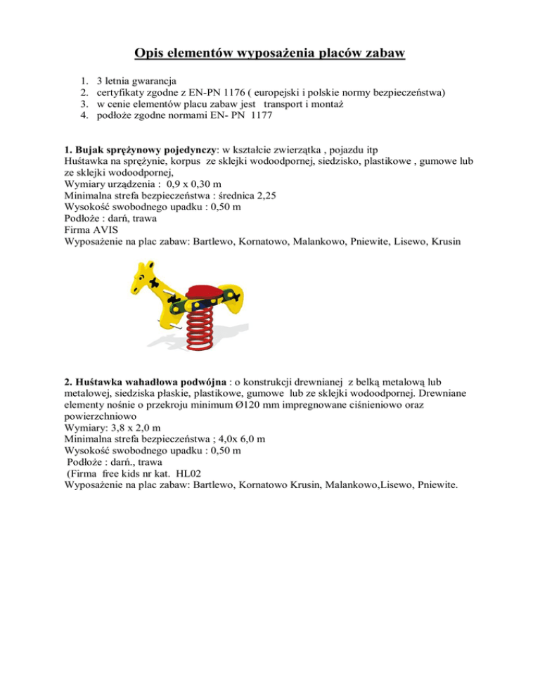 Opis elementów wyposażenia placów zabaw 1. 2. 3. 4. 3 letnia gwarancja certyfikaty zgodne z EN-PN 1176 ( europejski i polskie normy bezpieczeństwa) w cenie elementów placu zabaw jest transport i montaż podłoże zgodne normami EN- PN 1177 1. Bujak sprężynowy pojedynczy: w kształcie zwierzątka , pojazdu itp Huśtawka na sprężynie, korpus ze sklejki wodoodpornej, siedzisko, plastikowe , gumowe lub ze sklejki wodoodpornej, Wymiary urządzenia : 0,9 x 0,30 m Minimalna strefa bezpieczeństwa : średnica 2,25 Wysokość swobodnego upadku : 0,50 m Podłoże : darń, trawa Firma AVIS Wyposażenie na plac zabaw: Bartlewo, Kornatowo, Malankowo, Pniewite, Lisewo, Krusin 2. Huśtawka wahadłowa podwójna : o konstrukcji drewnianej z belką metalową lub metalowej, siedziska płaskie, plastikowe, gumowe lub ze sklejki wodoodpornej. Drewniane elementy nośnie o przekroju minimum Ø120 mm impregnowane ciśnieniowo oraz powierzchniowo Wymiary: 3,8 x 2,0 m Minimalna strefa bezpieczeństwa ; 4,0x 6,0 m Wysokość swobodnego upadku : 0,50 m Podłoże : darń., trawa (Firma free kids nr kat. HL02 Wyposażenie na plac zabaw: Bartlewo, Kornatowo Krusin, Malankowo,Lisewo, Pniewite. 3. Huśtawka wagowa: drewniana lub metalowa , siedzisko plastikowe lub ze sklejki wodoodpornej, z odbojnikiem gumowym lub amortyzatory gumowe wkopane w ziemi Wymiary: 3,1 x 0,5 m drewniany element nośny o przekroju minimum Ø120 mm impregnowane ciśnieniowo oraz powierzchniowo Minimalna strefa bezpieczeństwa ; 5,1 x 2,5 m Wysokość swobodnego upadku : 0,50 m Podłoże : darń, trawa (Firma free kids nr HWG-01) Wyposażenie na plac zabaw: Bartlewo, Kornatowo, Malankowo, Pniewite. 4. Zestaw zabawowy: Wieża z dachem dwuspadowym z wejściem na pomost , zjeżdżalnia ze stali nierdzewnej , huśtawka wahadłowa pojedyncza z drabinką krzyżakową ( możliwy wariant zamiany huśtawki na przeplotnię drewnianą lub przeplotnię ze słupkiem, lub ściankę gimnastyczną ) drewniane elementy nośnie o przekroju minimum Ø120 mm impregnowane ciśnieniowo oraz powierzchniowo Minimalna strefa bezpieczeństwa ; 9,6 x 9,5 m Wysokość swobodnego upadku : 1,99 m Podłoże min. strefy bezpieczeństwa : piasek lub żwir na głębokość min 20 cm ( firma AVIS zestaw nr 10) Wyposażenie na plac zabaw: Bartlewo, Kornatowo Krusin, Malankowo, Pniewite. 5 . Ławka drewniana lub na kątownikach stała bez oparcia Wymiary dł 1,5 m, szer. 0,40 m , wys. O,45 m. ( Firma AVIS) Wyposażenie na plac zabaw: Bartlewo, Kornatowo, Krusin, Malankowo, Pniewite. 6. ŁAWO- STÓŁ – drewniany Wymiary : dł. 1,70 m., szer. 1,80 m, wys. 0,80 m ( Firma AVIS) Wyposażenie na plac zabaw: Bartlewo, Kornatowo Krusin, Malankowo,Lisewo, Pniewite. 7. Kosz na śmieci : drewniany lub metalowy , średnica min 0,30 m, pojemność wiadra 30 l wysokość 0,75 m (Firma free kids nr KKS-S1) Wyposażenie na plac zabaw: Bartlewo, Kornatowo Krusin, Malankowo,Lisewo, Pniewite. 8.Karuzela tarczowa : czteroramienna wymiary urządzenia średnica 1,50m, minimalna strefa bezpieczeństwa średnica 5,50 Podest z blachy aluminiowej ryflowanej lub ze sklejki antypoślizgowej wodoodpornej. Ramię metalowe lub drewniane. Wysokość swobodnego upadku : 0,50 m (Firma free kids nr KD-02) Wyposażenie na plac zabaw: Krusin, Pniewite, Kornatowo, Bartlewo