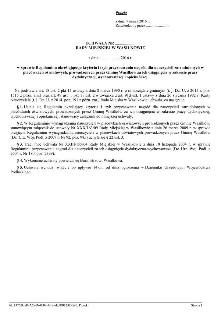 Projekt z dnia 9 marca 2016 r. Zatwierdzony przez ......................... UCHWAŁA NR .................... RADY MIEJSKIEJ W WASILKOWIE z dnia .................... 2016 r. w sprawie Regulaminu określającego kryteria i tryb przyznawania nagród dla nauczycieli zatrudnionych w placówkach oświatowych, prowadzonych przez Gminę Wasilków za ich osiągnięcia w zakresie pracy dydaktycznej, wychowawczej i opiekuńczej. Na podstawie art. 18 ust. 2 pkt 15 ustawy z dnia 8 marca 1990 r. o samorządzie gminnym (t. j. Dz. U. z 2015 r. poz. 1515 z późn. zm.) oraz art. 49 ust. 1 pkt 1 i ust. 2 w związku z art. 91d ust. 1 ustawy z dnia 26 stycznia 1982 r. Karty Nauczyciela (t. j. Dz. U. z 2014. poz. 191 z późn. zm.) Rada Miejska w Wasilkowie uchwala, co następuje: § 1. Ustala się Regulamin określający kryteria i tryb przyznawania nagród dla nauczycieli zatrudnionych w placówkach oświatowych, prowadzonych przez Gminę Wasilków za ich osiągnięcia w zakresie pracy dydaktycznej, wychowawczej i opiekuńczej, stanowiący załącznik do niniejszej uchwały. § 2. W Regulaminie wynagradzania nauczycieli w placówkach oświatowych prowadzonych przez Gminę Wasilków, stanowiącym załącznik do uchwały Nr XXX/163/09 Rady Miejskiej w Wasilkowie z dnia 26 marca 2009 r. w sprawie przyjęcia Regulaminu wynagradzania nauczycieli w placówkach oświatowych prowadzonych przez Gminę Wasilków (Dz. Urz. Woj. Podl. z 2009 r. Nr 92, poz. 985) uchyla się § 22 ust. 3. § 3. Traci moc uchwała Nr XXIII/155/04 Rady Miejskiej w Wasilkowie z dnia 18 listopada 2004 r. w sprawie Regulaminu przyznawania nagród dla nauczycieli za ich osiągnięcia dydaktyczno-wychowawcze (Dz. Urz. Woj. Podl. z 2004 r. Nr 180, poz. 2399). § 4. Wykonanie uchwały powierza się Burmistrzowi Wasilkowa. § 5. Uchwała wchodzi w życie po upływie 14 dni od dnia ogłoszenia w Dzienniku Urzędowym Województwa Podlaskiego. Id: 13762C5B-AC4D-4C09-A185-E3D012319596. Projekt Strona 1 Załącznik Nr 1 do Uchwały Nr .................... Rady Miejskiej w Wasilkowie z dnia....................2016 r. Regulamin określający kryteria i tryb przyznawania nagród dla nauczycieli zatrudnionych w placówkach oświatowych, prowadzonych przez Gminę Wasilków za ich osiągnięcia w zakresie pracy dydaktycznej, wychowawczej i opiekuńczej. Rozdział 1. Postanowienia ogólne § 1. 1. Regulamin reguluje kryteria i tryb przyznawania nagród dla nauczycieli za ich osiągnięcia w zakresie pracy dydaktycznej, wychowawczej i opiekuńczej ze specjalnego funduszu nagród wyodrębnionego w budżecie Gminy Wasilków z przeznaczeniem na nagrody organu prowadzącego oraz dyrektorów placówek oświatowych. 2. Ilekroć w niniejszym Regulaminie jest mowa o: 1) gminie- należy przez to rozumieć Gminę Wasilków, 2) Burmistrzu- należy przez to rozumieć Burmistrza Wasilkowa, 3) placówkach oświatowych- należy przez to rozumieć szkoły, oddziały przedszkolne w szkołach podstawowych, inne formy wychowania przedszkolnego i przedszkole prowadzone przez gminę, 4) nauczycielach- należy przez to rozumieć nauczycieli i innych pracowników pedagogicznych zatrudnionych w placówkach oświatowych prowadzonych przez gminę, 5) Nagrodzie Burmistrza- należy przez to rozumieć nagrodę organu prowadzącego placówkę oświatową, 6) Nagrodzie Dyrektora- należy przez to rozumieć nagrodę dyrektora placówki oświatowej. Rozdział 2. Sposób podziału środków § 2. 1. W budżecie gminy tworzy się corocznie specjalny fundusz nagród dla nauczycieli w wysokości co najmniej 1% ich planowanych rocznych wynagrodzeń osobowych, z tym że: 1) 80 % środków funduszu przeznacza się na Nagrody Dyrektora, 2) 20 % środków funduszu przeznacza się na Nagrody Burmistrza. 2. Środki funduszu na nagrody dzieli się proporcjonalnie między placówki oświatowe w zależności od wysokości planowanych rocznych wynagrodzeń osobowych w placówce oświatowej. 3. Nagrody przyznawane są z okazji Dnia Edukacji Narodowej lub innych ważnych uroczystości szkolnych. Rozdział 3. Tryb zgłaszania kandydatów do nagrody § 3. 1. Nagroda Burmistrza przyznawana jest na wniosek: 1) dla nauczyciela: a) dyrektora placówki oświatowej, b) rady rodziców, c) zakładowej organizacji związkowej zrzeszającej nauczycieli. 2) dla dyrektora placówki: a) sekretarza gminy (działającego na podstawie upoważnienia Burmistrza), b) rady rodziców, c) zakładowej organizacji związkowej zrzeszającej nauczycieli. 2. Nagrodę Dyrektora dla nauczycieli przyznaje dyrektor placówki oświatowej z własnej inicjatywy lub na wniosek rady rodziców. 3. Wzór wniosku o przyznanie Nagrody Burmistrza lub Nagrody Dyrektora stanowi załącznik nr 1 do regulaminu. Id: 13762C5B-AC4D-4C09-A185-E3D012319596. Projekt Strona 1 § 4. 1. Wnioski o przyznanie nagród, o których mowa w § 3 ust. 1 i 2 należy składać w terminie: 1) do dnia 15 września każdego roku - w przypadku nagród z okazji Dnia Edukacji Narodowej, 2) co najmniej miesiąc przed planowanym terminem uroczystości - w przypadku nagród z okazji innych ważnych uroczystości szkolnych. 2. Wnioski należy składać odpowiednio: 1) w Biurze Obsługi Interesanta Urzędu Miejskiego w Wasilkowie - w przypadku wniosków o przyznanie Nagrody Burmistrza, 2) w sekretariacie placówki oświatowej - w przypadku wniosków o przyzanie Nagrody Dyrektora. 3. Wnioski złożone po terminie lub w których nie zostały usunięte braki formalne nie będą rozpatrywane. 4. Wnioski o przyznanie Nagrody Burmistrza składane przez dyrektora placówki oświatowej i radę rodziców wymagają wcześniejszego ich zaopiniowania przez radę pedagogiczną. 5. W uzasadnieniu wniosku o nagrody należy podać konkretne i wymierne efekty osiągane przez osobę nominowaną do nagrody. Rozdział 4. Kryteria przyznawania nagród nauczycielom § 5. 1. Nagrody ze specjalnego funduszu nagród mają charakter uznaniowy i przyznawane są nauczycielowi lub dyrektorowi za szczególne oraz