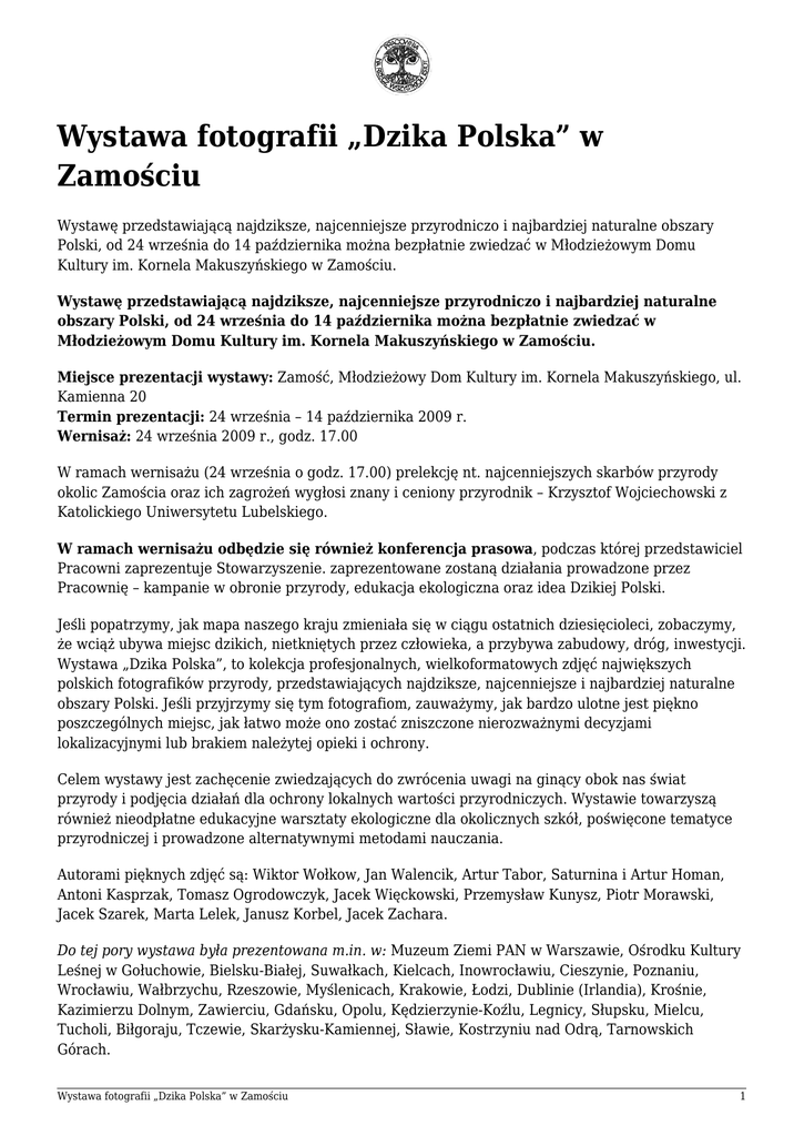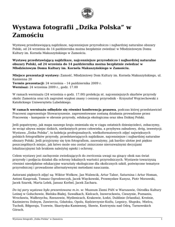 Wystawa fotografii „Dzika Polska” w Zamościu Wystawę przedstawiającą najdziksze, najcenniejsze przyrodniczo i najbardziej naturalne obszary Polski, od 24 września do 14 października można bezpłatnie zwiedzać w Młodzieżowym Domu Kultury im. Kornela Makuszyńskiego w Zamościu. Wystawę przedstawiającą najdziksze, najcenniejsze przyrodniczo i najbardziej naturalne obszary Polski, od 24 września do 14 października można bezpłatnie zwiedzać w Młodzieżowym Domu Kultury im. Kornela Makuszyńskiego w Zamościu. Miejsce prezentacji wystawy: Zamość, Młodzieżowy Dom Kultury im. Kornela Makuszyńskiego, ul. Kamienna 20 Termin prezentacji: 24 września – 14 października 2009 r. Wernisaż: 24 września 2009 r., godz. 17.00 W ramach wernisażu (24 września o godz. 17.00) prelekcję nt. najcenniejszych skarbów przyrody okolic Zamościa oraz ich zagrożeń wygłosi znany i ceniony przyrodnik – Krzysztof Wojciechowski z Katolickiego Uniwersytetu Lubelskiego. W ramach wernisażu odbędzie się również konferencja prasowa, podczas której przedstawiciel Pracowni zaprezentuje Stowarzyszenie. zaprezentowane zostaną działania prowadzone przez Pracownię – kampanie w obronie przyrody, edukacja ekologiczna oraz idea Dzikiej Polski. Jeśli popatrzymy, jak mapa naszego kraju zmieniała się w ciągu ostatnich dziesięcioleci, zobaczymy, że wciąż ubywa miejsc dzikich, nietkniętych przez człowieka, a przybywa zabudowy, dróg, inwestycji. Wystawa „Dzika Polska”, to kolekcja profesjonalnych, wielkoformatowych zdjęć największych polskich fotografików przyrody, przedstawiających najdziksze, najcenniejsze i najbardziej naturalne obszary Polski. Jeśli przyjrzymy się tym fotografiom, zauważymy, jak bardzo ulotne jest piękno poszczególnych miejsc, jak łatwo może ono zostać zniszczone nierozważnymi decyzjami lokalizacyjnymi lub brakiem należytej opieki i ochrony. Celem wystawy jest zachęcenie zwiedzających do zwrócenia uwagi na ginący obok nas świat przyrody i podjęcia działań dla ochrony lokalnych wartości przyrodniczych. Wystawie towarzyszą również nieodpłatne edukacyjne warsztaty ekologiczne dla okolicznych szkół, poświęcone tematyce przyrodniczej i prowadzone alternatywnymi metodami nauczania. Autorami pięknych zdjęć są: Wiktor Wołkow, Jan Walencik, Artur Tabor, Saturnina i Artur Homan, Antoni Kasprzak, Tomasz Ogrodowczyk, Jacek Więckowski, Przemysław Kunysz, Piotr Morawski, Jacek Szarek, Marta Lelek, Janusz Korbel, Jacek Zachara. Do tej pory wystawa była prezentowana m.in. w: Muzeum Ziemi PAN w Warszawie, Ośrodku Kultury Leśnej w Gołuchowie, Bielsku-Białej, Suwałkach, Kielcach, Inowrocławiu, Cieszynie, Poznaniu, Wrocławiu, Wałbrzychu, Rzeszowie, Myślenicach, Krakowie, Łodzi, Dublinie (Irlandia), Krośnie, Kazimierzu Dolnym, Zawierciu, Gdańsku, Opolu, Kędzierzynie-Koźlu, Legnicy, Słupsku, Mielcu, Tucholi, Biłgoraju, Tczewie, Skarżysku-Kamiennej, Sławie, Kostrzyniu nad Odrą, Tarnowskich Górach. Wystawa fotografii „Dzika Polska” w Zamościu 1 Pracownia na rzecz Wszystkich Istot Osoba kontaktowa: Iwona Kukowka ul. Jasna 17, 43-340 Bystra k. Bielska-Białej tel.: 33 817 14 68 e-mail: [email protected] Młodzieżowy Dom Kultury: tel.: 84 638 44 46 Projekt „Szkoły dla przyrody. Poznaję, szanuję, chronię – kampania promująca szkolne projekty ochrony najważniejszych wartości lokalnej przyrody” realizowany obecnie przez Pracownię na rzecz Wszystkich Istot jest współfinansowany ze środków Narodowego Funduszu Ochrony Środowiska i Gospodarki Wodnej. Wystawa fotografii „Dzika Polska” w Zamościu 2
