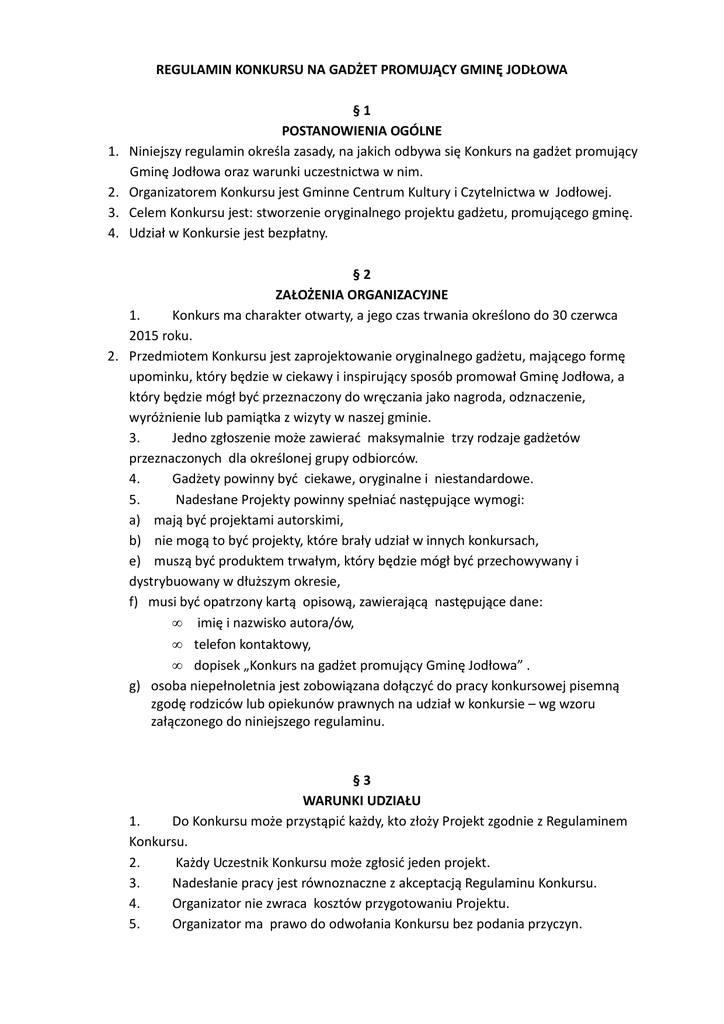 REGULAMIN KONKURSU NA GADŻET PROMUJĄCY GMINĘ JODŁOWA 1. 2. 3. 4. §1 POSTANOWIENIA OGÓLNE Niniejszy regulamin określa zasady, na jakich odbywa się Konkurs na gadżet promujący Gminę Jodłowa oraz warunki uczestnictwa w nim. Organizatorem Konkursu jest Gminne Centrum Kultury i Czytelnictwa w Jodłowej. Celem Konkursu jest: stworzenie oryginalnego projektu gadżetu, promującego gminę. Udział w Konkursie jest bezpłatny. §2 ZAŁOŻENIA ORGANIZACYJNE 1. Konkurs ma charakter otwarty, a jego czas trwania określono do 30 czerwca 2015 roku. 2. Przedmiotem Konkursu jest zaprojektowanie oryginalnego gadżetu, mającego formę upominku, który będzie w ciekawy i inspirujący sposób promował Gminę Jodłowa, a który będzie mógł być przeznaczony do wręczania jako nagroda, odznaczenie, wyróżnienie lub pamiątka z wizyty w naszej gminie. 3. Jedno zgłoszenie może zawierać maksymalnie trzy rodzaje gadżetów przeznaczonych dla określonej grupy odbiorców. 4. Gadżety powinny być ciekawe, oryginalne i niestandardowe. Nadesłane Projekty powinny spełniać następujące wymogi: 5. a) mają być projektami autorskimi, b) nie mogą to być projekty, które brały udział w innych konkursach, e) muszą być produktem trwałym, który będzie mógł być przechowywany i dystrybuowany w dłuższym okresie, f) musi być opatrzony kartą opisową, zawierającą następujące dane: • imię i nazwisko autora/ów, • telefon kontaktowy, • dopisek „Konkurs na gadżet promujący Gminę Jodłowa” . g) osoba niepełnoletnia jest zobowiązana dołączyć do pracy konkursowej pisemną zgodę rodziców lub opiekunów prawnych na udział w konkursie – wg wzoru załączonego do niniejszego regulaminu. §3 WARUNKI UDZIAŁU 1. Do Konkursu może przystąpić każdy, kto złoży Projekt zgodnie z Regulaminem Konkursu. 2. Każdy Uczestnik Konkursu może zgłosić jeden projekt. 3. Nadesłanie pracy jest równoznaczne z akceptacją Regulaminu Konkursu. 4. Organizator nie zwraca kosztów przygotowaniu Projektu. 5. Organizator ma prawo do odwołania Konkursu bez podania przyczyn. 1. 2. 3. 4. 5. 6. 7. 8. 9. 6. Projekty upominków lub gadżetów wraz z kartą opisową należy składać w GCKiCz w Jodłowej do 30 czerwca 2015 r. Uczestnicy Konkursu zobowiązują się do niezgłaszania żadnych roszczeń 7. względem Organizatora z tytułu wykorzystania przez niego Projektów gadżetów lub upominków nadesłanych na konkurs lub z tytułu ich niewykorzystania albo wykorzystania w zakresie promocji gminy. 8. Nadesłane Projekty gadżetów lub upominków pozostają do dyspozycji Organizatora. 9. Projekty niespełniające wymagań, o których mowa w Regulaminie Konkursu lub nadesłane po upływie terminu, o którym mowa w § 3 Regulaminu, nie będą podlegały ocenie Komisji Konkursu. §5 KRYTERIA OCENY Projekty upominków i gadżetów będą oceniane przez Komisję Konkursową w składzie określonym przez Organizatora. Projekty będą oceniane zgodnie z następującymi kryteriami oceny pracy konkursowej: a) zgodność z oczekiwaniami wyrażonymi przez Organizatora Konkursu w § 2 Regulaminu, b) wartości projektowe: oryginalność koncepcji, walory estetyczne, c) wartości marketingowe: łatwość rozpoznania i zapamiętania, d) wartości użytkowe: atrakcyjność formy Zwycięzcy zostaną wyłonieni według następujących kryteriów: zgodność zawartych w Projekcie upominków lub gadżetów z celem Konkursu, wyrazistość przekazu, pomysłowość, forma estetyczna gadżetów, oryginalność pracy itp. Decyzje Komisji Konkursowej zapadają większością głosów. W przypadku równości głosów decyduje głos Przewodniczącego Komisji Konkursowej. Komisja Konkursowa dokona oceny prac oraz podejmie decyzję o przyznaniu nagrody do 15 lipca 2015 r. Decyzja Komisji Konkursowej jest ostateczna i nie podlega zaskarżeniu. Z rozstrzygnięcia Konkursu zostanie sporządzony protokół, który podpisują członkowie Komisji Konkursowej uczestniczący w posiedzeniu. Laureaci Konkursu zostaną powiadomieni telefonicznie lub pisemnie o wynikach konkursu oraz lista nagrodzonych prac zostanie umieszczona na stronie internetowej Gminy Jodłowa – www.jodlowa.eu Uroczyste wręczenie nagród nastąpi podczas Gminnych Dożynek w dniu 16 sierpnia 2015 r. §6 NAGRODY 1. W konkursie zostaną przyznane nagrody pieniężne I miejsce – 500 zł II miejsce – 300 zł III miejsce – 200 zł 2. W przypadku osób niepełnoletnich prawo do odbioru nagrody pieniężnej posiada rodzic/opiekun prawny. W uzasadnionych przypadkach Organizator zastrzega sobie możliwość innego 3. podziału nagród lub nieprzyznania nagrody w ogóle. §7 OŚWIADCZENIA O PRAWACH AUTORSKICH 1. Uczestnicy Konkursu, przekazują Organizatorowi całość praw majątkowych uprawniających do zarządzania Projektami – przekazaną pracą. Organizator zastrzega sobie prawo do przekazania pracy osobom trzecim oraz do ich całościowej lub częściowej prezentacji, na wszystkich polach eksploatacji, w tym m.in. do: a) wyłącznego używania i wykorzystania prac konkursowych we wszelkiej działalności promocyjnej, reklamowej, informacyjnej b) utrwalania i zwielokrotniania prac konkursowych wszelkimi możliwymi technikami , c) zwielokrotniania poprzez dokonywanie zapisu prac konkursowych na nośnikach elektronicznych, d) swobodnego dysponowania nabytymi pracami konkursowymi, e) publicznego wystawiania i wyświetlania prac konkursowych na wszelkich imprezach otwartych i zamkniętych, f) wydawania i rozpowszechniania wszelkich materiałów promocyjnych, informacyjnych, wydawniczych i innych z wykorzystaniem prac konkursowych, g) wprowadzania do pamięci komputera i umieszczenia zdjęć prac konkursowych w Internecie, h) wykorzystania upominków i gadżetów i ich modyfikacji oraz adaptacji we wszelakiego rodzaju dostępnych formach oraz akcesoriach reklamowych i promocyjnych. 2. Uczestnik Konkursu składa oświadczenie, że posiada autorskie prawa mają